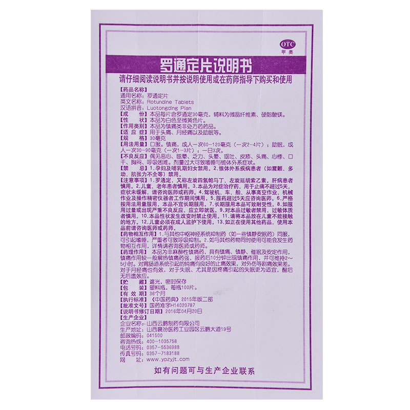 云鹏罗通定片30mg*100片/盒月经痛以及助眠痛经风寒感冒头痛失眠