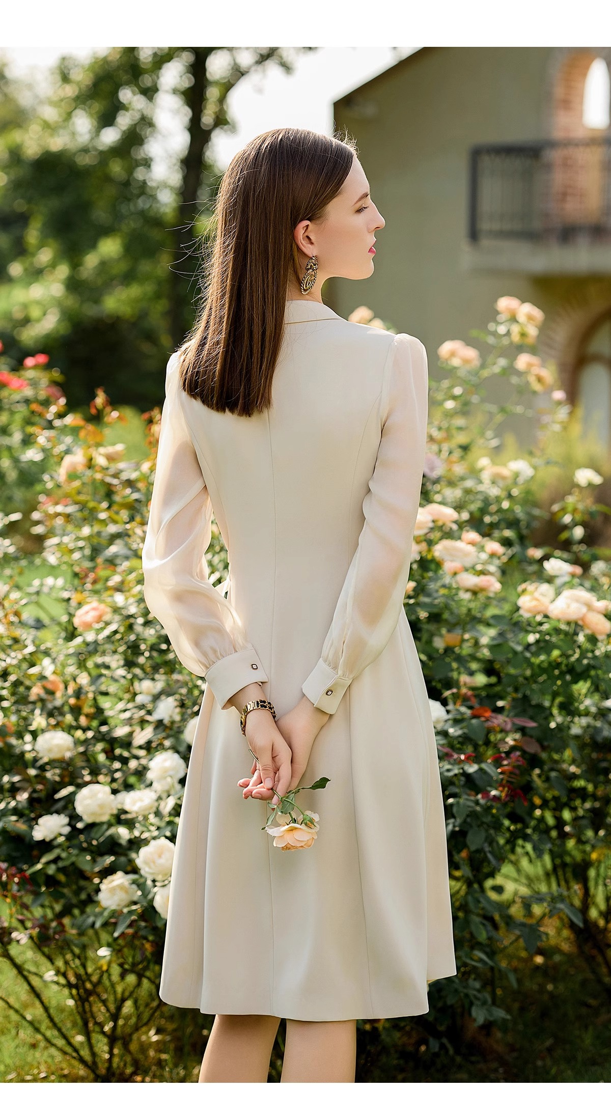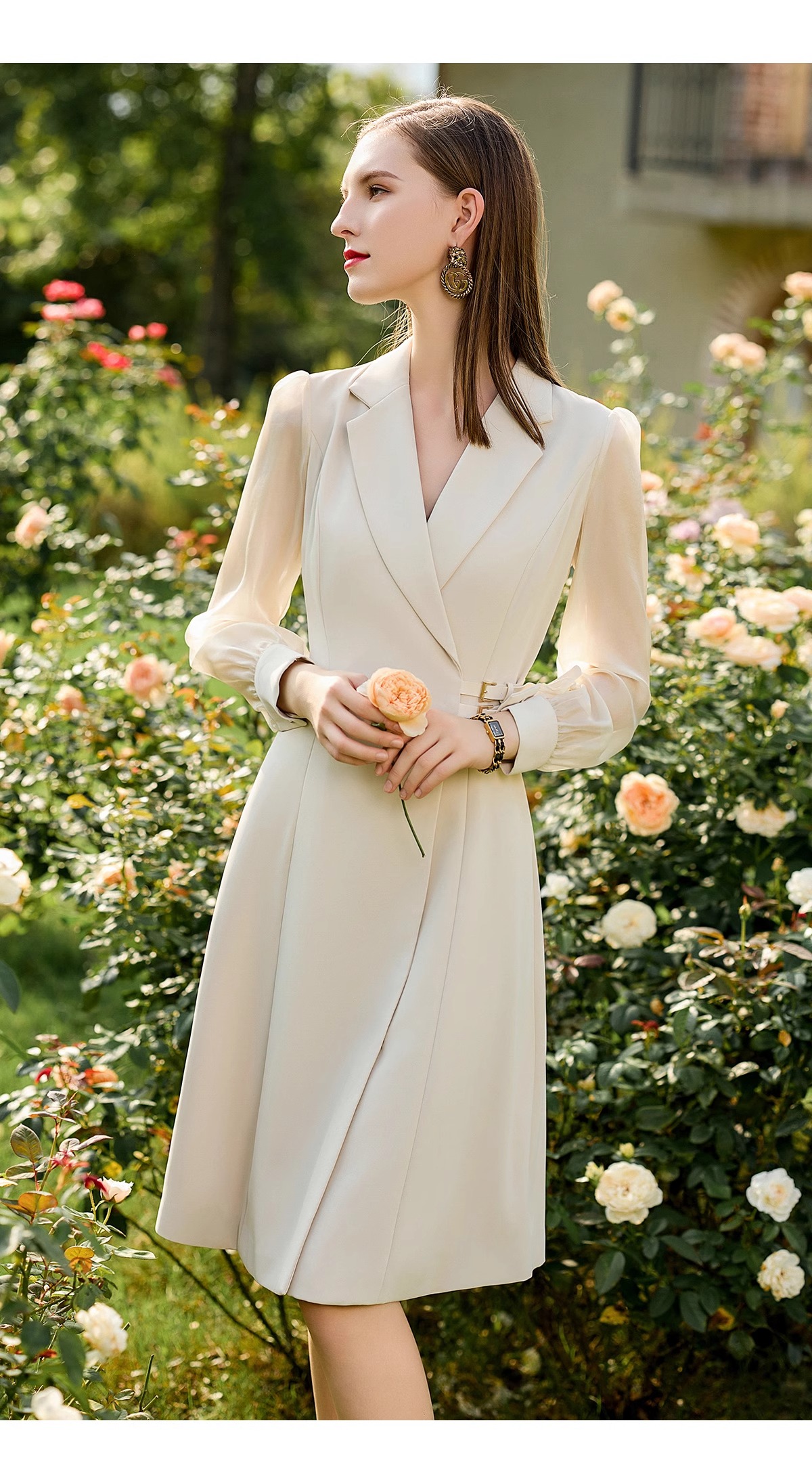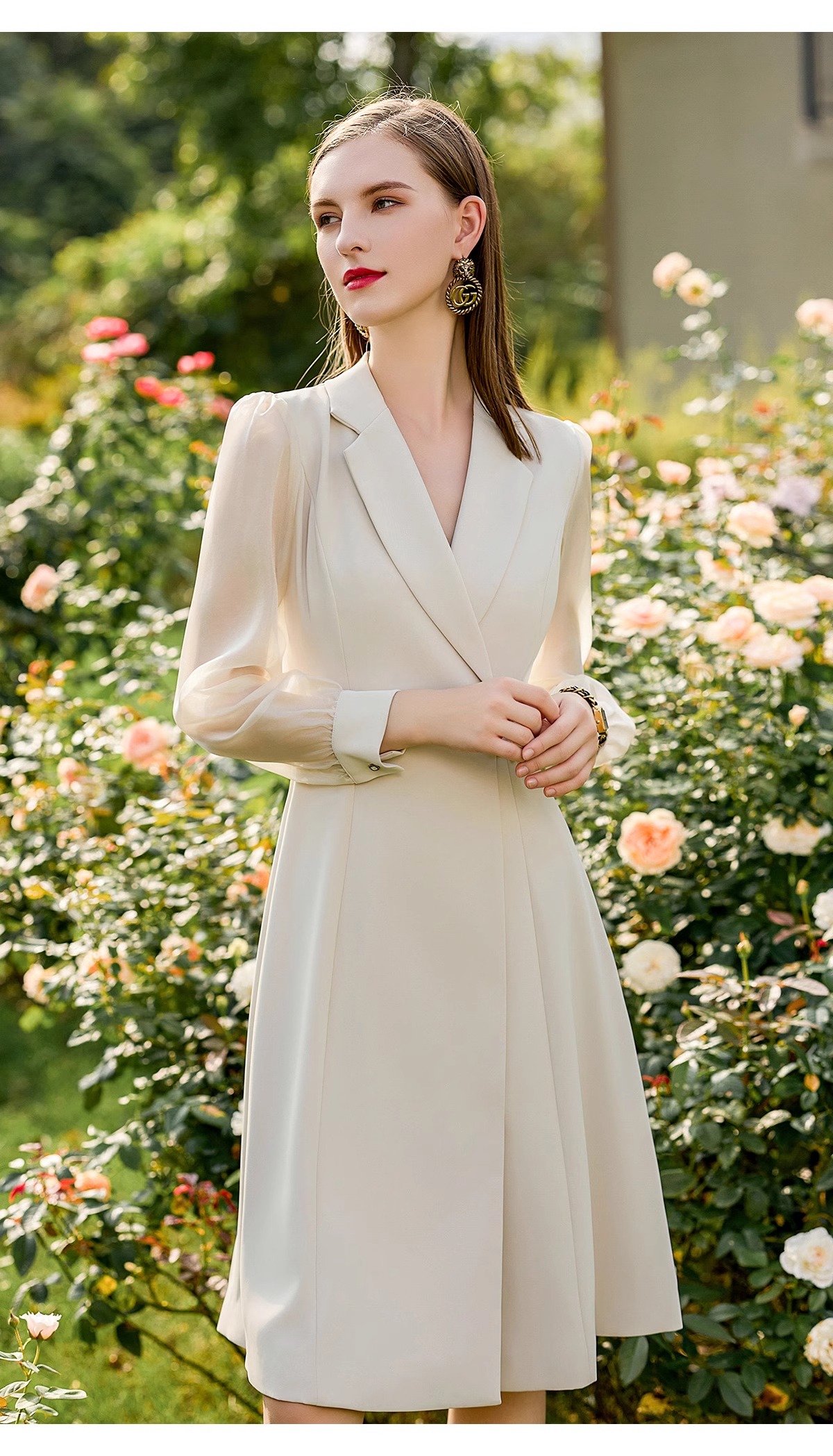 新中式女装2024新款气质连衣裙网纱透视长袖接拼西装连身裙伞裙