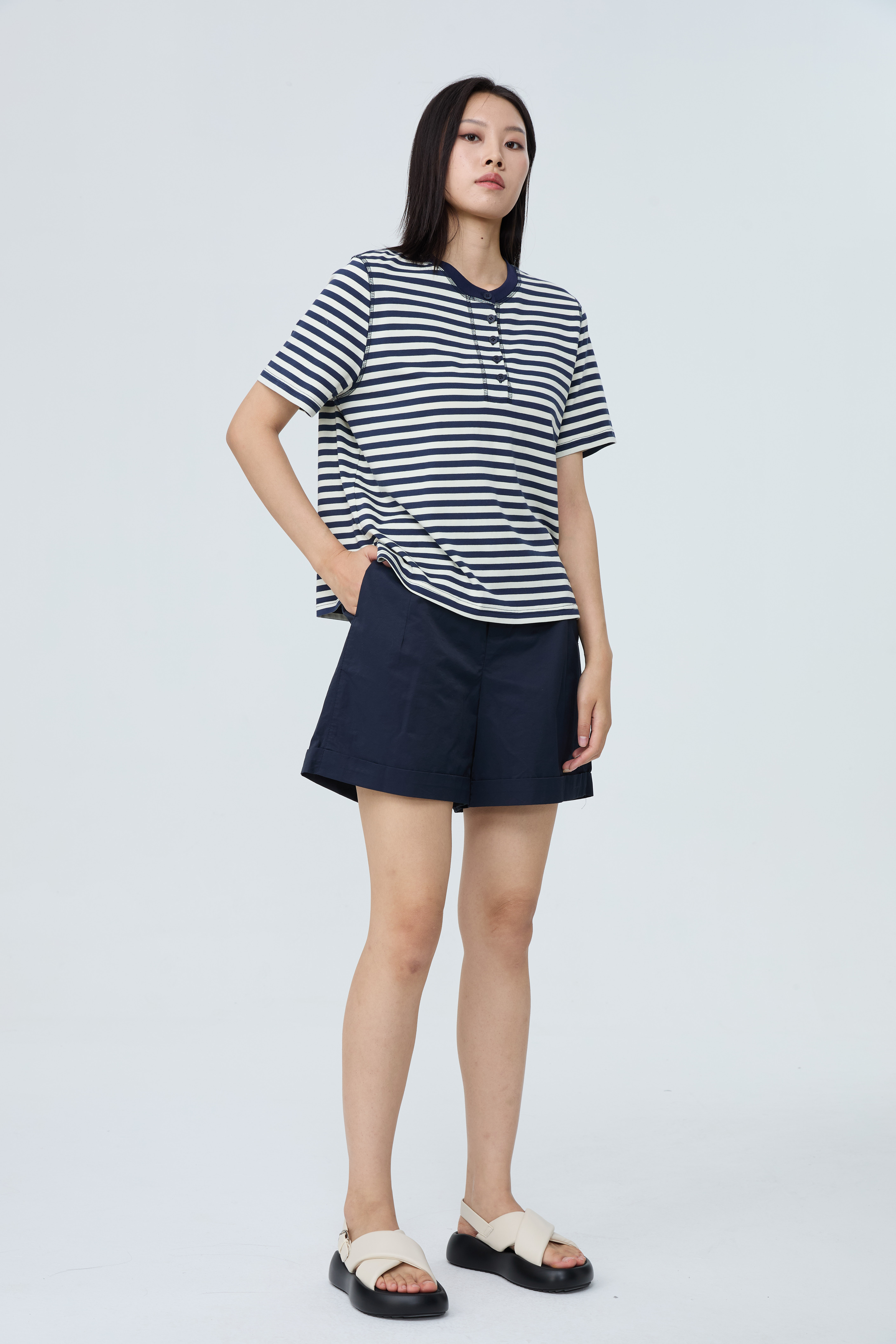 水淼2026夏爆款休闲百搭显瘦条纹半门襟T恤2350