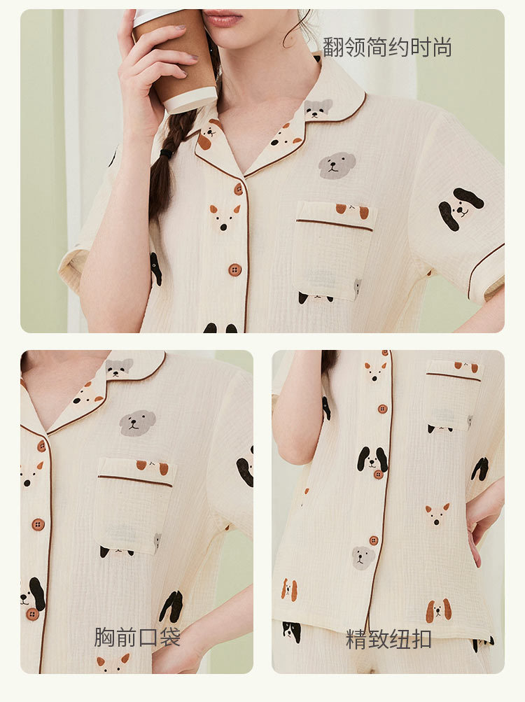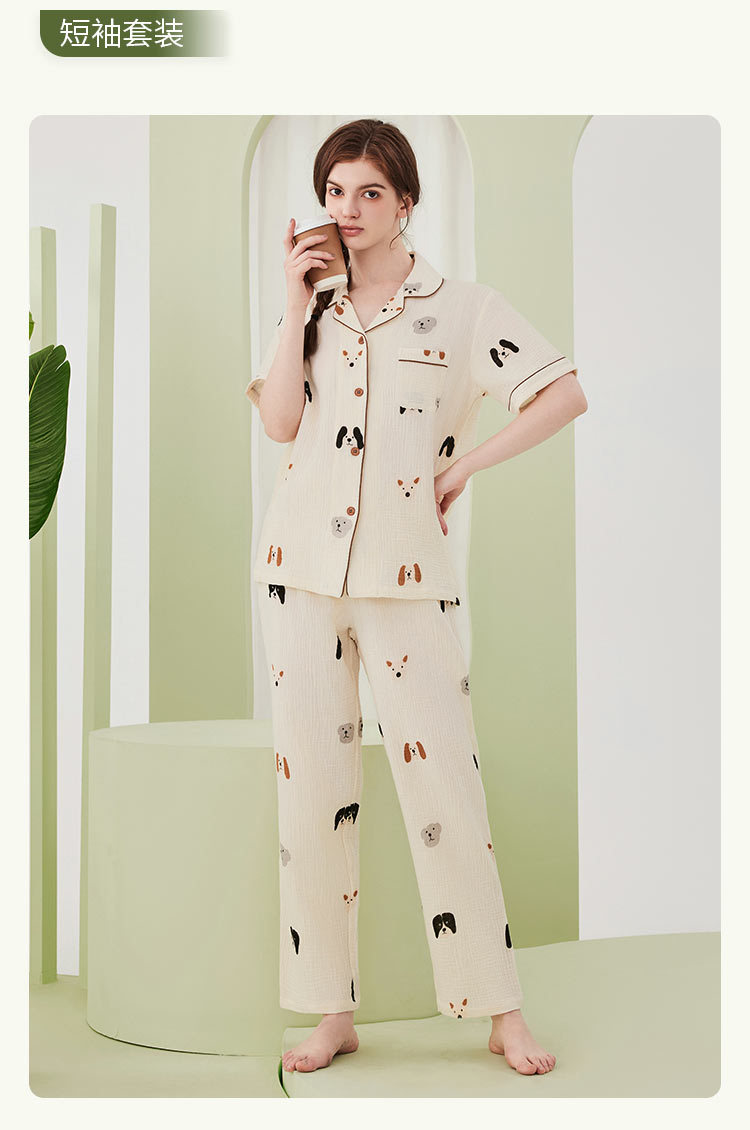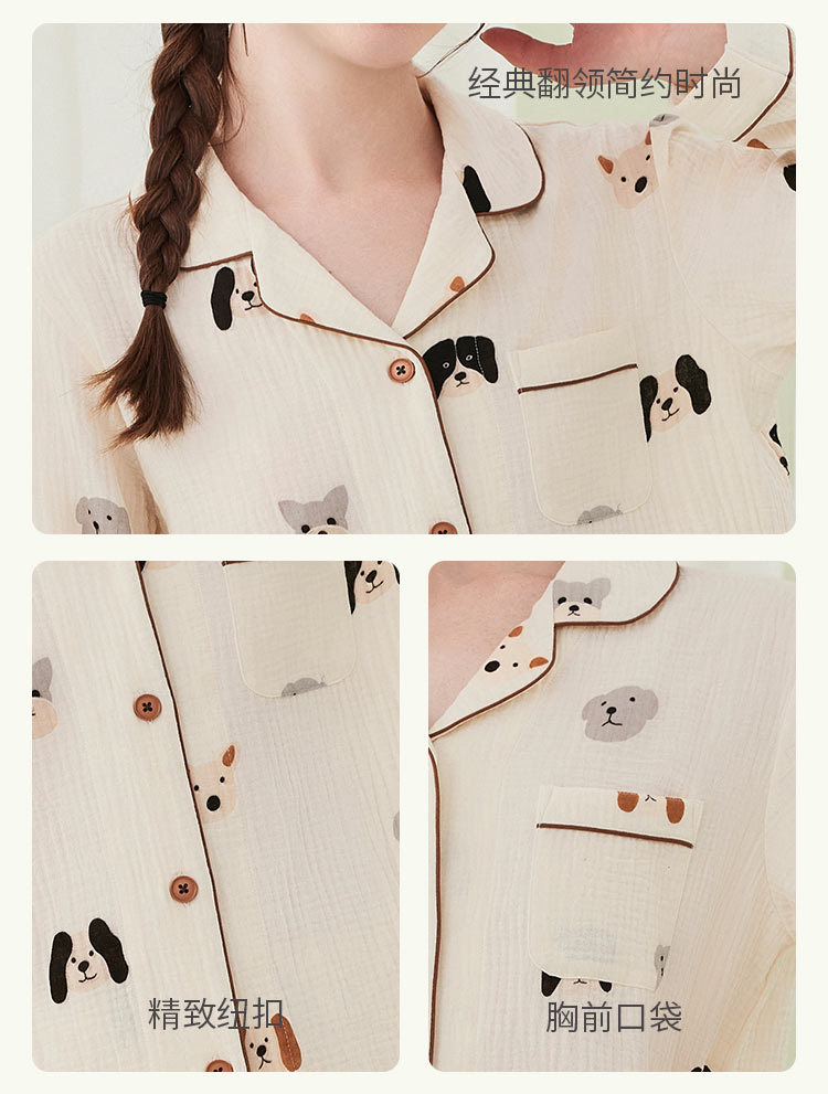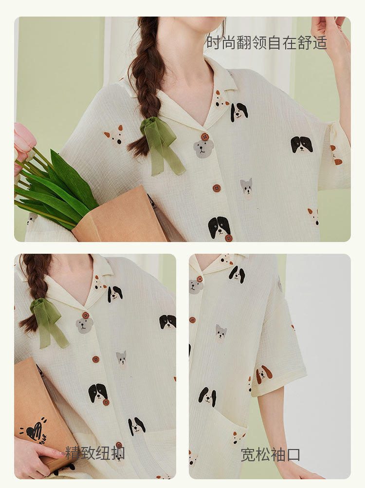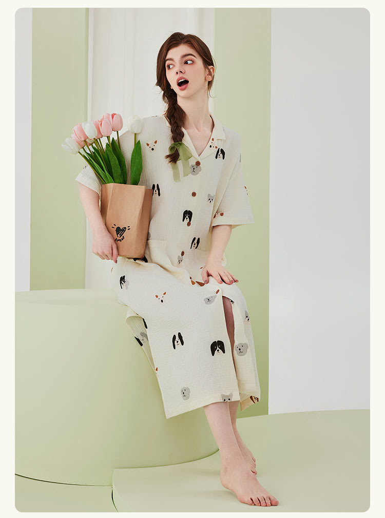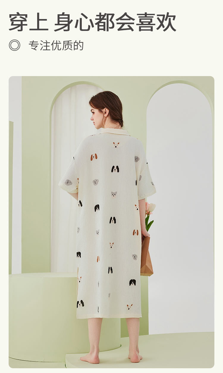 A类纯棉睡衣裙女夏季双层绉布可爱萌狗印花全棉睡衣家居服可外穿