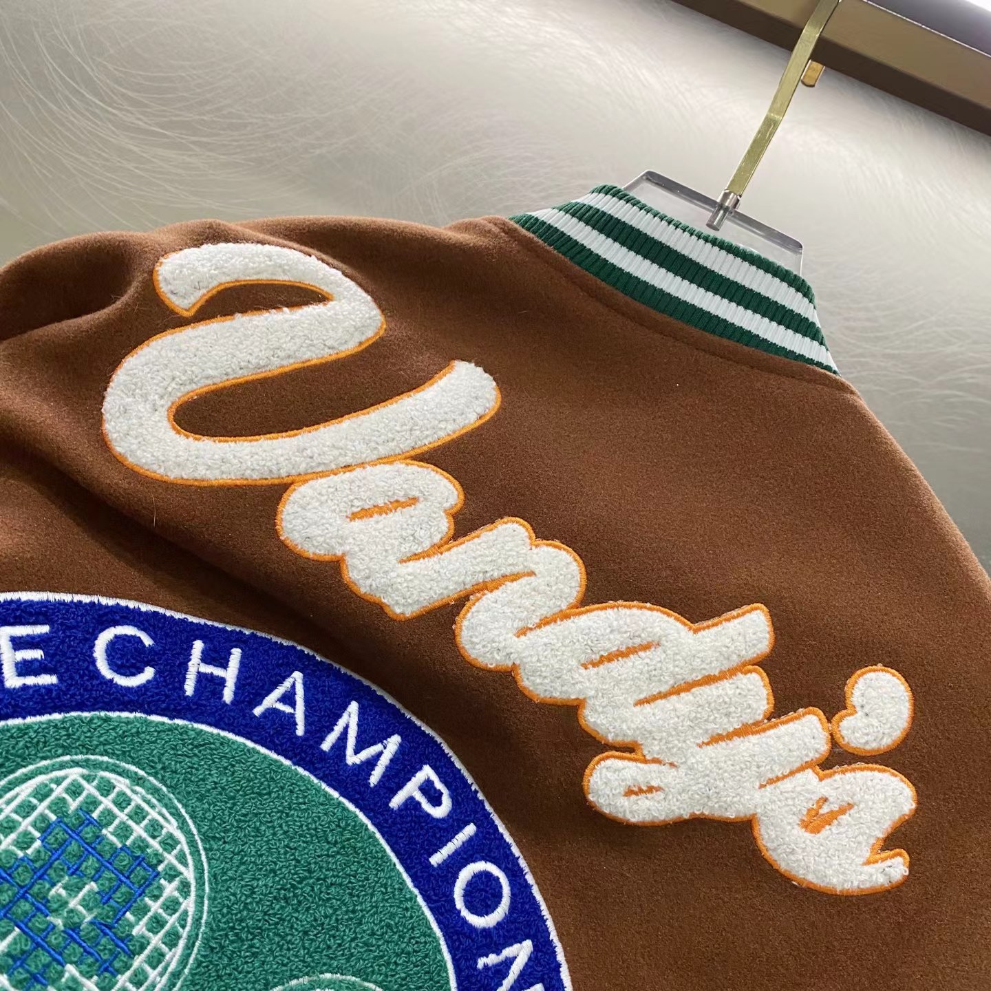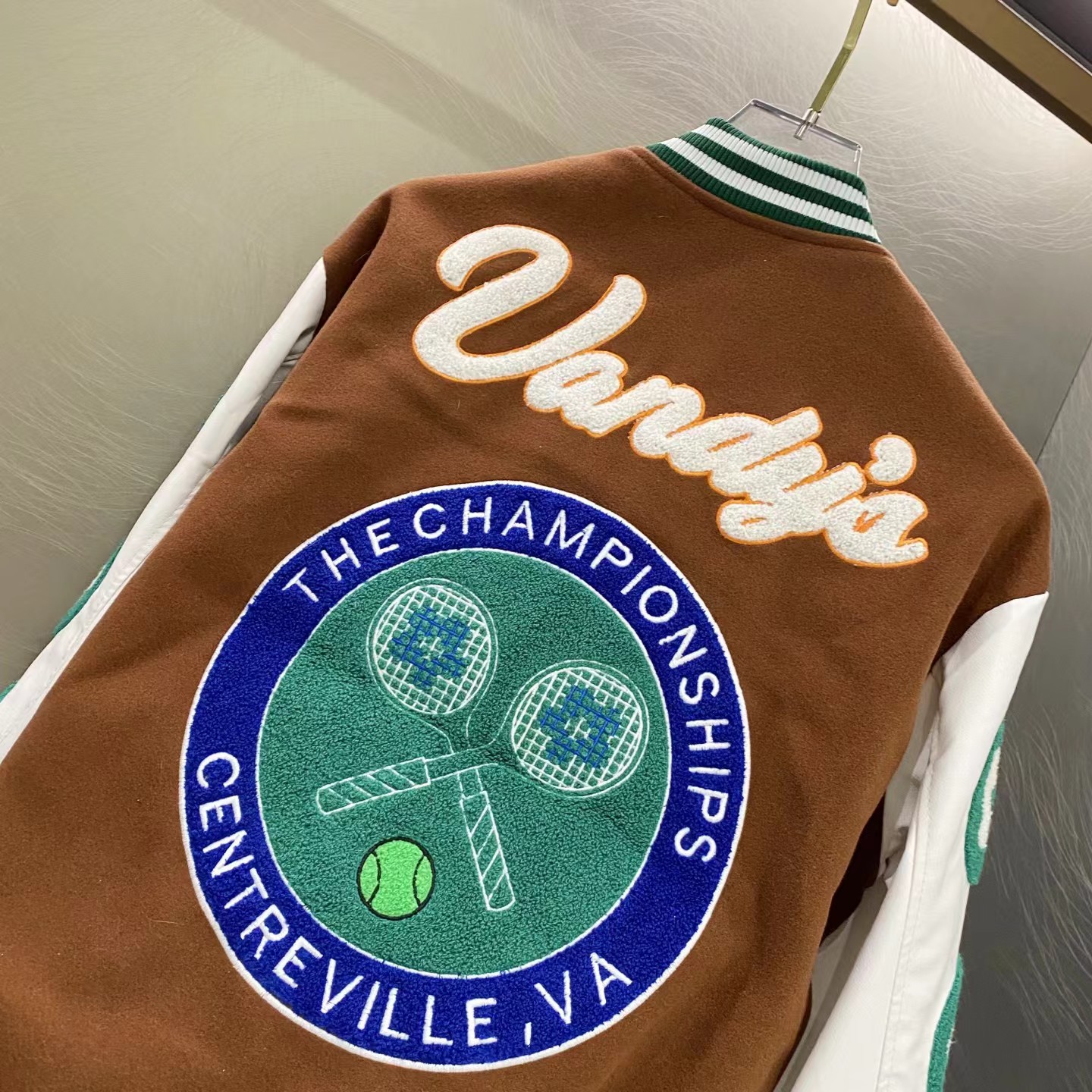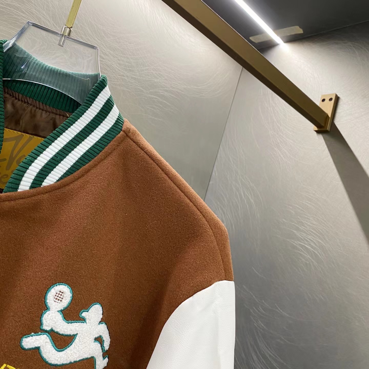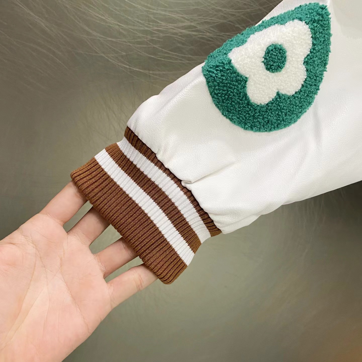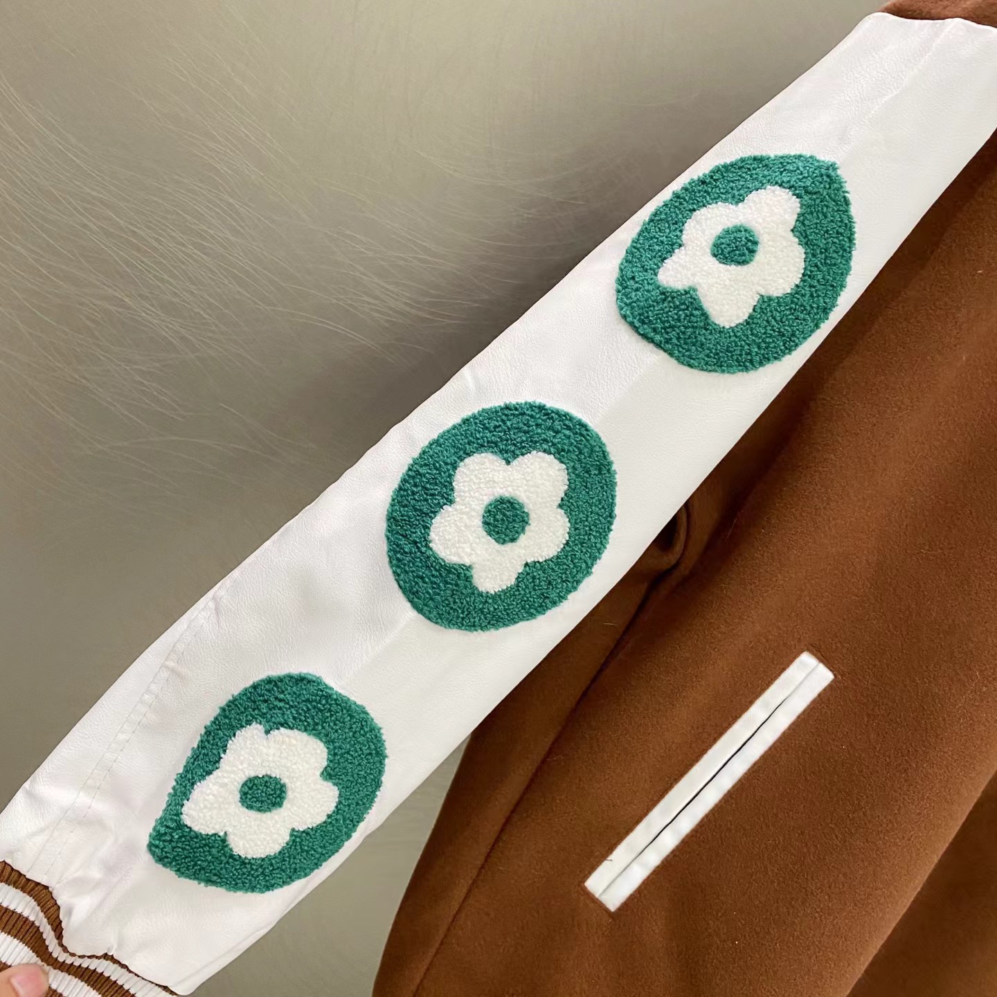 网球校队撞色拼接棒球服夹克外套,朴宰范同款棒球服大体面料定做700G毛呢面料,行线里布也选用高密的。市面拿到手容易崩线,我们这个扯不烂,走线缜密细致 。这款的皮袖为PU皮并非真皮,但是舒适感增加非常多,有过蜡质感,纹路细腻且柔软。全套日产纽扣客供,钢印LOGO,非常有质感~五金质感没话说,前后刺绣LOGO,非常精细