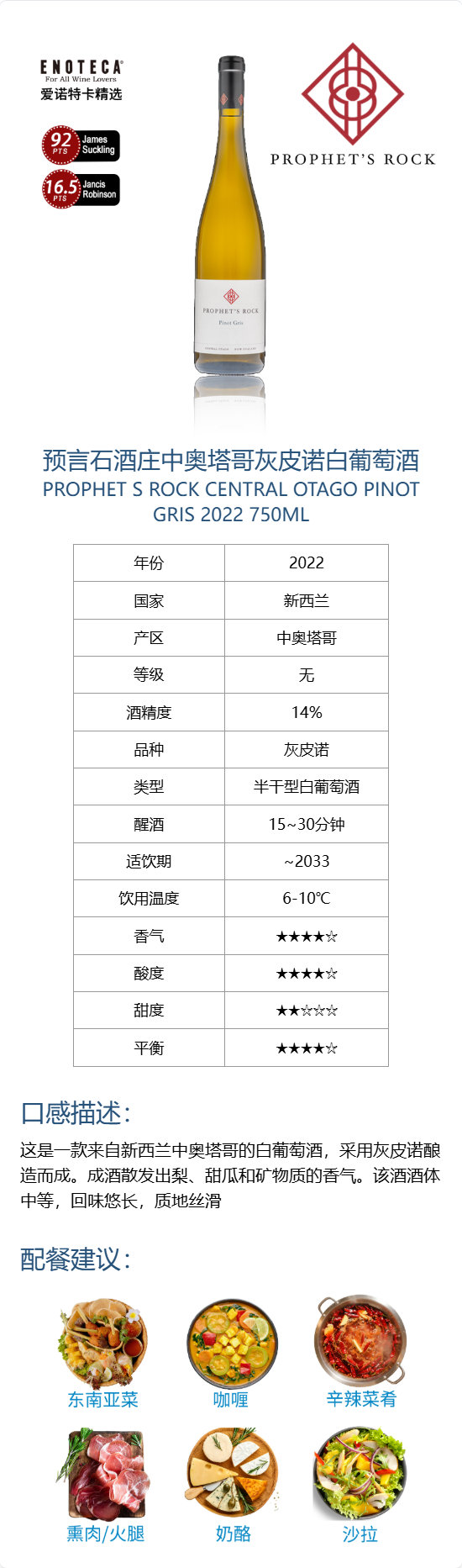 【金奖浓郁芳香灰皮诺】Prophet S Rock Central Otago Pinot Gris 2022 750Ml 预言石酒庄中奥塔哥灰皮诺白葡萄酒