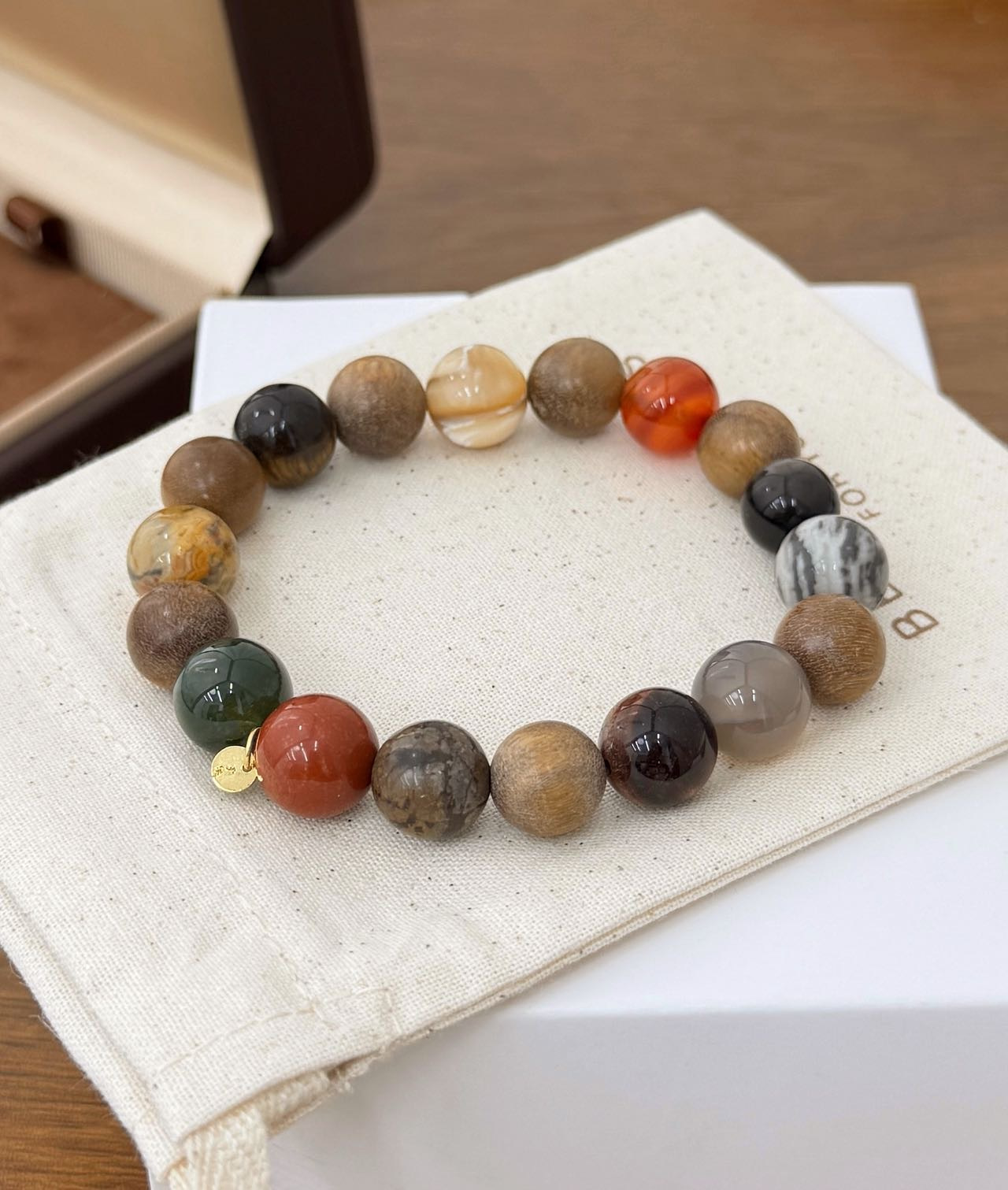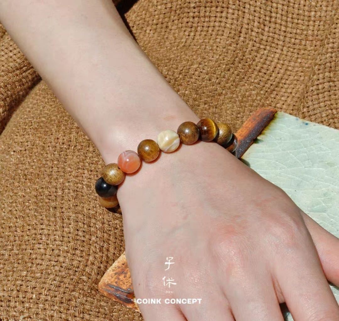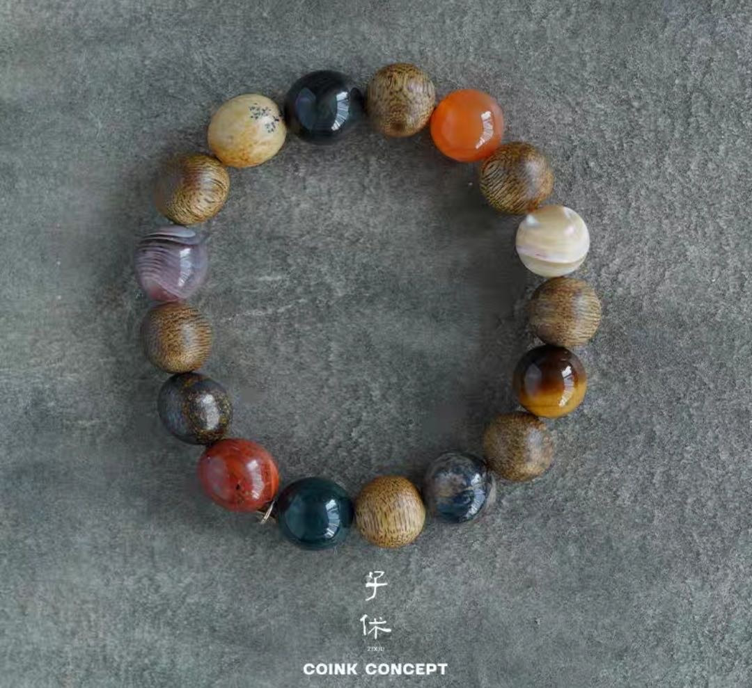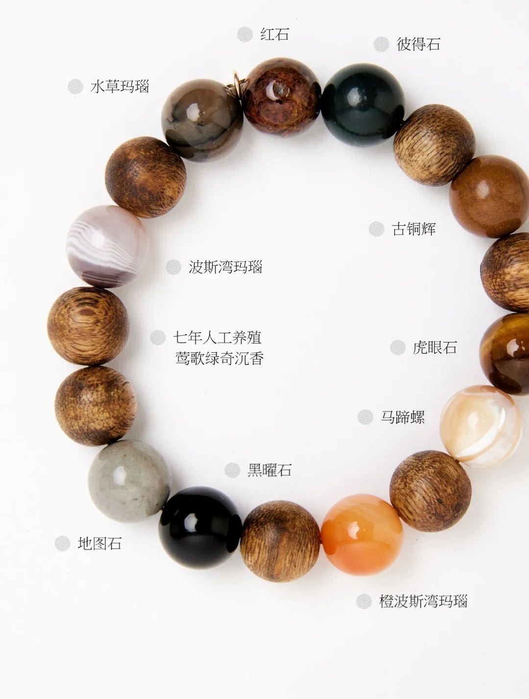 这款手串以沉香为基底,结合虎眼石、黑曜石、红石、马蹄骡、彼得石、波斯湾玛瑙等多重天然宝石,每一颗都经过人工仔细挑选,手工串成。