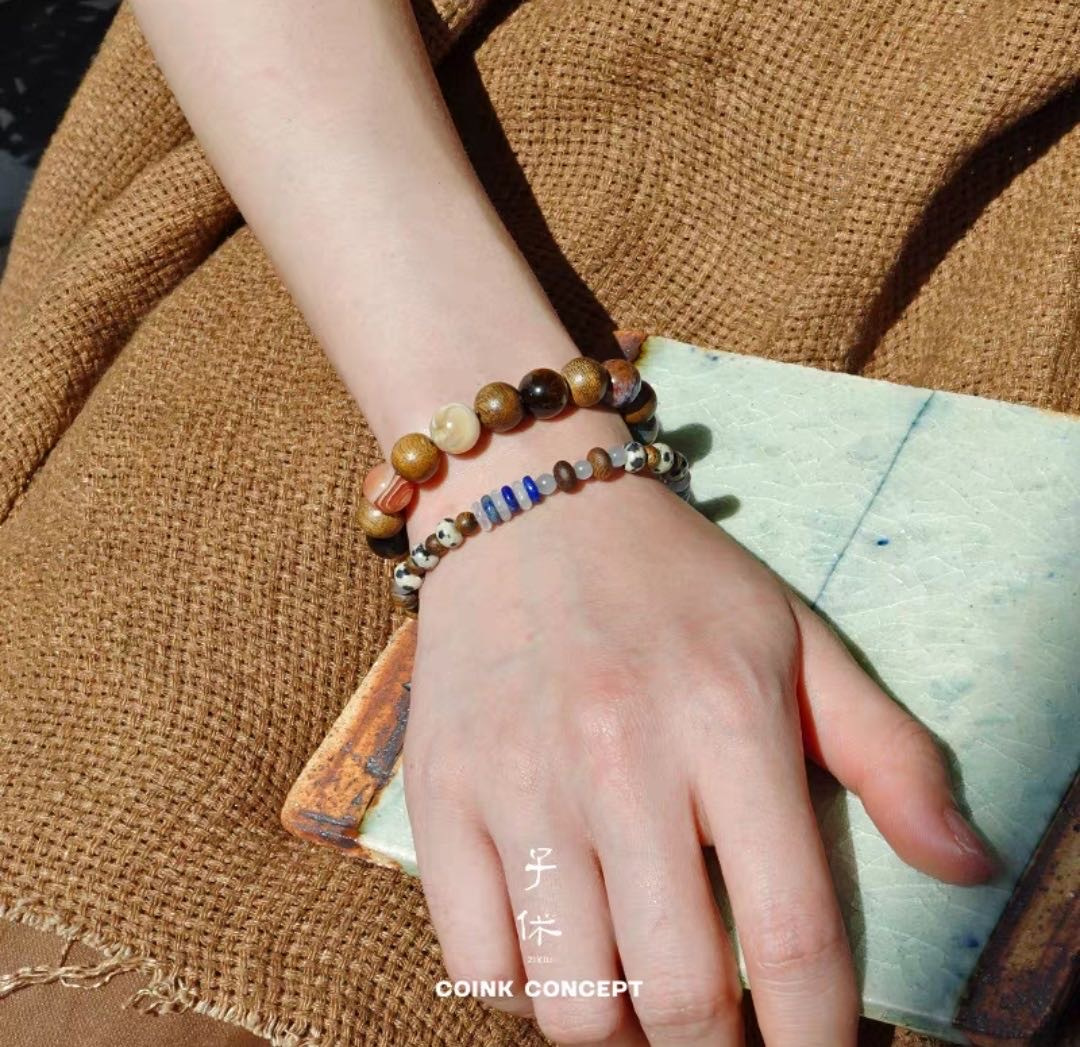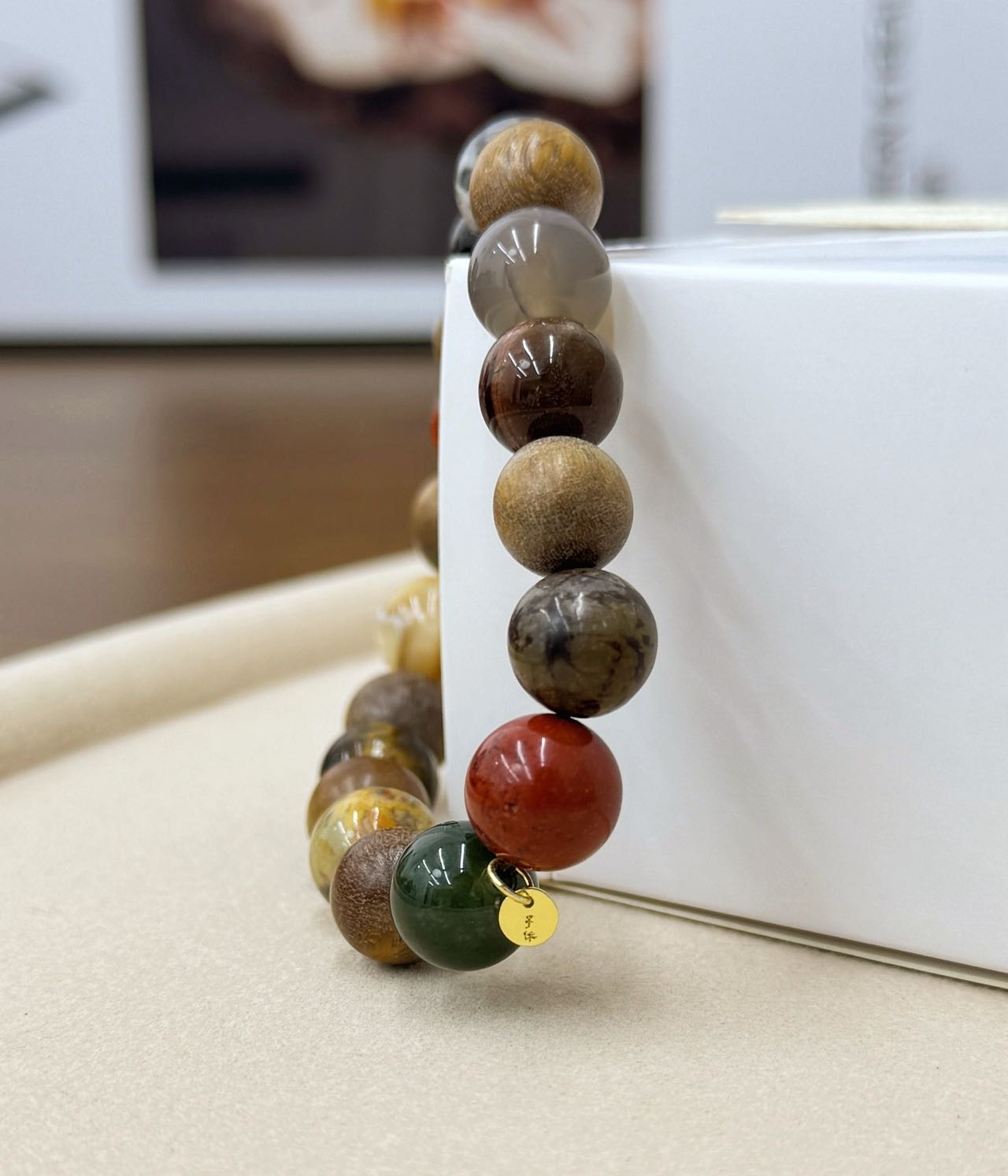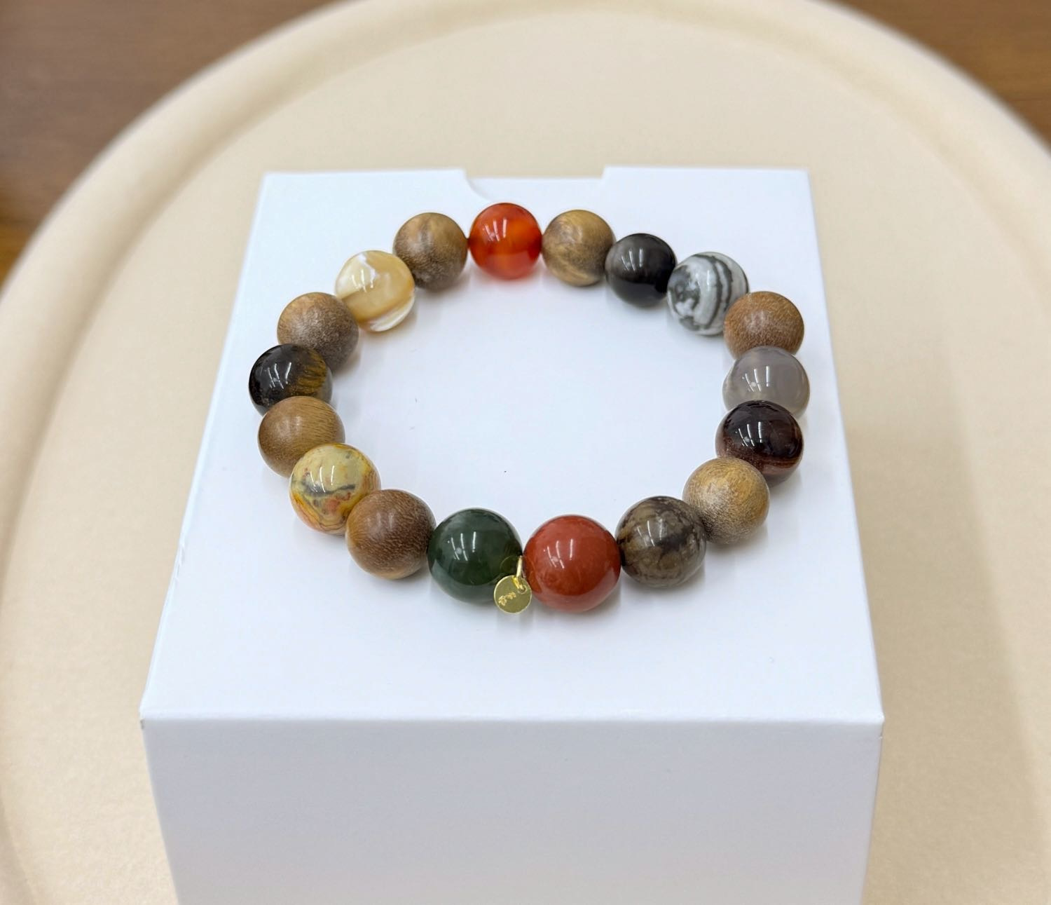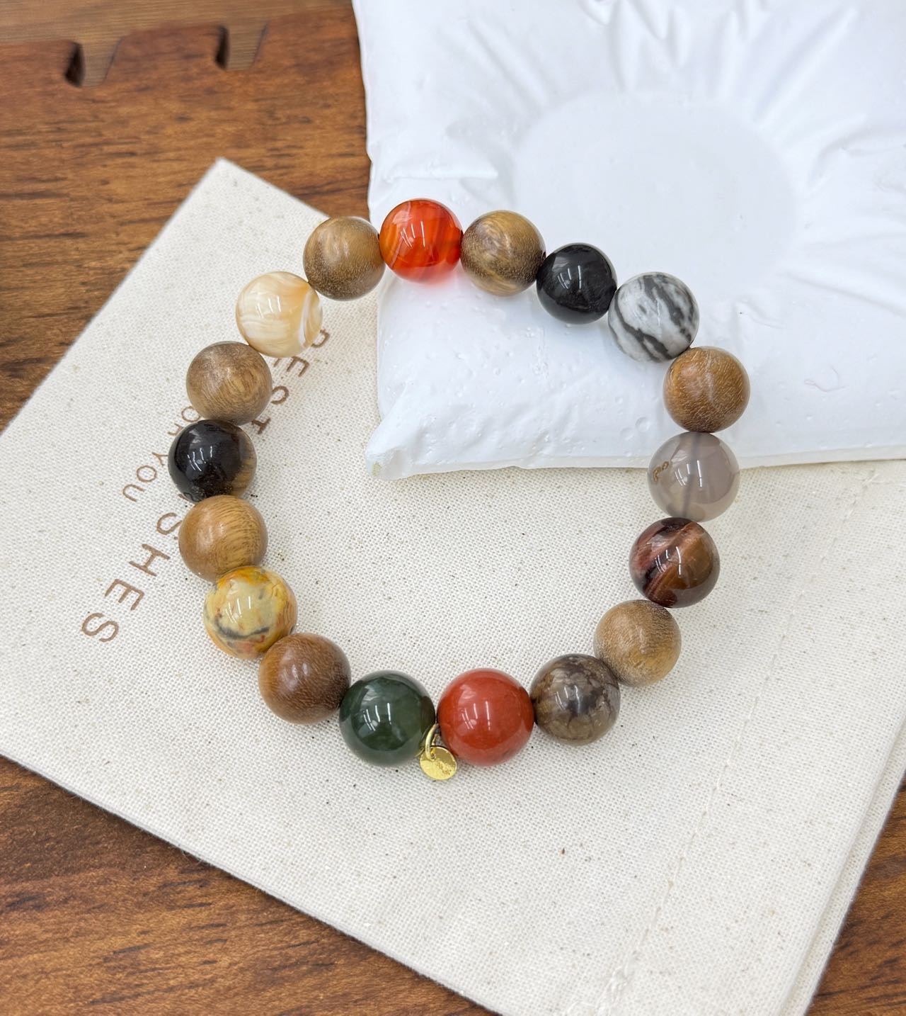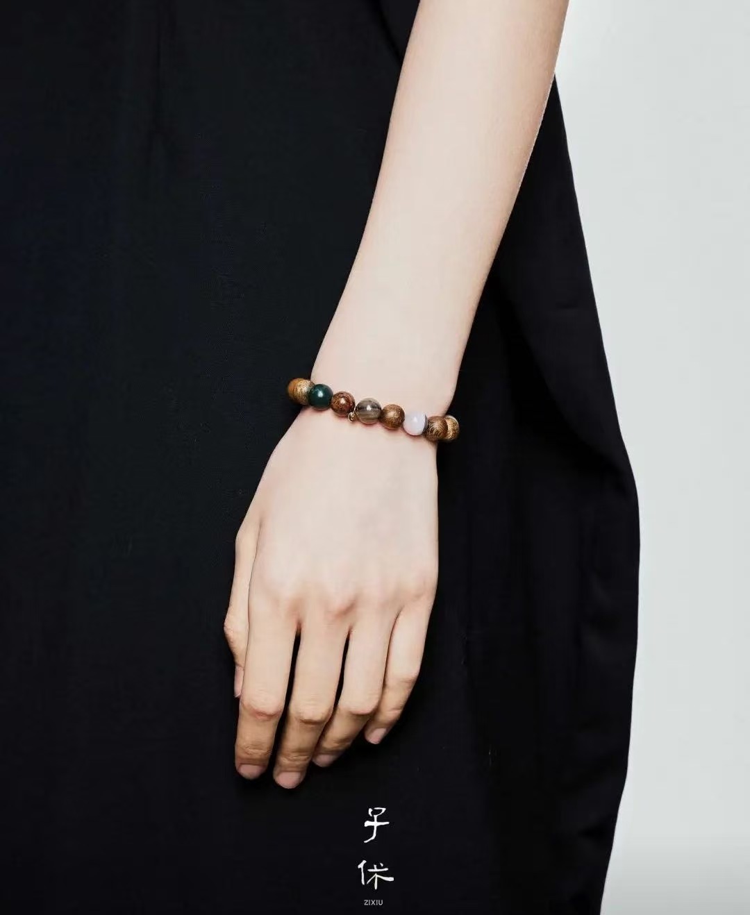 这款手串以沉香为基底,结合虎眼石、黑曜石、红石、马蹄骡、彼得石、波斯湾玛瑙等多重天然宝石,每一颗都经过人工仔细挑选,手工串成。