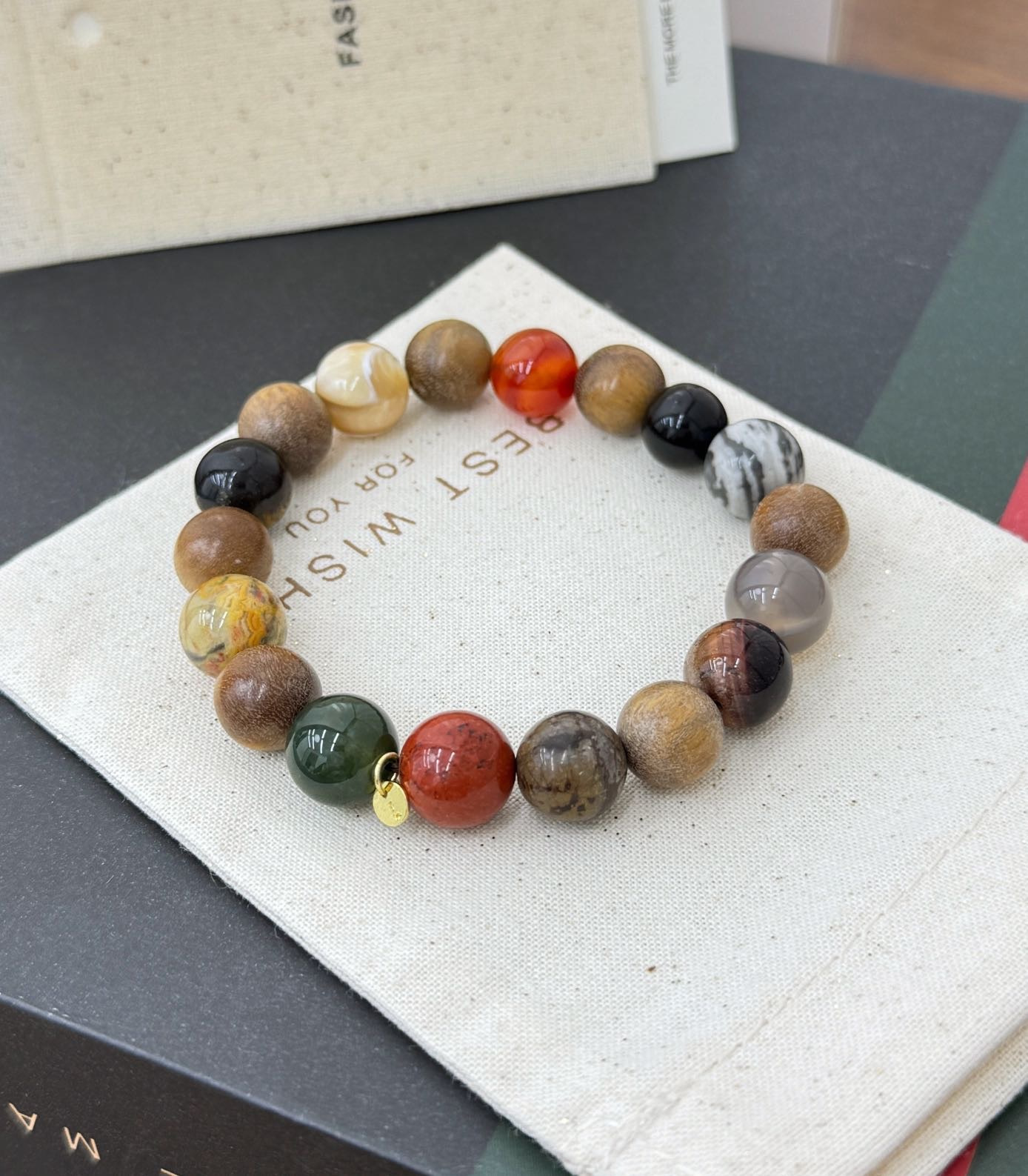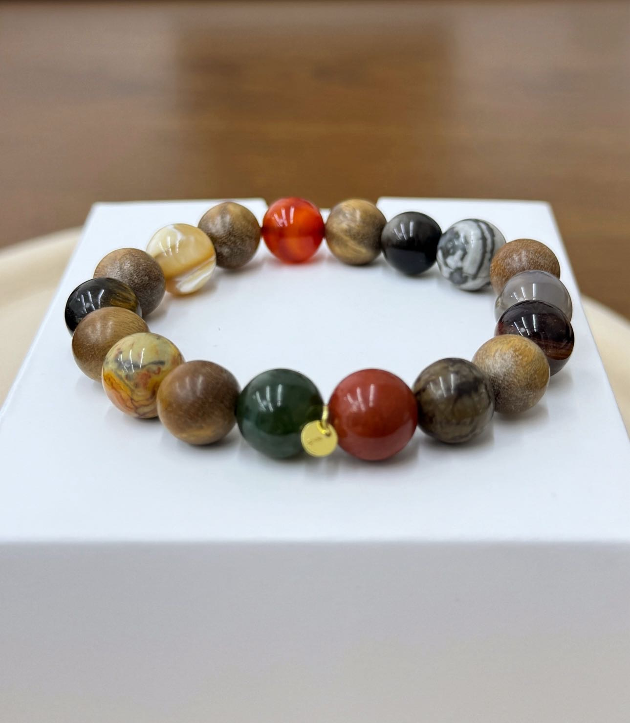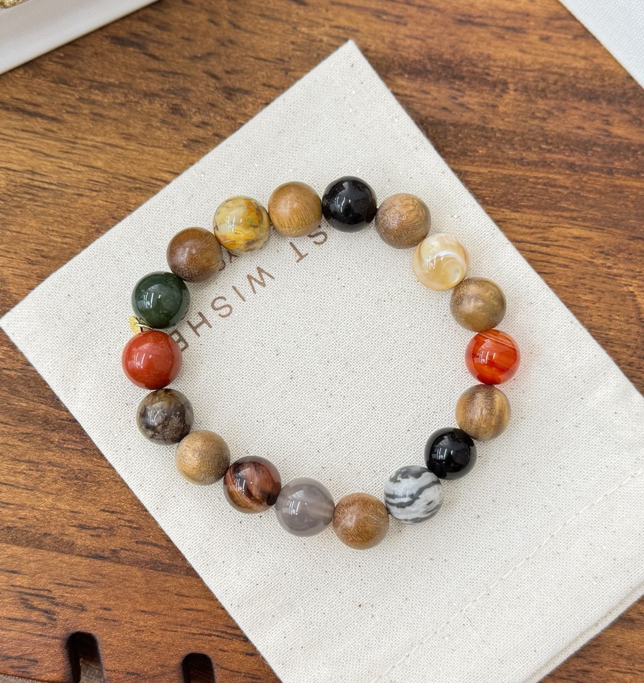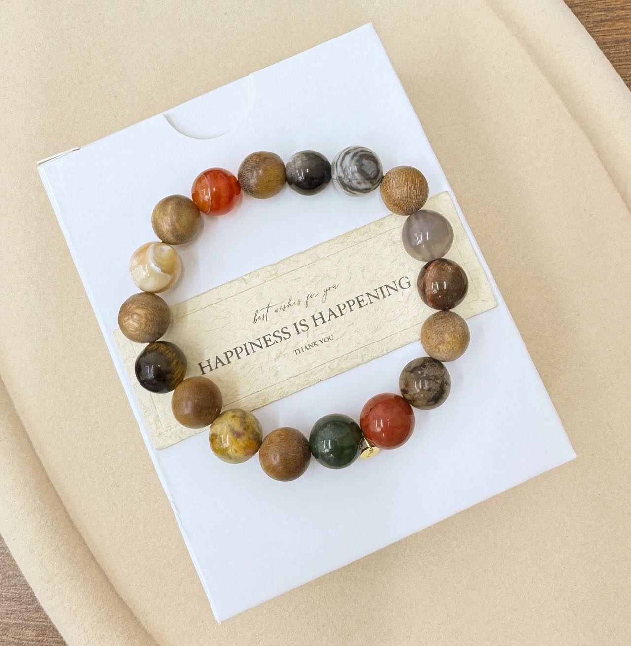 这款手串以沉香为基底,结合虎眼石、黑曜石、红石、马蹄骡、彼得石、波斯湾玛瑙等多重天然宝石,每一颗都经过人工仔细挑选,手工串成。