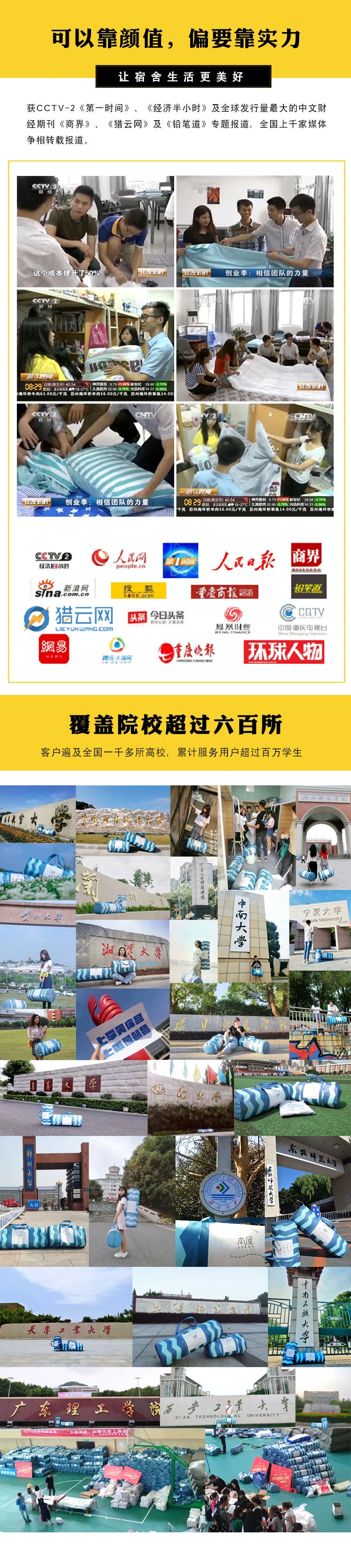 成立于2014年,2次被央视专题报道,从为中国大学生提供一套好床品开始,重新定义校园宿舍品质生活。以"纯棉舒适、安全环保、现代简约"为设计原点,还构建校园成长生态,为大学生提供实习机会。