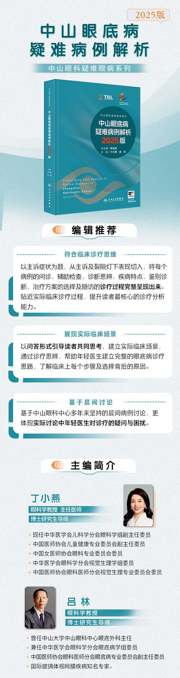 丁小燕:眼科学教授、主任医师、博士研究生导师。现任中华医学会儿科学分会眼科学组副主任委员、中国医师协会儿童健康专业委员会副主任委员、中国女医师协会眼科专业委员会委员、中华医学会眼科学分会视觉生理学组委员、中国医师协会眼科医师分会视觉生理专业委员会委员吕林:眼科学教授、博士研究生导师,曾任中山大学中山眼科中心眼底外科主任。兼任中华医学会眼科学分会眼底病学组委员、中国医师协会眼科医师分会眼底病专业委员会副主任委员,国际玻璃体视网膜疾病知名专家。