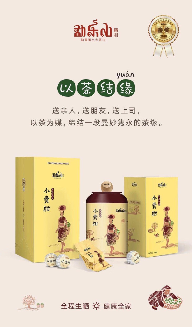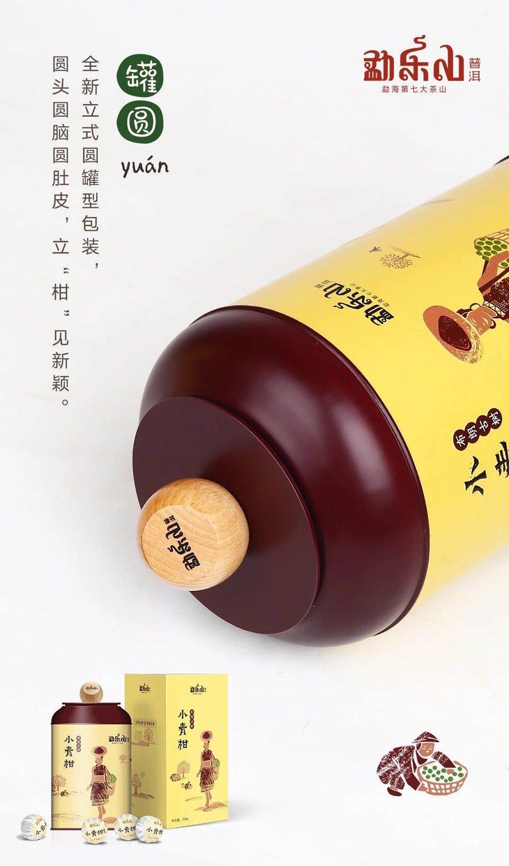 假如我们用相同的力度去挤压一个相同材质的方形器皿和圆形器皿,会发现易变形的是方形的器皿,因为圆形的弧线具有将力量分散的作用。勐乐山2018年布朗古树小青柑的包装,正是采用简单而坚固的圆形结构,从头开始一圆到底,罐顶还有一颗“开盖小青柑”亭亭玉立,立柑见新颖,十分别致。