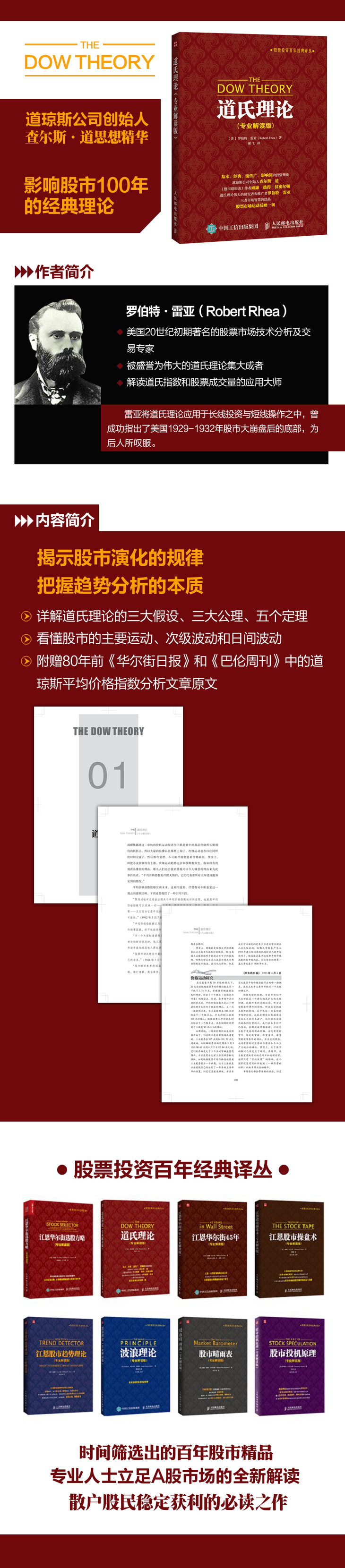 罗伯特·雷亚(Robert Rhea), 美国20世纪初期著名的股票市场技术分析及交易专家,被盛誉为伟大的道氏理论集大成者,解读道氏指数和股票成交量的应用大师。雷亚为人谦逊,受人尊敬,在生命的最后十年,雷亚身受疾病袭扰。长期卧床,可依旧坚持股票交易。直到1939年辞世。 雷亚将道氏理论应用于长线投资与短线操作之中,曾成功指出了美国1929-1932年股市大崩盘后的底部,为后人所叹服。在他真正掌握道氏理论之后,并未完全用于自己操作,而是将自己的理解和认识写下来,与大众分享,如今《道氏理论》成为了经典投资指南。