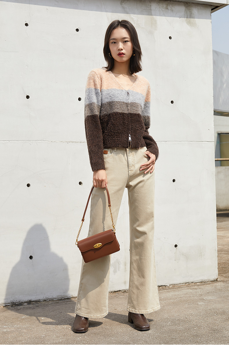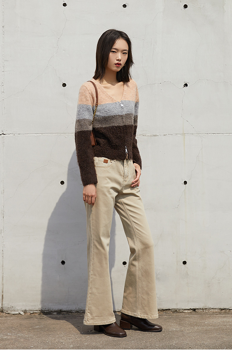 轻甜松弛感 粉棕灰渐变条纹 V 领拉链开衫 软糯毛绒质感短款针织外套