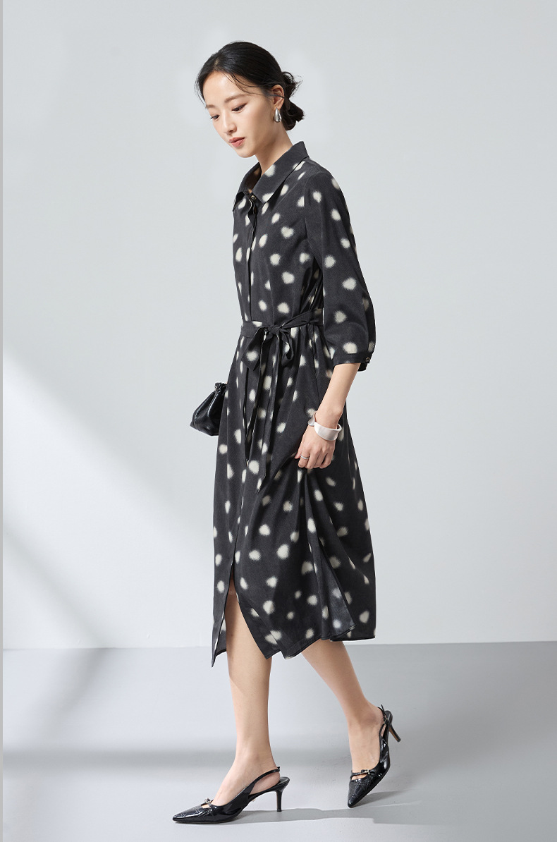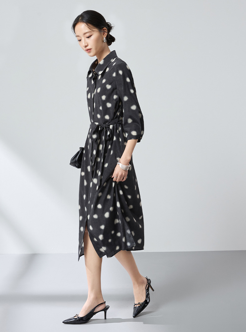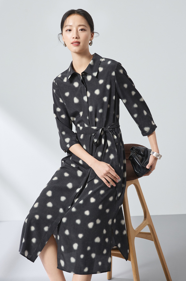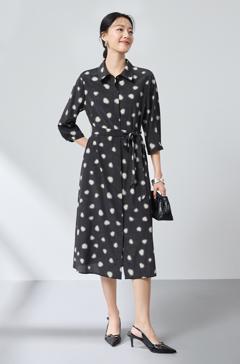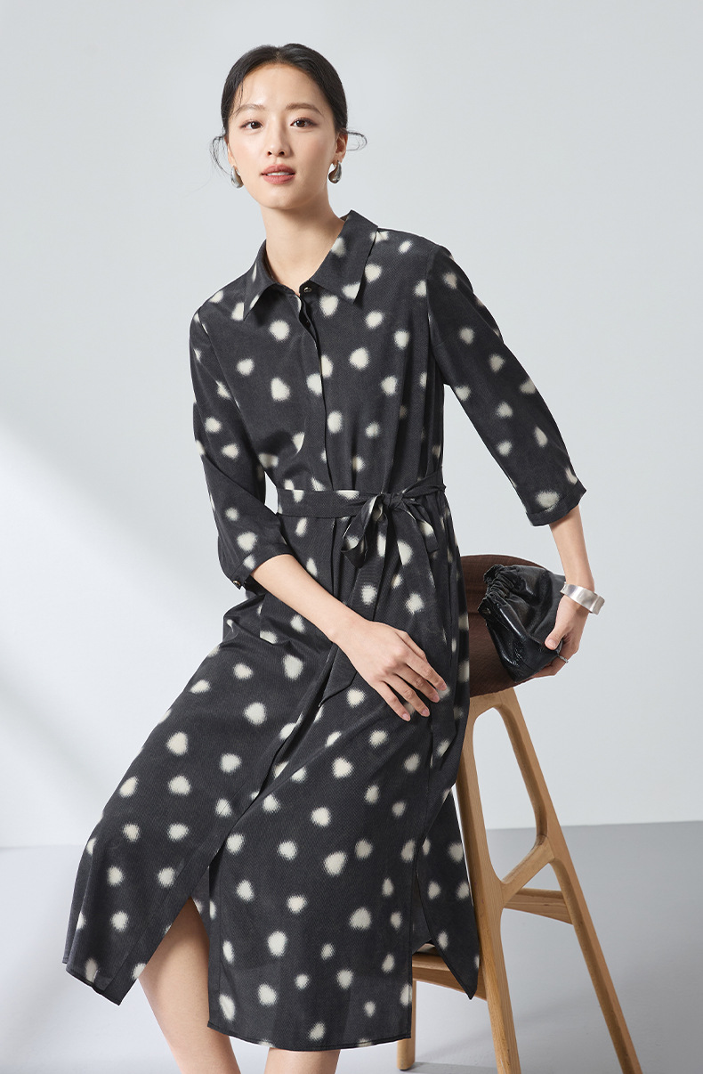 QS桑蚕丝法式连衣裙真丝26春气质翻领心型印花收腰裙气质2609