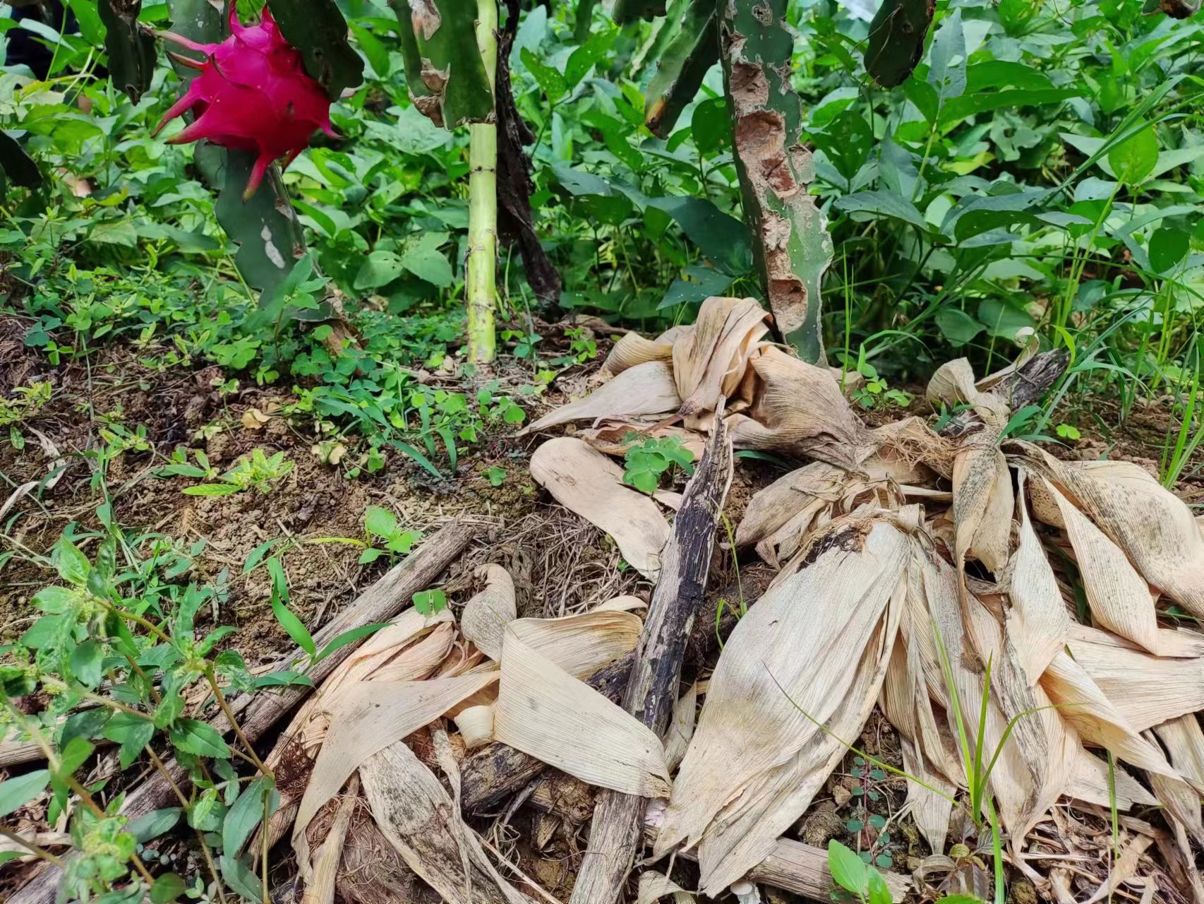 不用除草剂、农膜的火龙果地可谓“杂草丛生”,玉大哥会有目的地留草、养草、控草,维持果园的生态环境的平衡。垄间套种黄豆,垄面用秸秆覆盖。