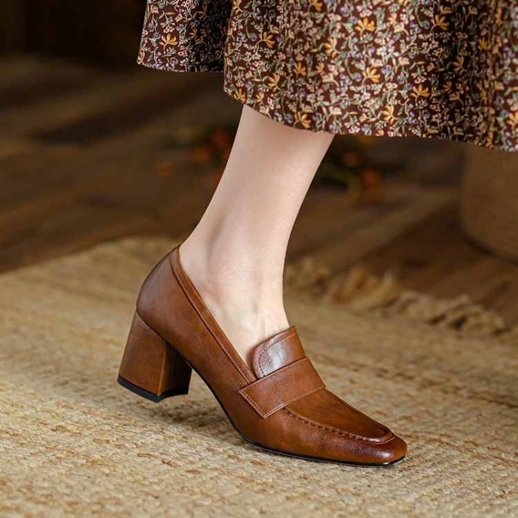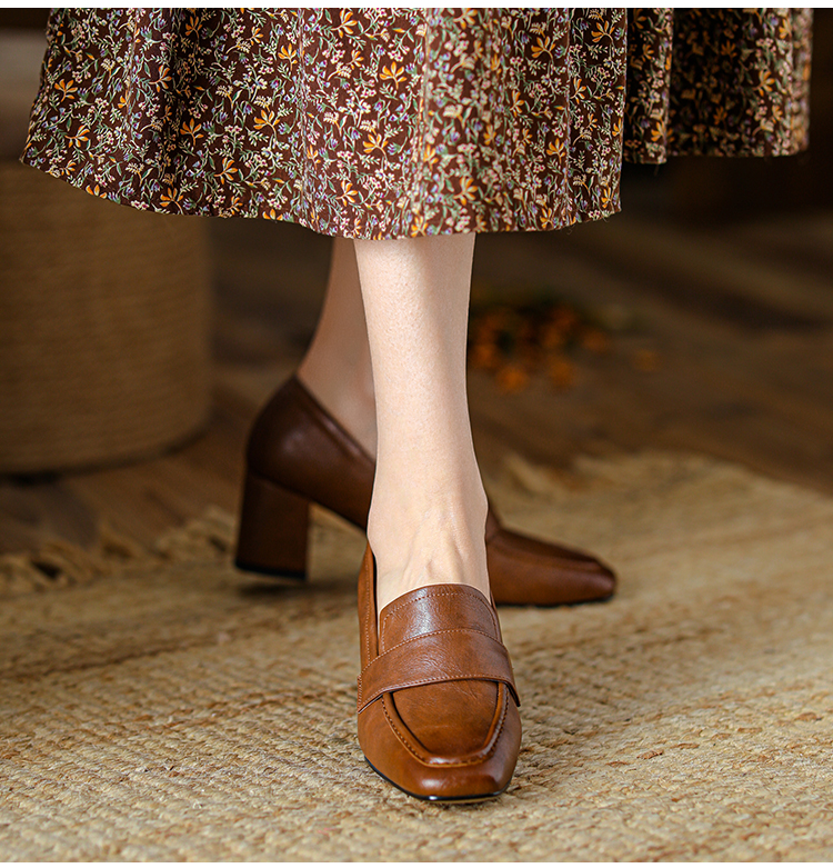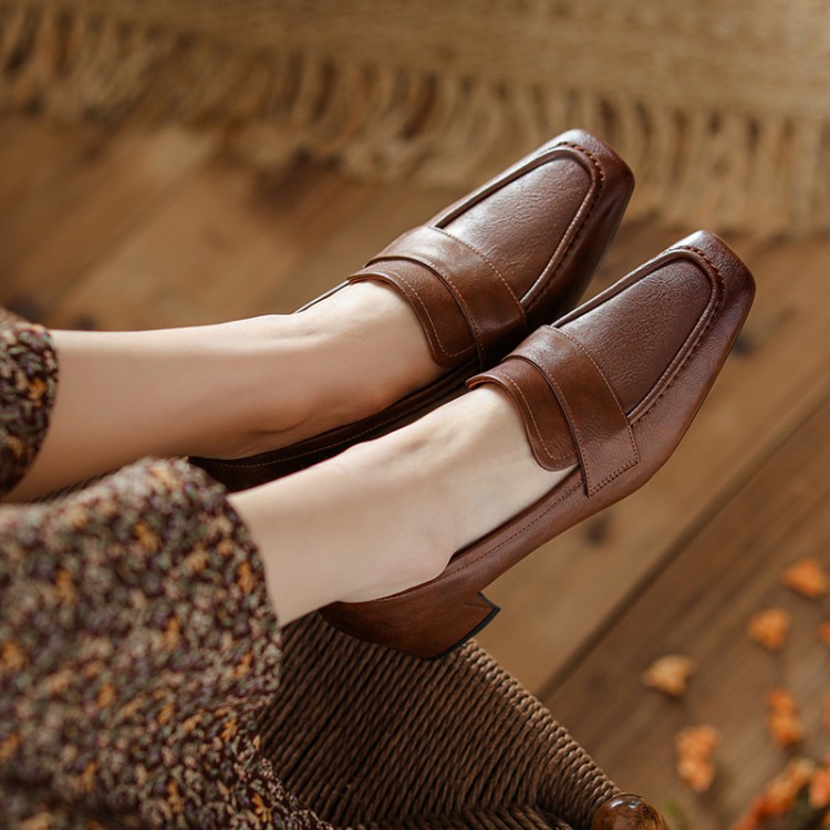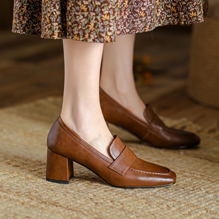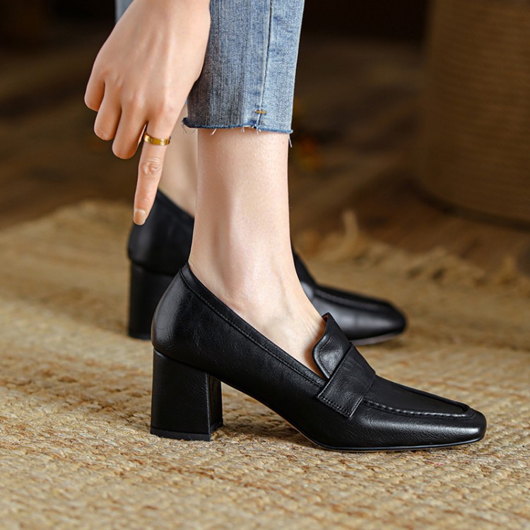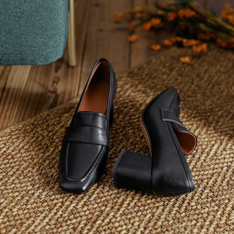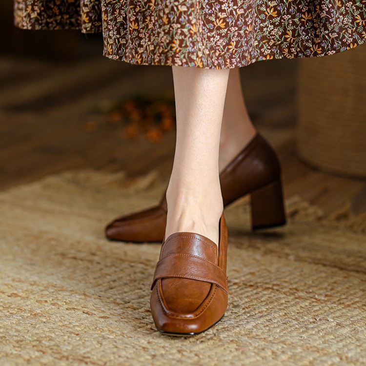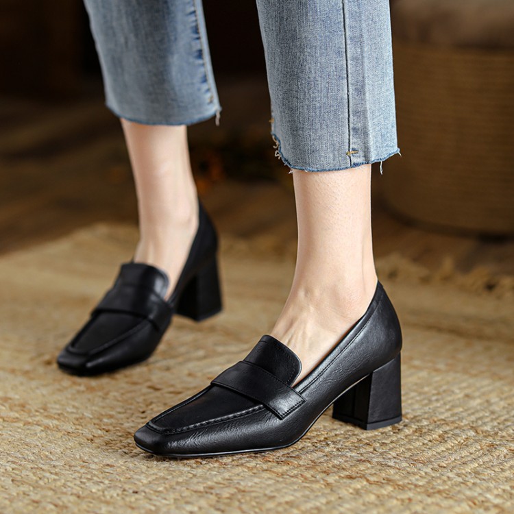 【预售5天】英伦复古风方头深口粗跟高跟小皮鞋春秋季新款大码优雅乐福鞋女NJMK&K122