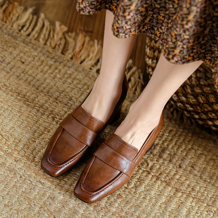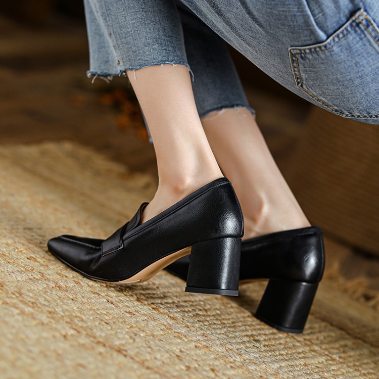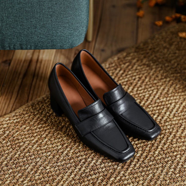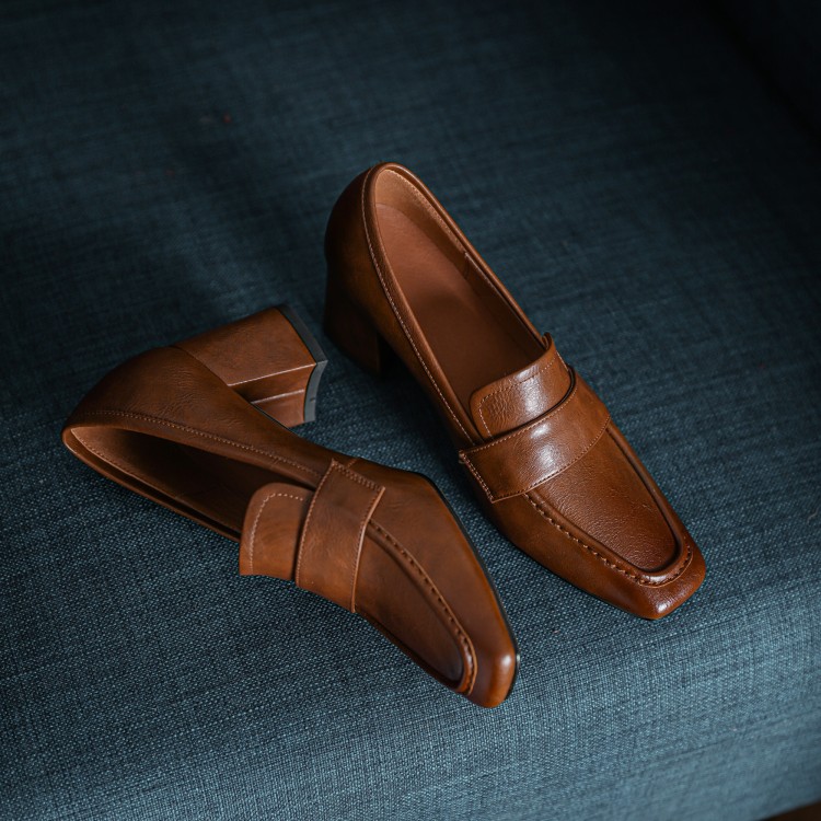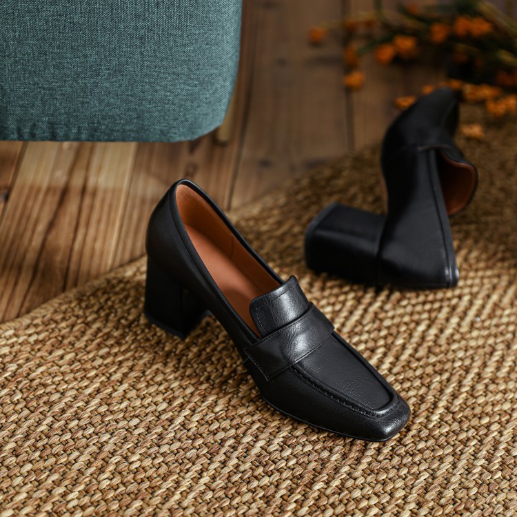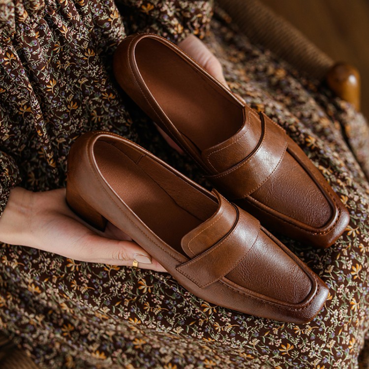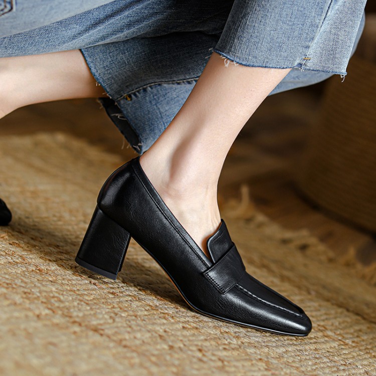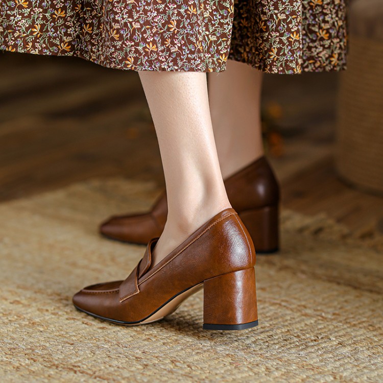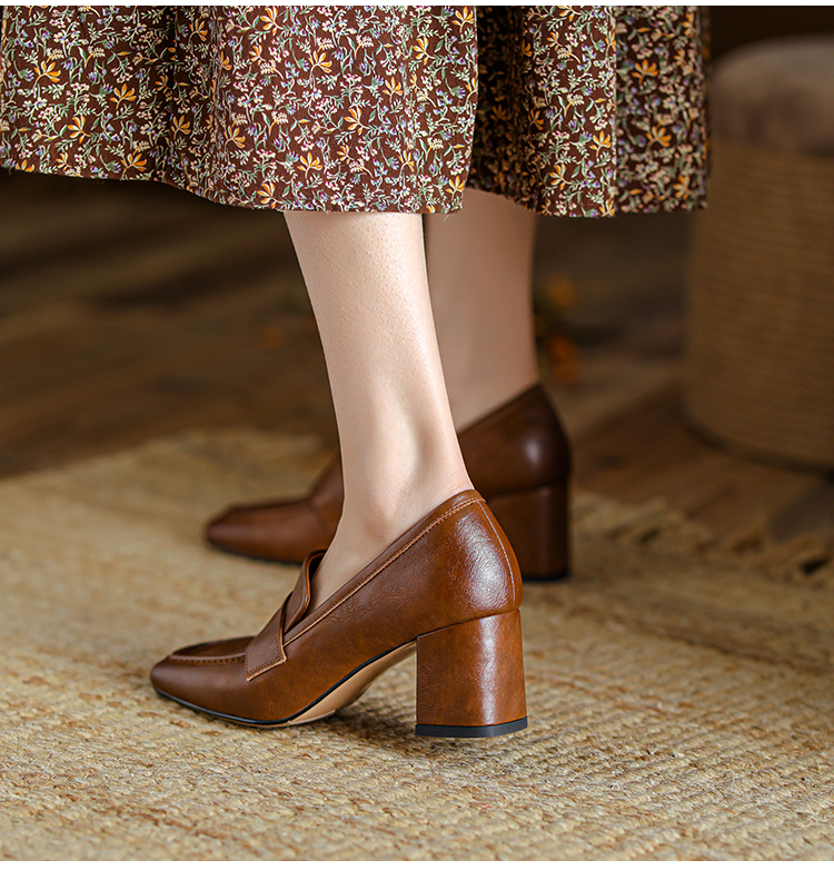 【预售5天】英伦复古风方头深口粗跟高跟小皮鞋春秋季新款大码优雅乐福鞋女NJMK&K122