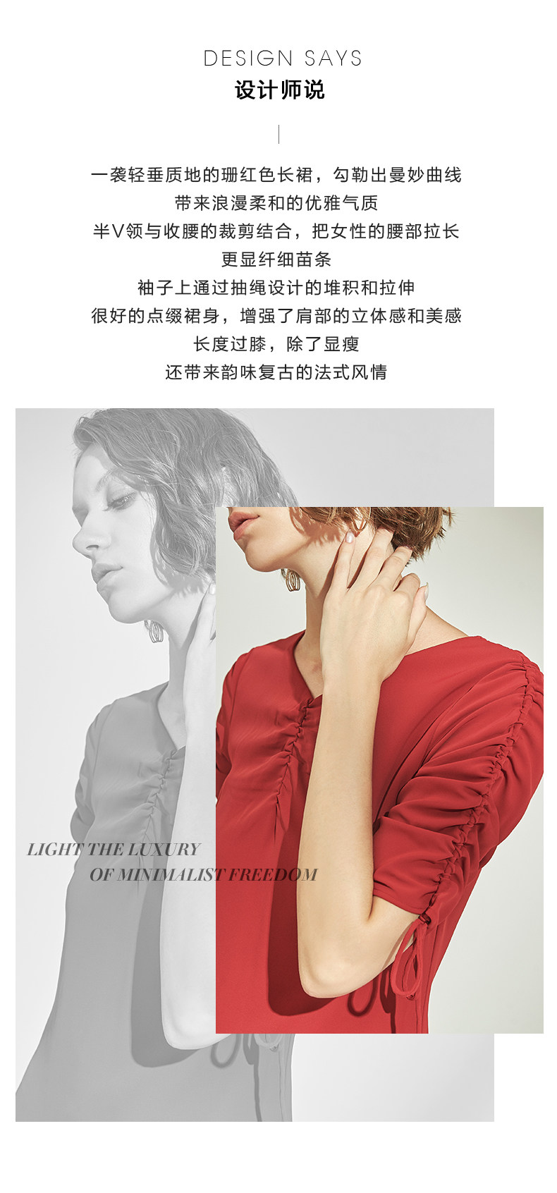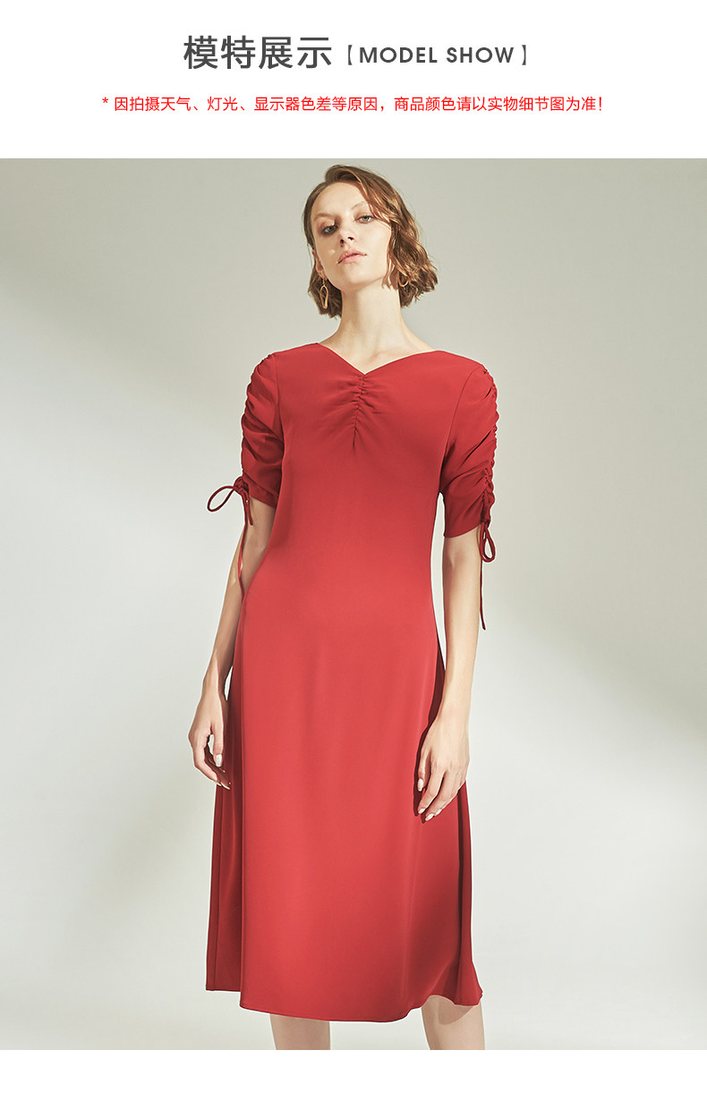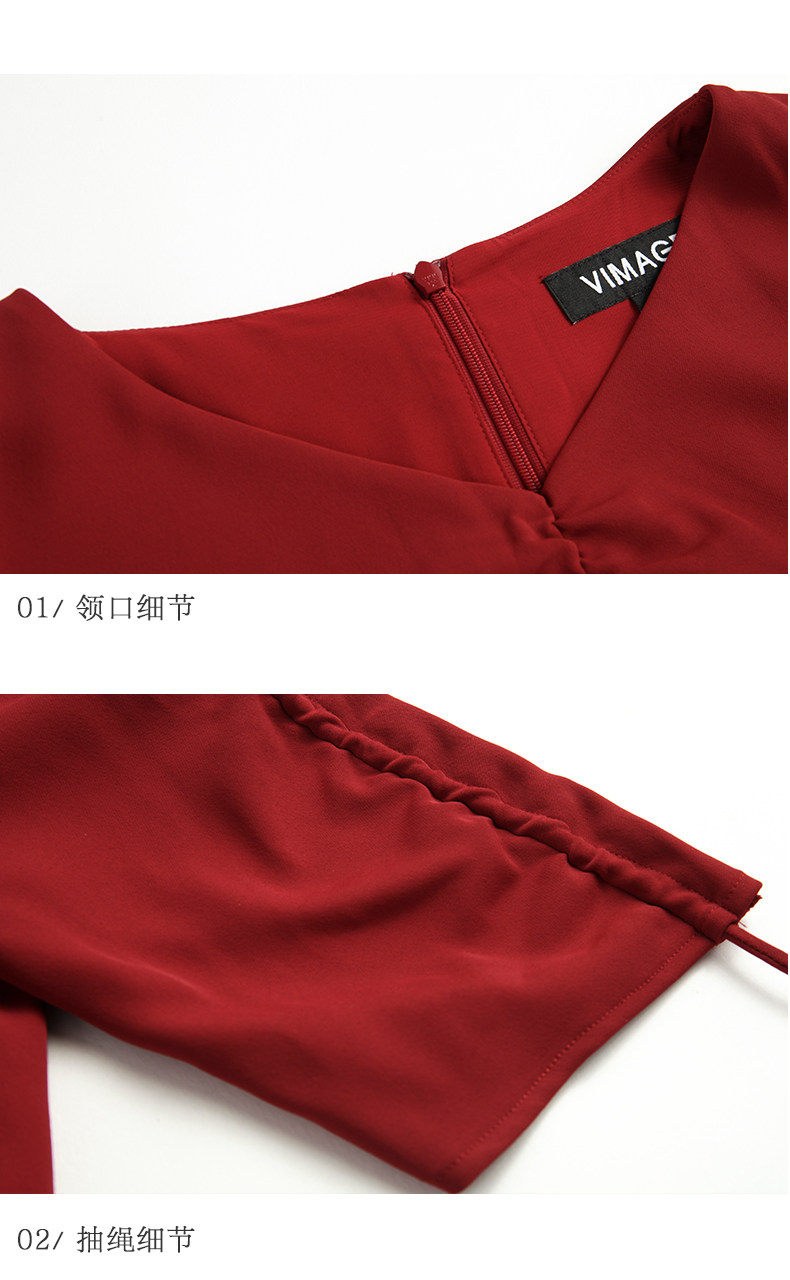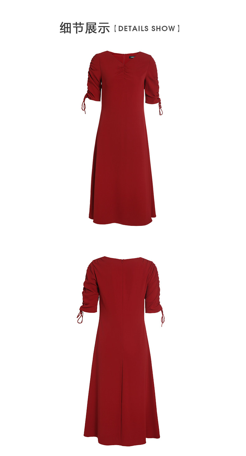 VIMAGE纬漫纪女装夏季抽褶气质优雅V领复古红色连衣裙长V1107751