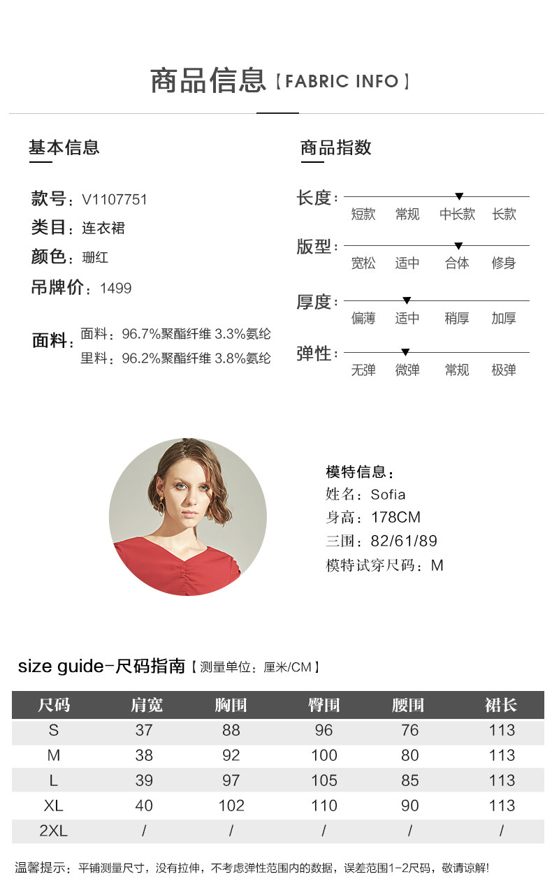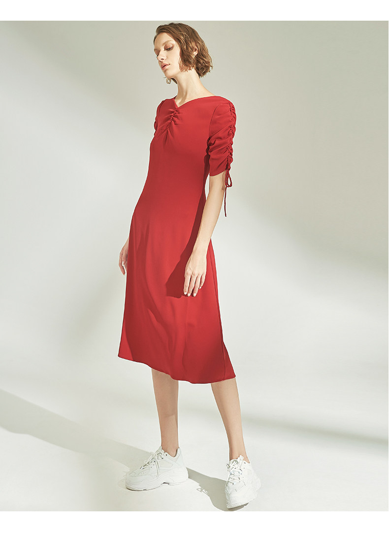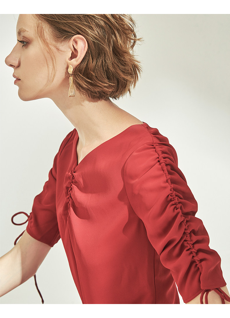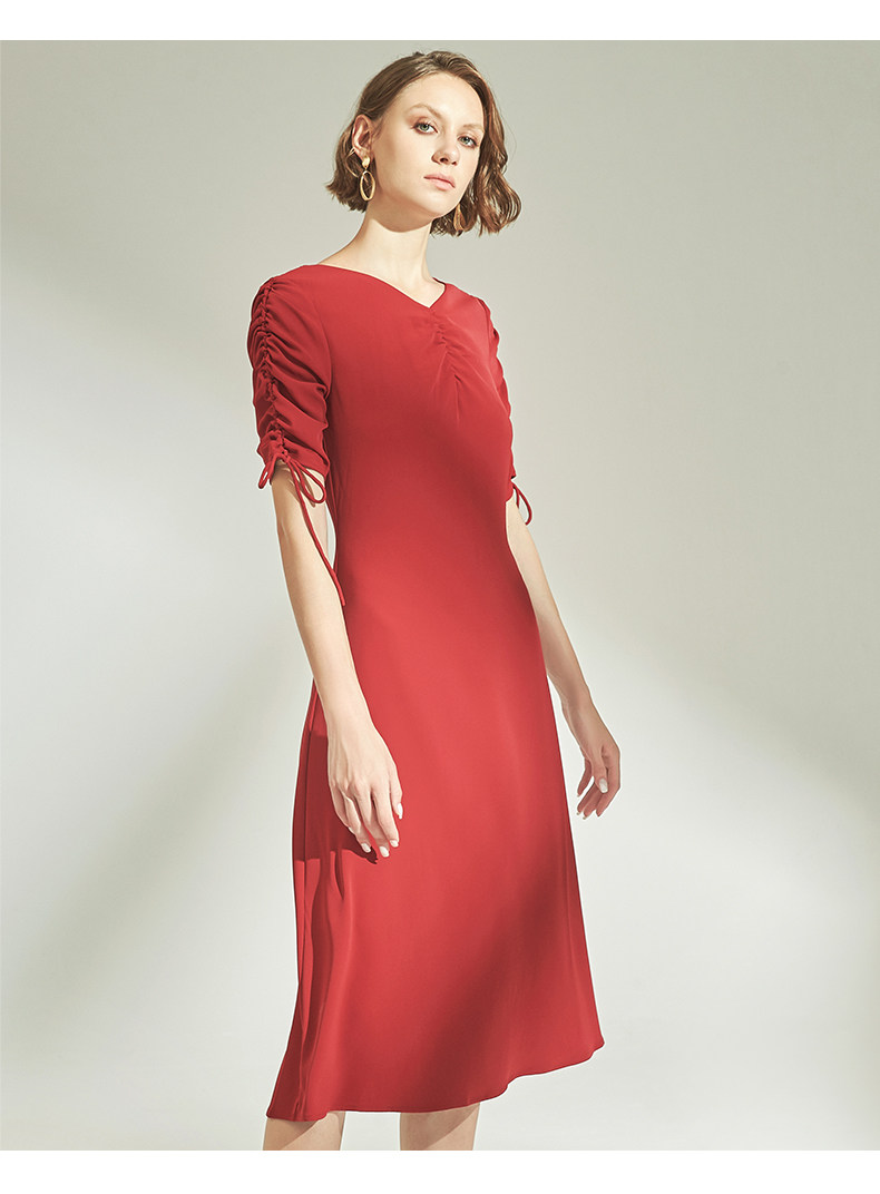 VIMAGE纬漫纪女装夏季抽褶气质优雅V领复古红色连衣裙长V1107751