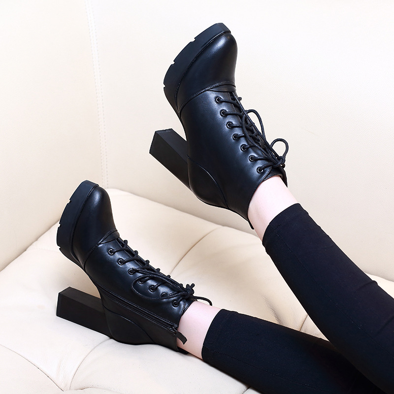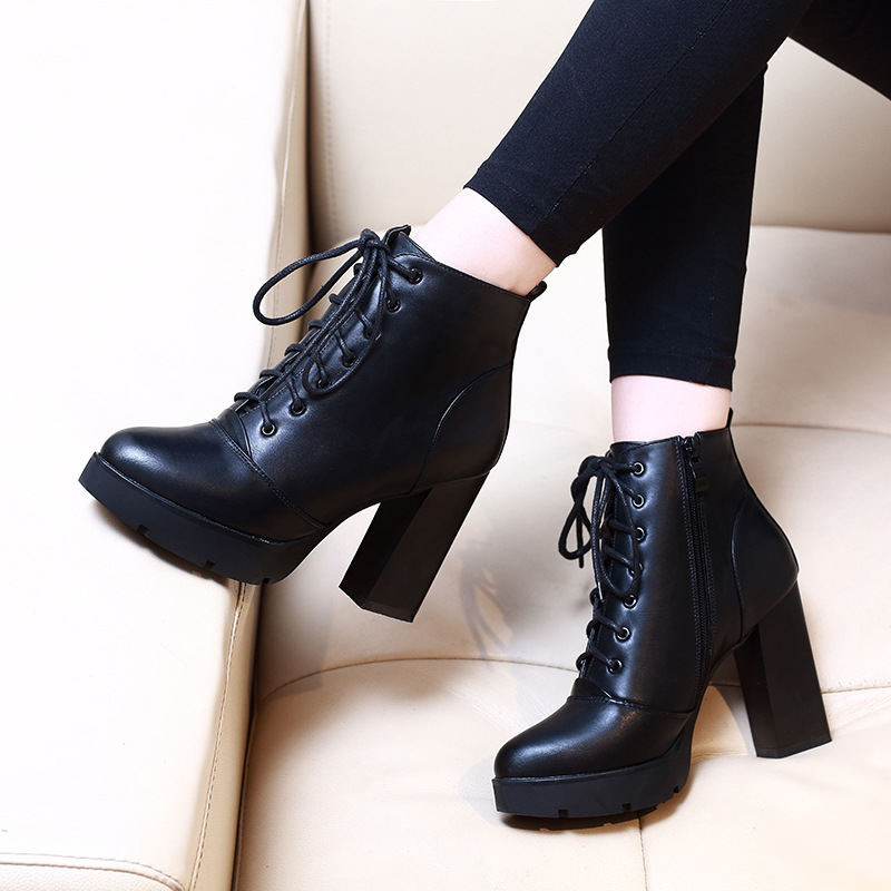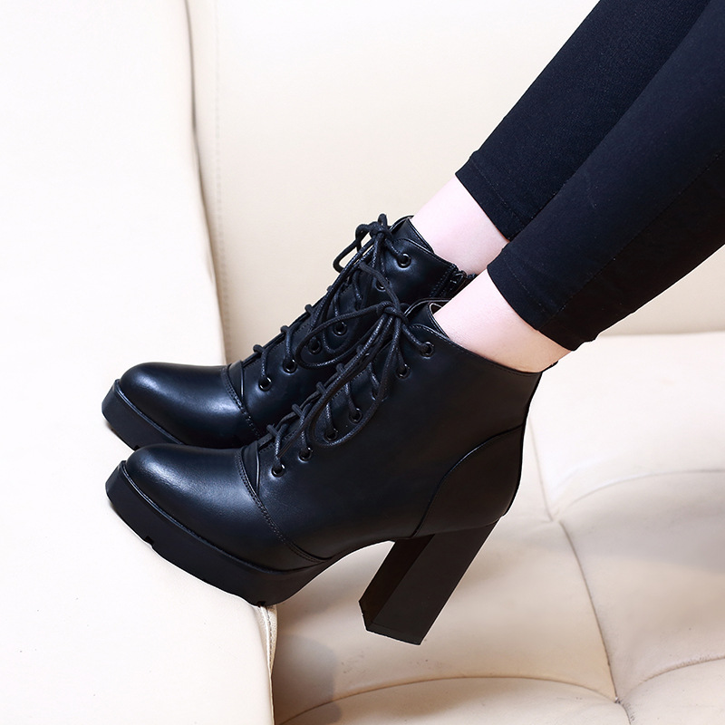 LT-756-2秋冬新款短筒靴防水台粗跟高跟短靴系带马丁靴