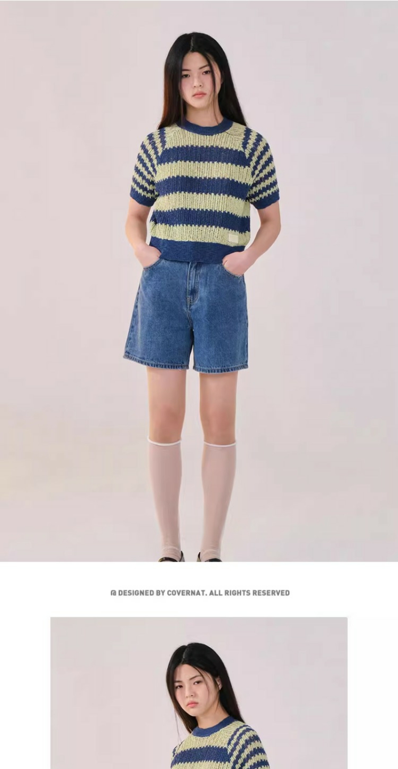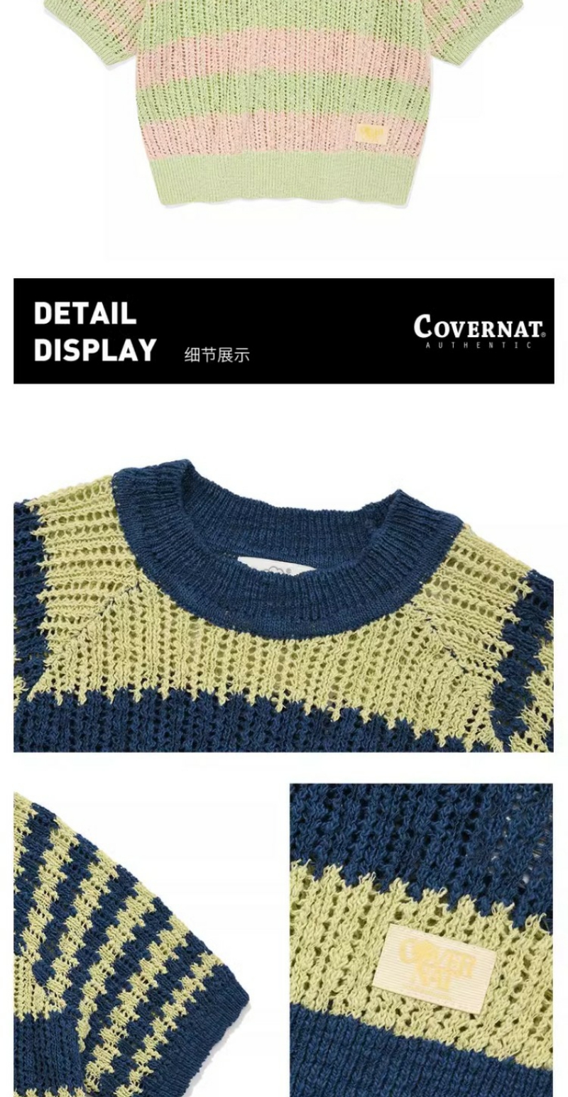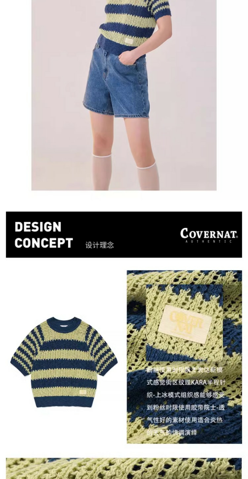 covernat韩国潮牌时尚潮酷短袖女士条纹中款针织衫2024春夏新品CO2402KT73