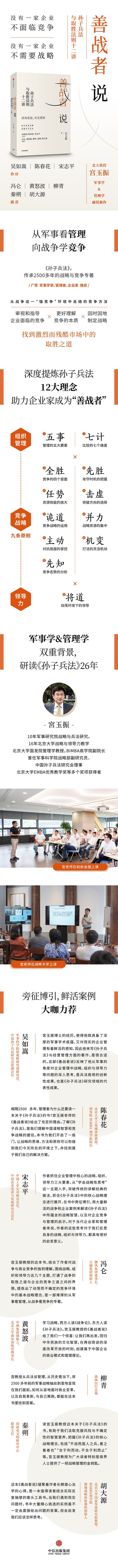 作为军事学博士与北大国发院的教授,宫玉振教授20多年来研读《孙子兵法》,并与管理学相互验证。他从“学会战略性思考”这一主题入手,打破《孙子兵法》的篇章结构,从中提炼出孙子最核心的12个理念,分别从组织管理的深层基础(五事、七计)、竞争战略的九条原则(全胜、先胜、任势、击虚、诡道、并力、主动、机变、先知”),以及领导力的基本内涵(将道)入手,旁征博引,用大量鲜活的案例,完备而系统地阐述了《孙子兵法》之于管理和经营的启发与应用,协助管理者也成为一个“善战者”。