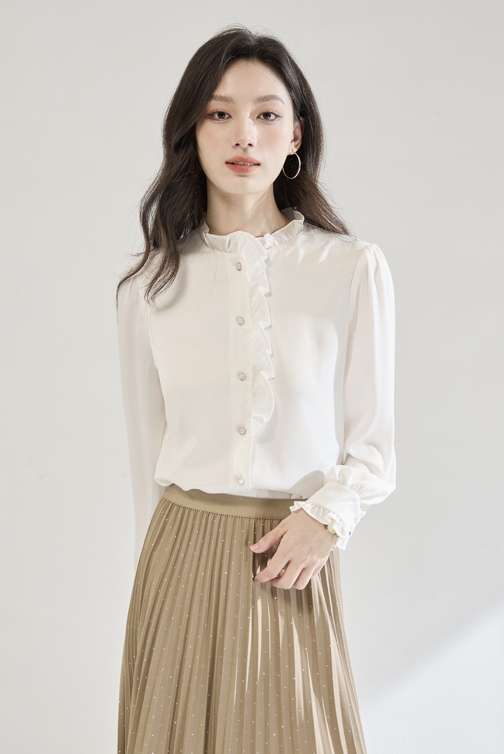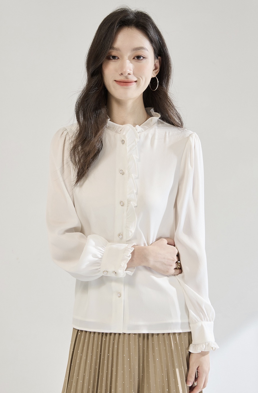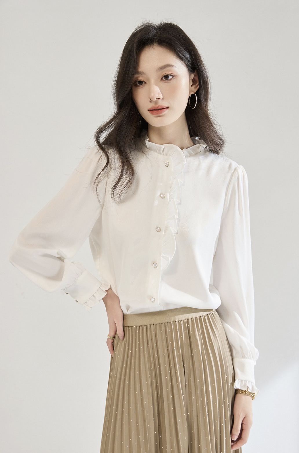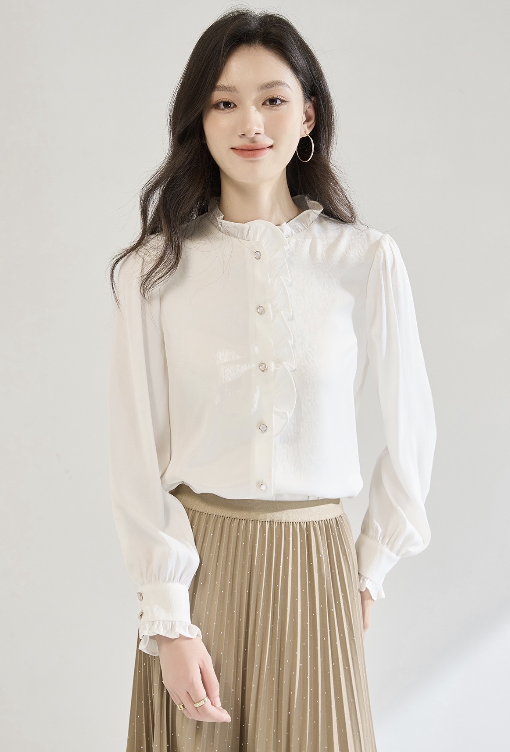 「高货sh」全新升级【铂金会员220/天猫289/差价69】(12122)洛诗琳白色木耳边立领衬衫2025秋季优雅通勤百搭雪纺上衣