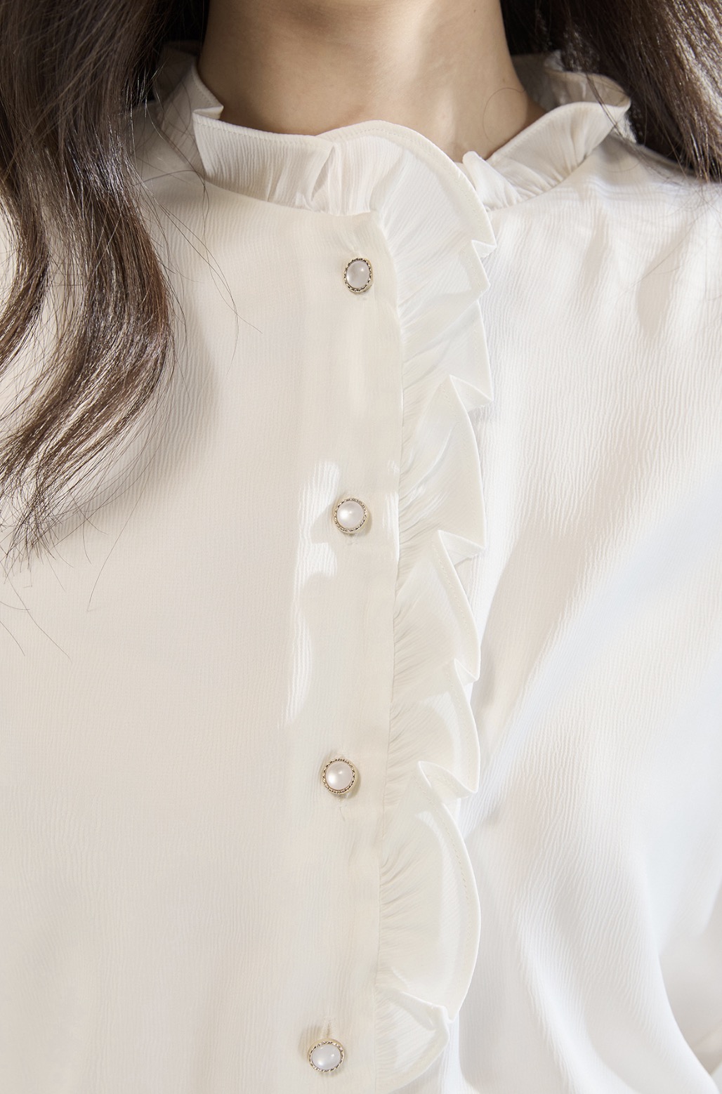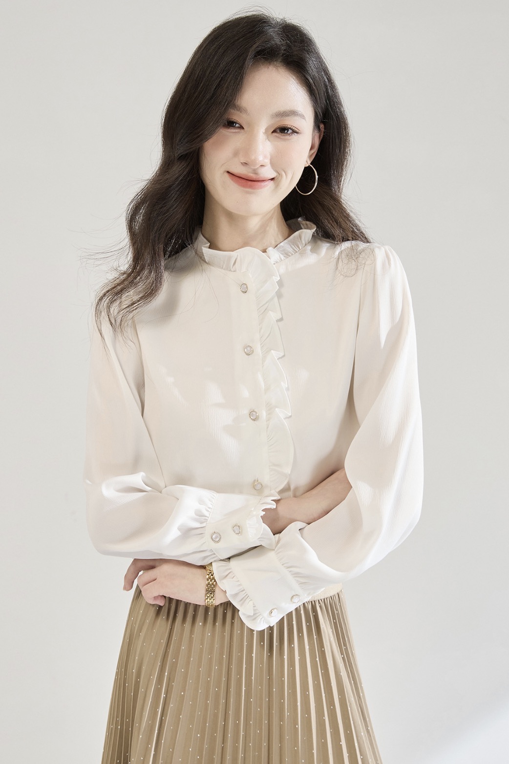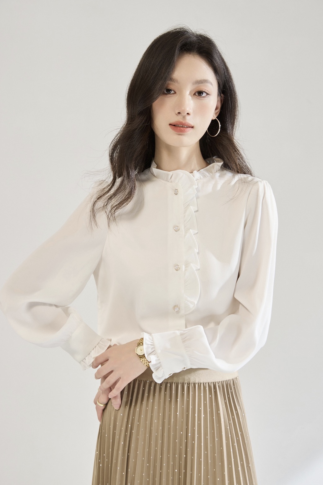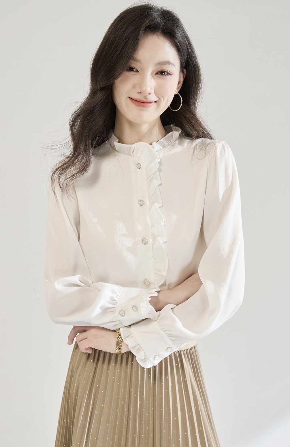 「高货sh」全新升级【铂金会员220/天猫289/差价69】(12122)洛诗琳白色木耳边立领衬衫2025秋季优雅通勤百搭雪纺上衣