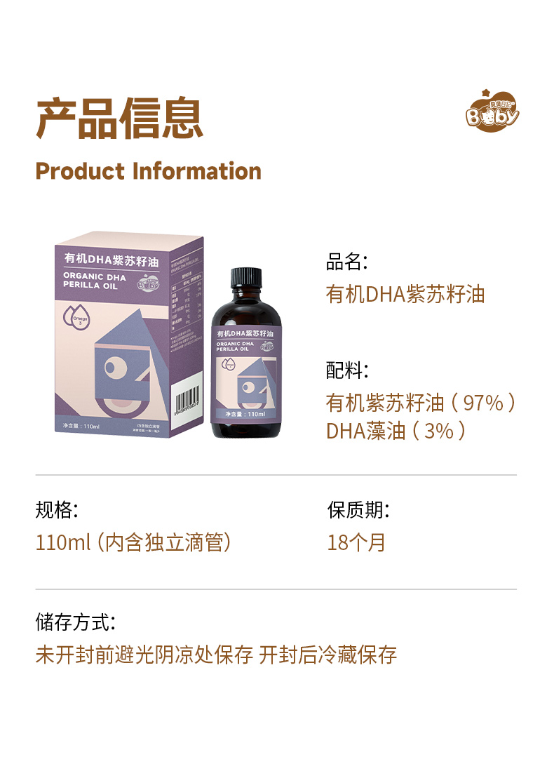 【辅食/母婴用油】 有机DHA紫苏籽油110ml 滴管装