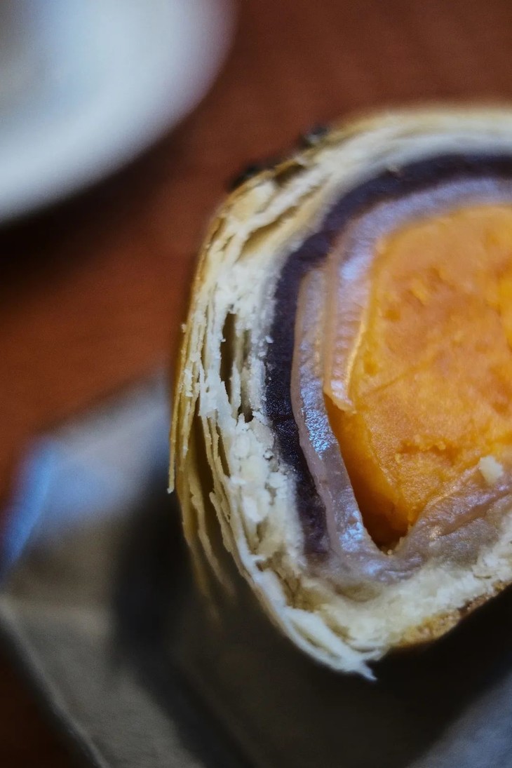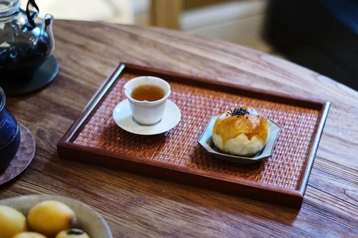 新鲜猪板油熬制的玉白色猪油,被揉进油皮和油酥里,油皮包裹着油酥层层卷起又被擀平,最终形成薄韧舒展的面皮。要求每张酥皮水油适度、均匀平整、层次清晰不混酥,才能酥到扑簌簌掉渣。真真是做着蛋黄酥,操着法式千层酥的心。