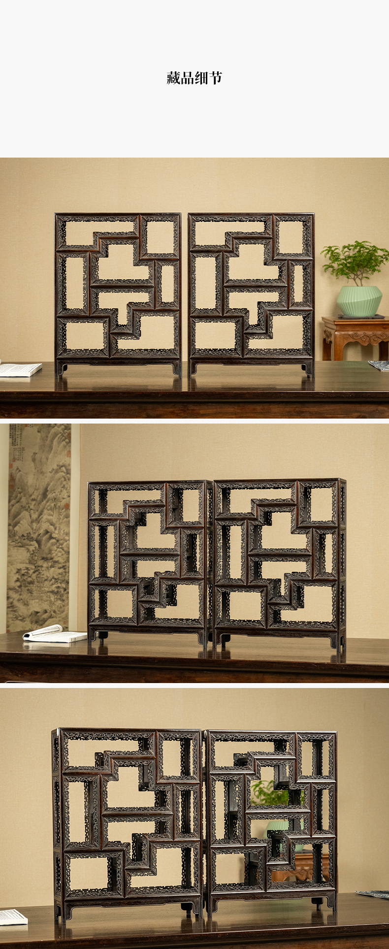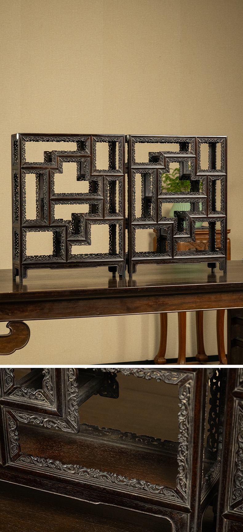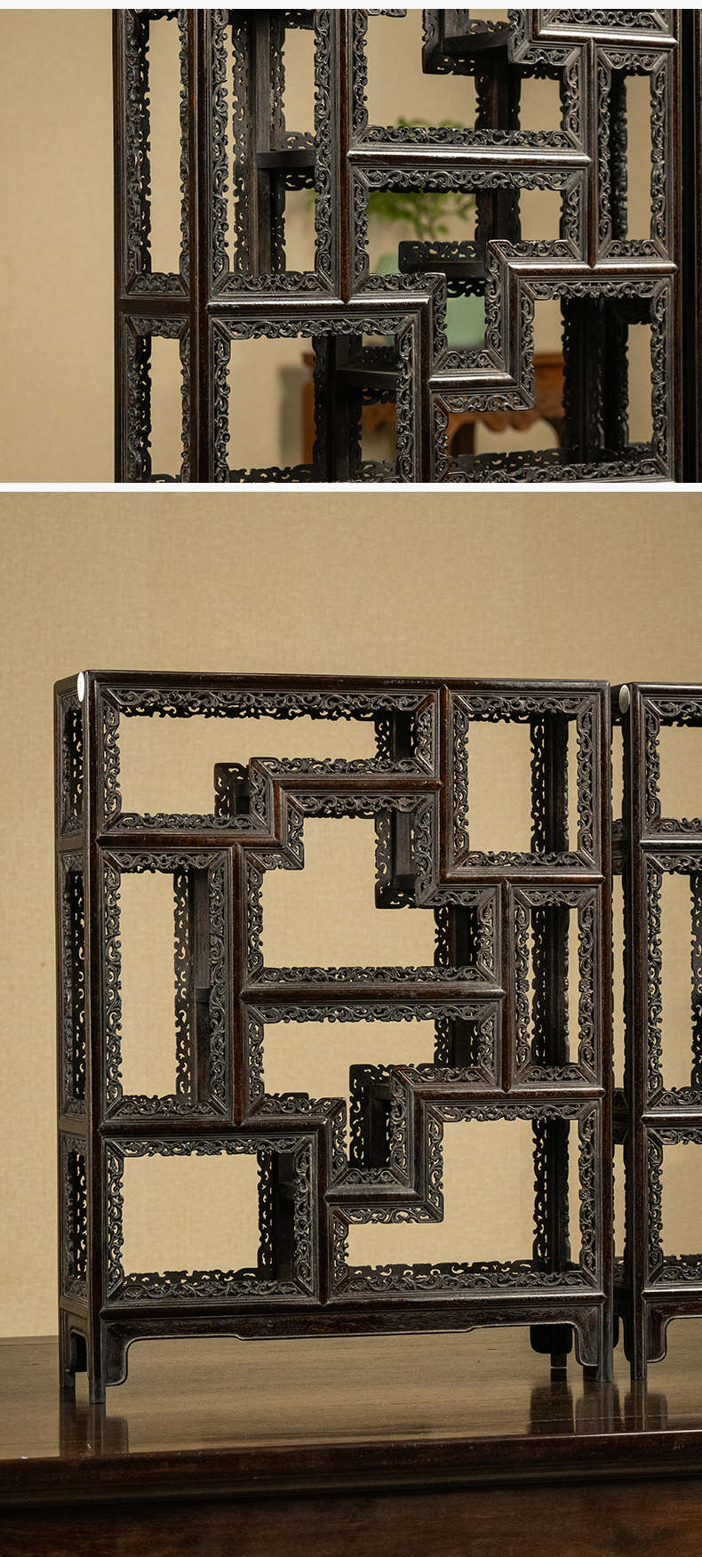 清 紫檀透雕卷草纹圈口博古架摆件(一对)