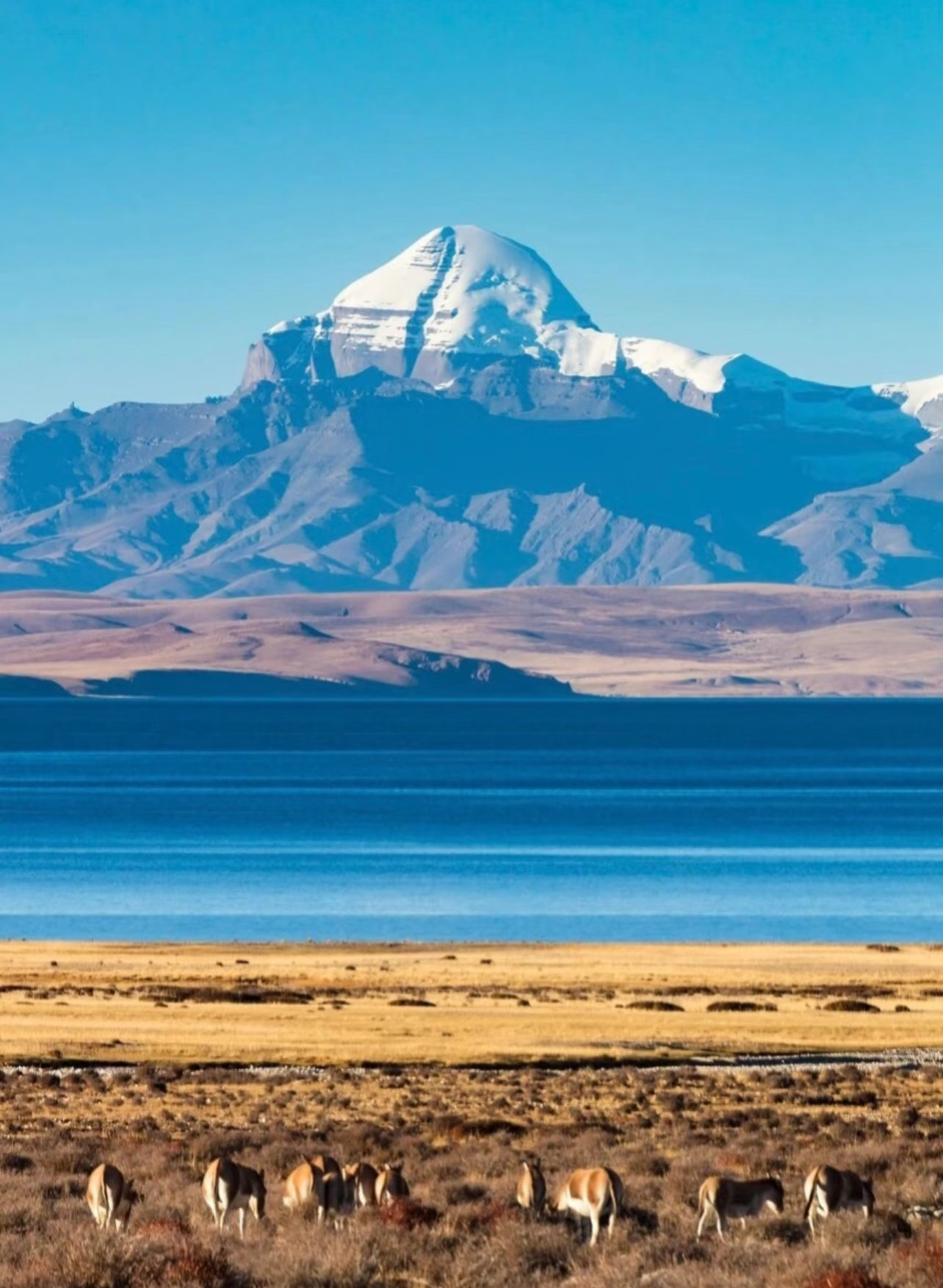 穿越帕羊草原上,沿途看到很多藏羚羊、藏野驴等,翻越【马攸木拉垭口】海拔5216米,进入神奇的阿里地区,越过垭口远远就见到一个蓝色的湖,就像一块蓝宝石埋藏在荒原之中这就是【公诸措湖】。圣湖【玛旁雍措】烟波浩淼有【世界江河之母】的美誉。圣湖位于冈底斯山主峰【冈仁波齐峰】和喜马拉雅山【纳木那尼峰】之间,曾与【拉昂错】(鬼湖)相通,后由洪积,冰水堆积物堵塞而演化为内流湖。