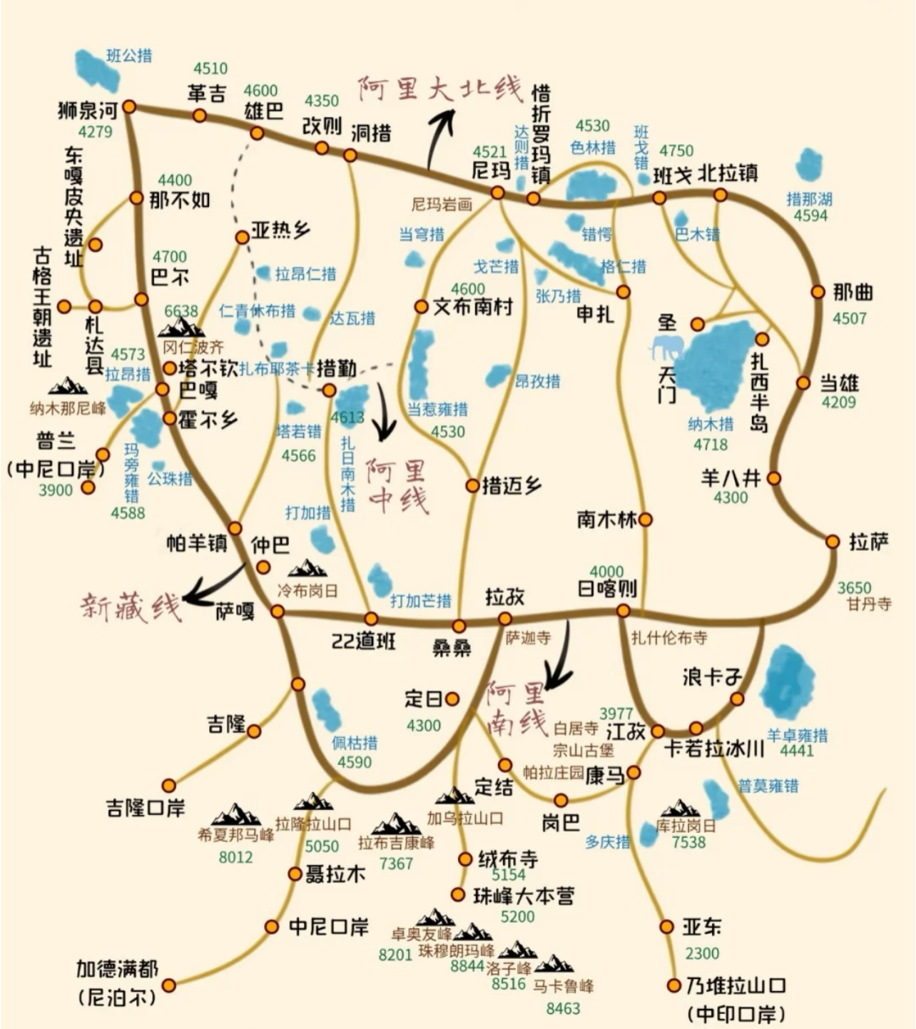 【班公湖】又称错木昂拉红波,藏语意为"长脖子天鹅",有世界上海拔最高的鸟岛,【土岩画】文化遗址,主要分布在班公措南部和东面近二、三百平方公里的区域内,最容易找到的岩画就在日土附近的新藏公路一带。壁画是用坚硬的石头或其它硬物在岩面或岩石上刻凿而成。【狮泉河】沿途景点拍摄。