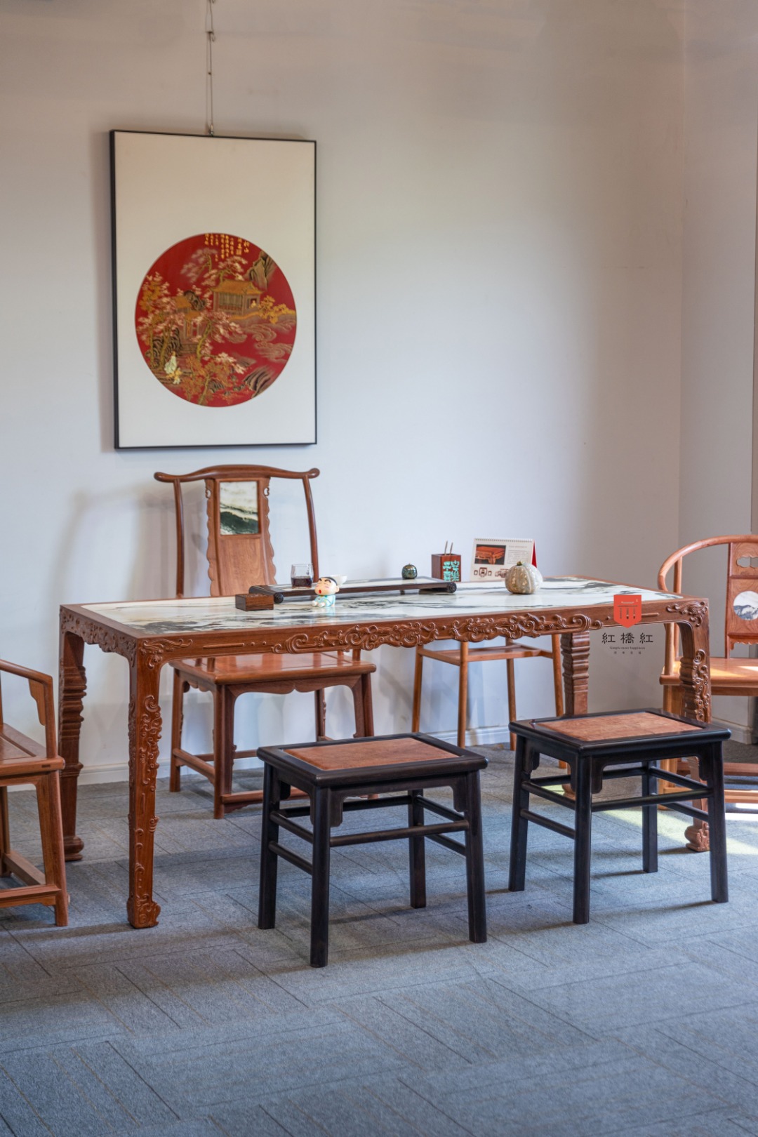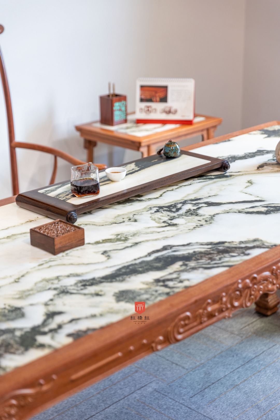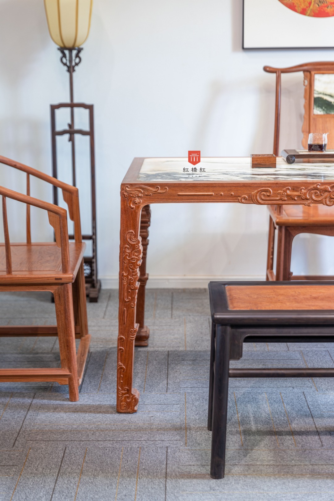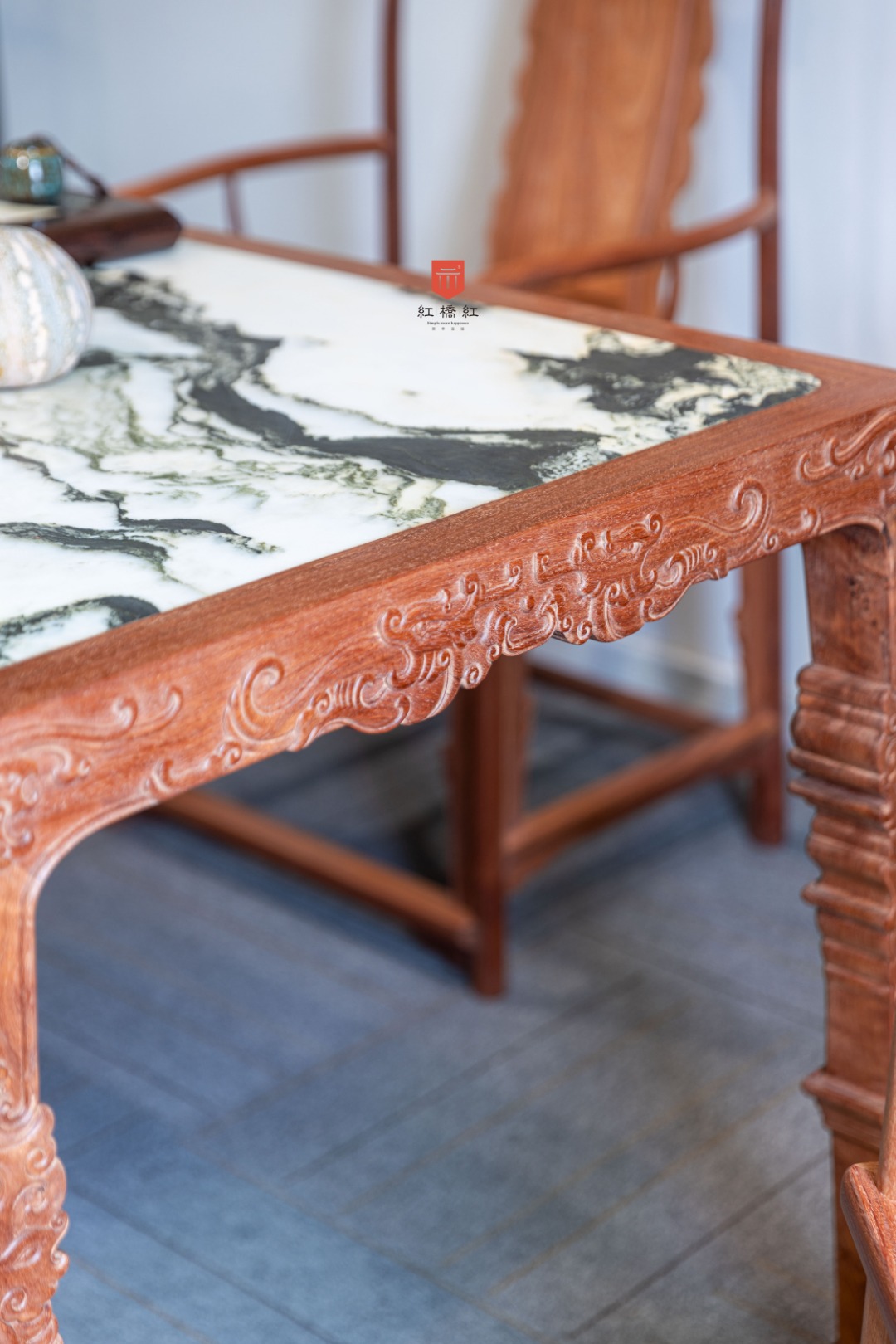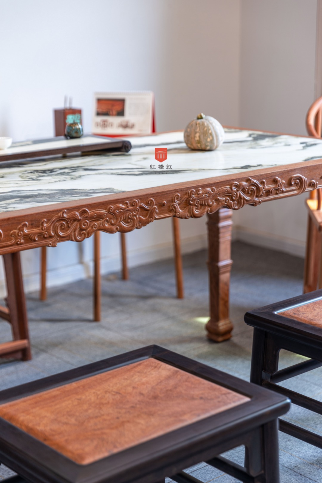 此桌源于宋代的极简,四足一面再无余赘,独此中国文房浪漫。长宽高及近文房标准器,赌茶泼墨红袖添香,案上风雅推窗望月。方桌遍体浮雕螭龙纹,刀工圆润,花纹奇古,动静之间节奏明快,宋明风华蔚为大观。桌面平阔,四边攒框镶独板或云石面心两种选择,白质黑章山河天成,文房无画桌为卷,一室无书墨妙香;面下穿带密集,攒框及腿足取材厚重,面心选材毋论木石皆奢。边框与腿足浮雕纹饰高古,腿足存壸门床遗风,追雅存意时移无减。整器由想法、资料查找,到绘图、撇脚打样,成品定型耗时5月有余。整体律动流畅,风格优雅,若高山流水一曲知音。