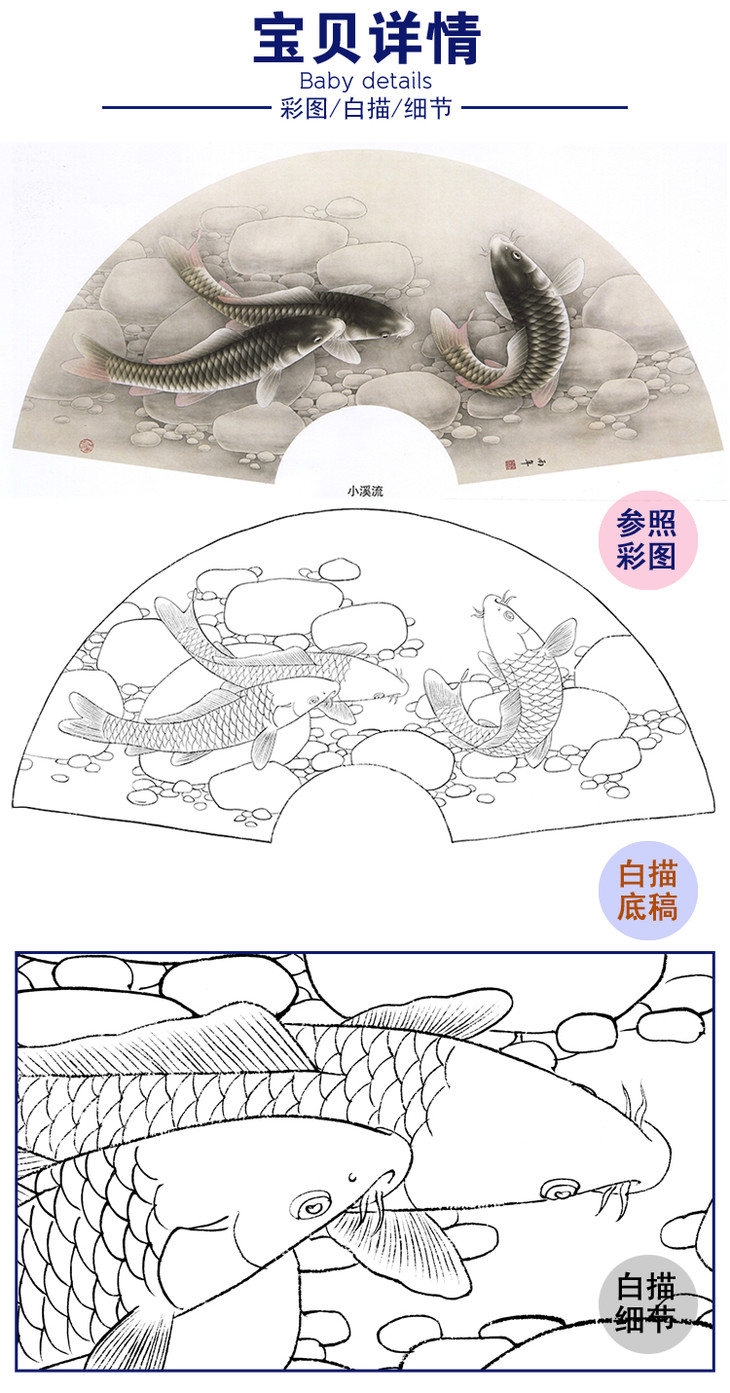 工笔花鸟白描底稿-张建军-鲤鱼扇面小品-小溪流-A352