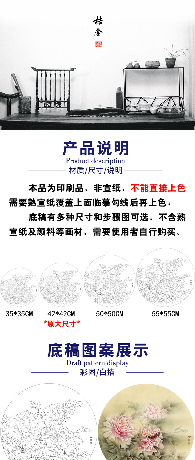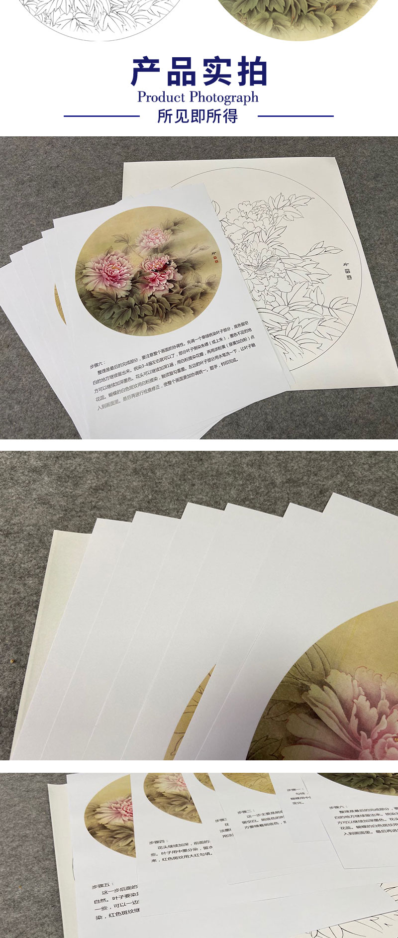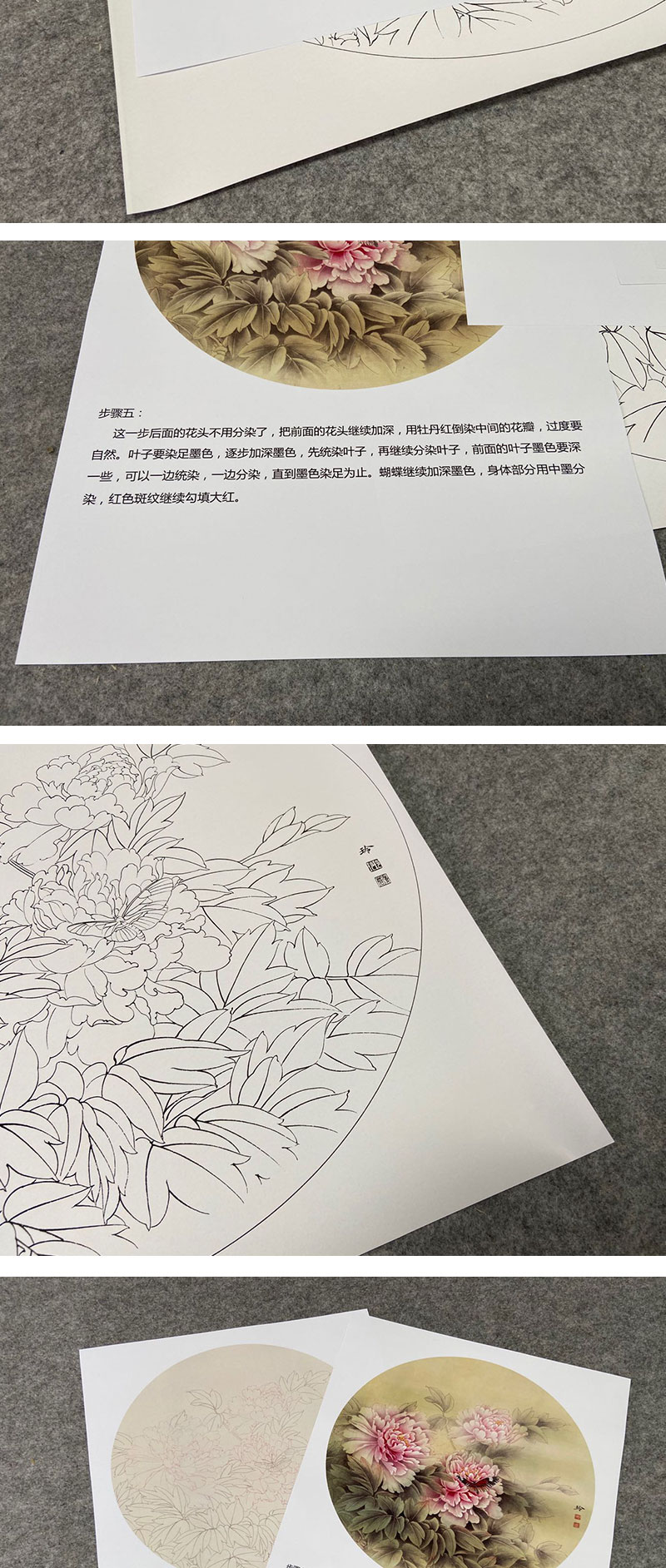 【有步骤、大彩图】郑玲玲工笔画白描底稿圆形小品《春分蝴蝶梦花间》牡丹蝴蝶初学者临摹花鸟线稿ZL12