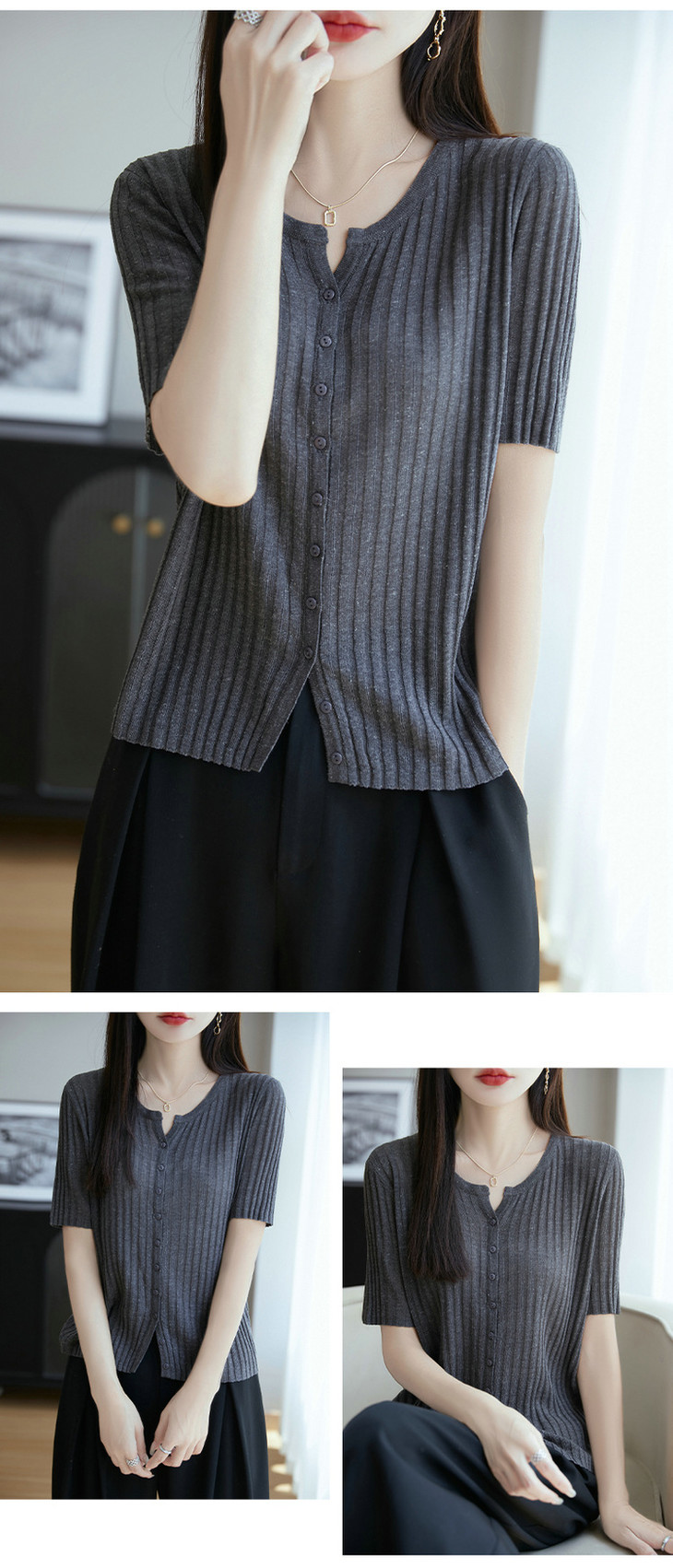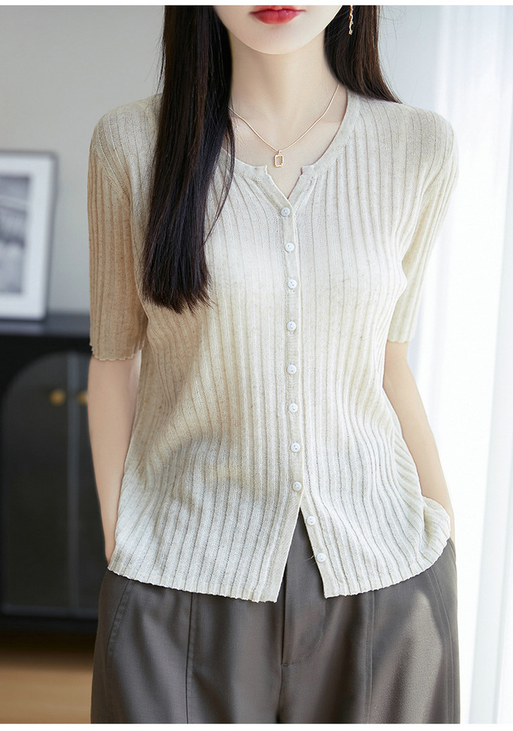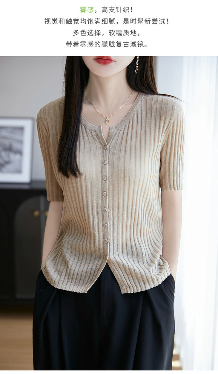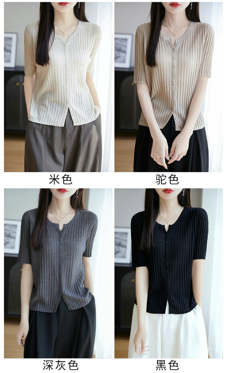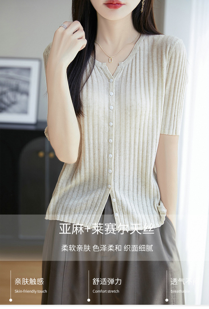 天丝亚麻抽条圆领短袖针织开衫,薄款百搭五分袖打底上衣YN-S-95039