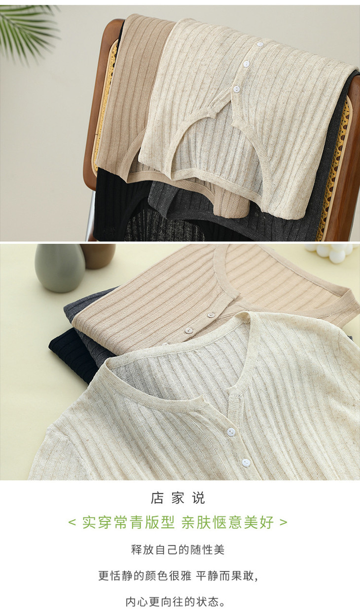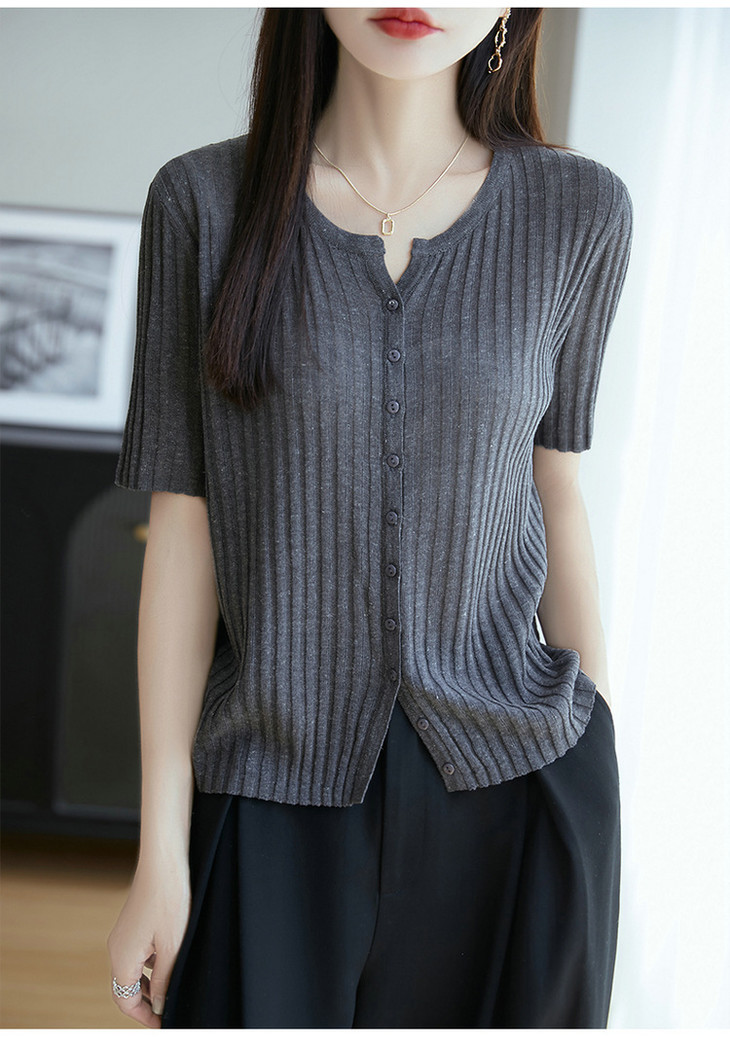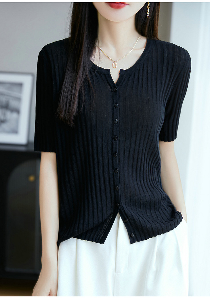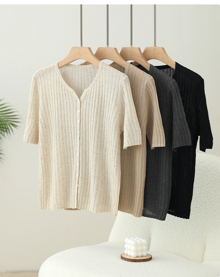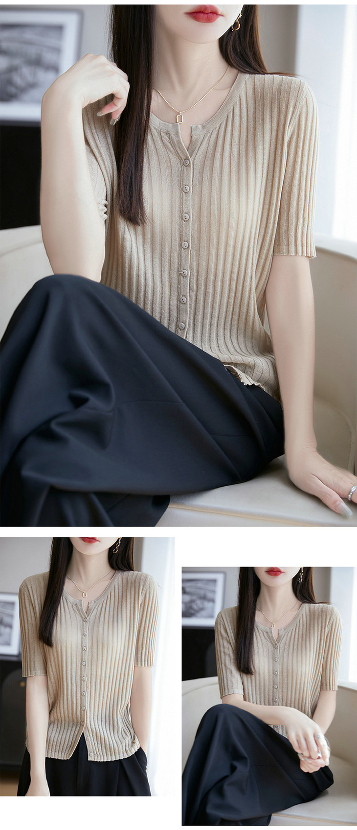 天丝亚麻抽条圆领短袖针织开衫,薄款百搭五分袖打底上衣YN-S-95039