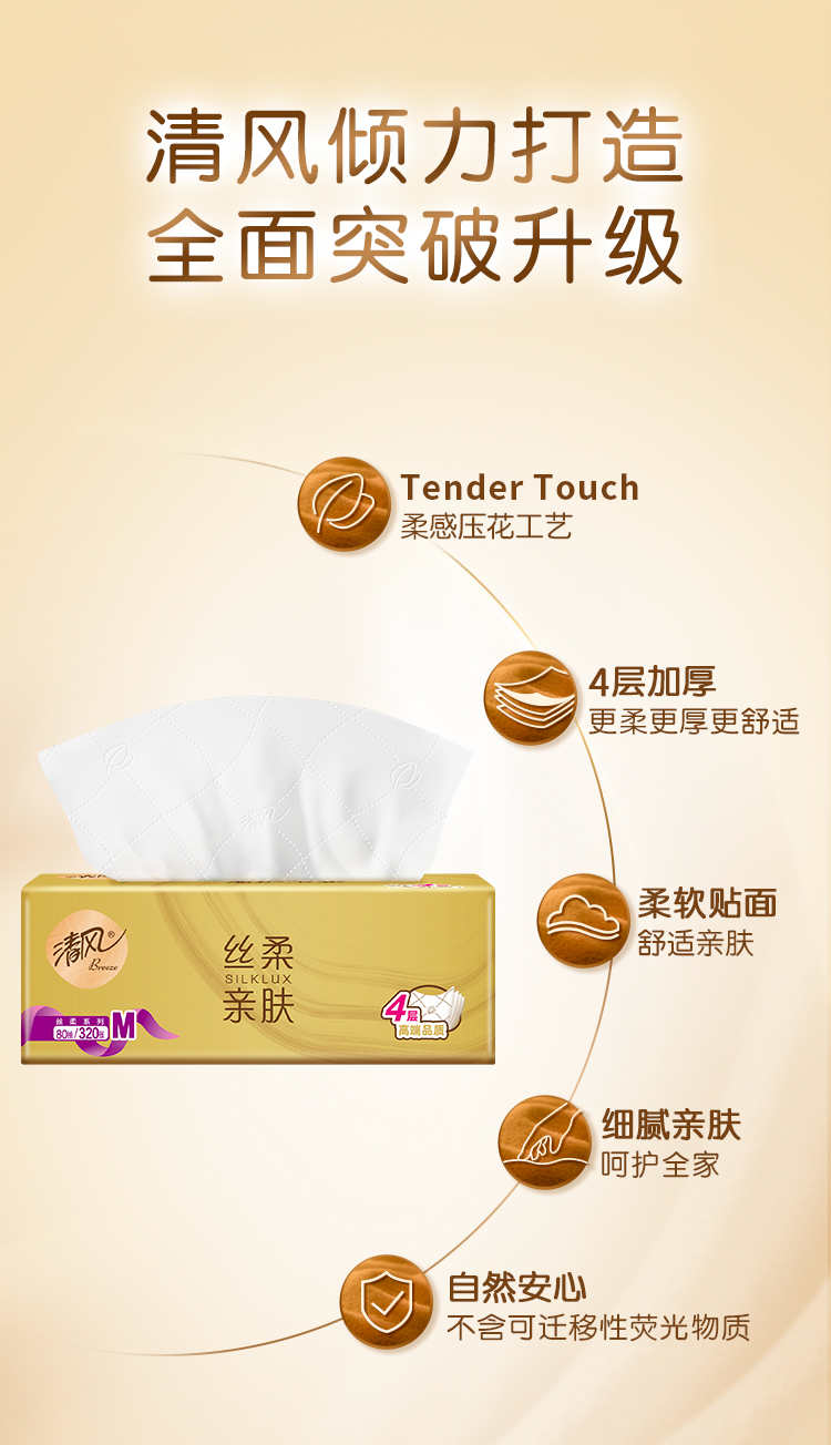 【官方自营】清风金装丝柔M码4层80抽24包抽取式面巾纸