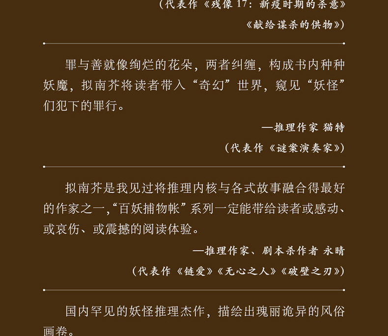 ★拟南芥的妖怪推理小说“百妖捕物帐”系列同样是“捕物帐”小说,虽然带有众多日本妖怪元素,但却是纯粹的本格推理小说。故事中都是别有用心之人,假借妖魔鬼怪之名,而行不轨之事。