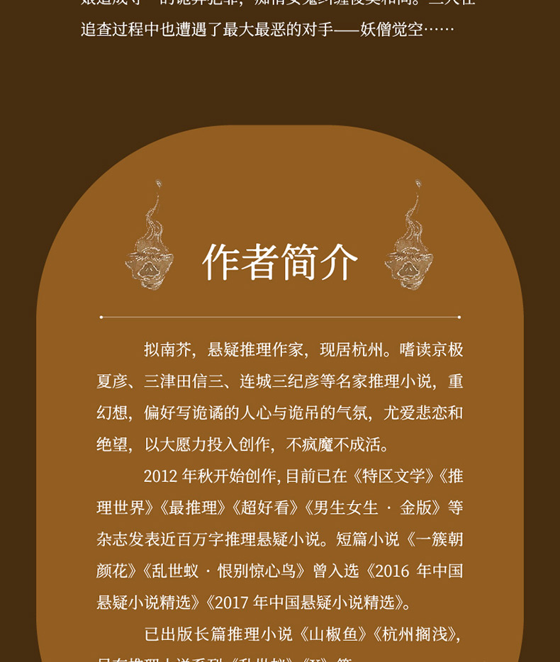 2012年秋开始创作,目前已在《特区文学》《推理世界》《最推理》《超好看》《男生女生•金版》等杂志发表近百万字推理悬疑小说。短篇小说《一簇朝颜花》《乱世蚁•恨别惊心鸟》曾入选《2016年中国悬疑小说精选》《2017年中国悬疑小说精选》。