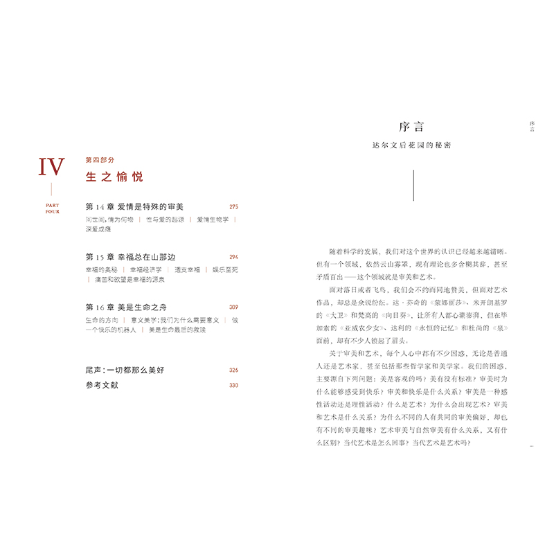 本书围绕 “美是进化的奖励” 这一核心主题,力图展现美的起源和演化的主体面貌,回答并解决其中的关键问题。全书分为四大单元 ,第一单元 “美的起源和演化”,是基础部分,回答美学的三个基本问题:为什么美?如何美?什么是美?如果把美的演化史比喻为一棵大树,第一单元是其中的主干;第二单元 “艺术的本质”,聚焦艺术,回答艺术和审美的关系,艺术起源、艺术审美和进化的关系;第三单元 “审美和艺术的困惑”,着力于分析和回答审美和艺术中最常困扰我们的问题,包括审美的感性和理性纠葛、审美的功利性、审丑现象、当代艺术和抽象艺术;第四单元 “生之愉悦”,是对美的演化史的延伸,展示审美、艺术、爱情和幸福一脉相承的关系,美同样是生命演化和人生幸福的基础和追求。