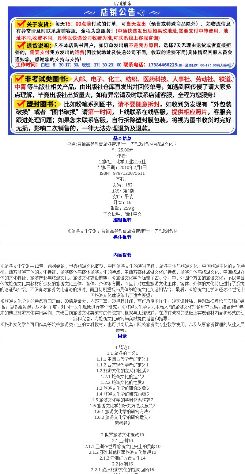 普通高等教育旅游管理十一五规划教材 旅游文化学 喻学才 化学工业出版社 9787122075611