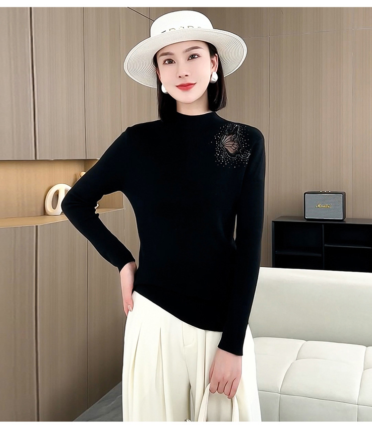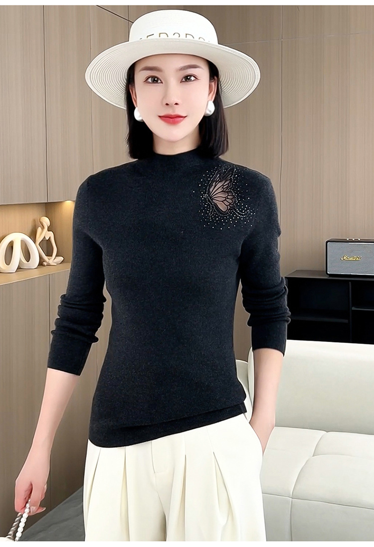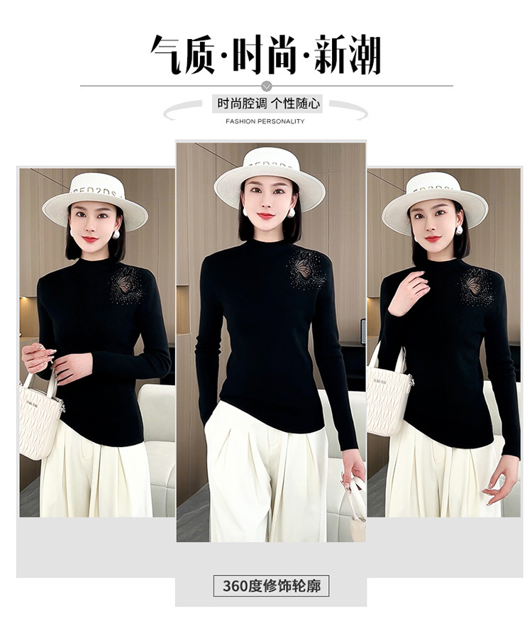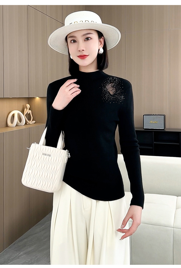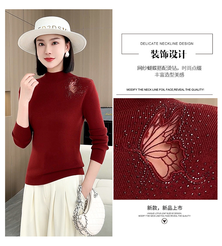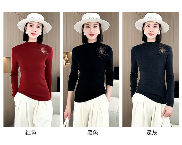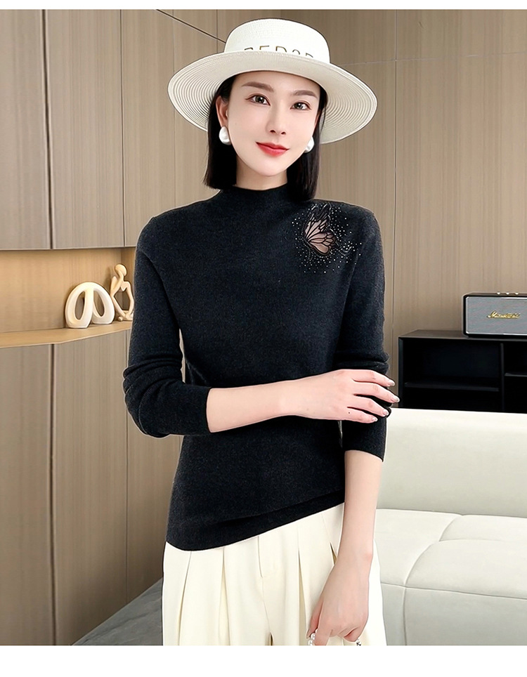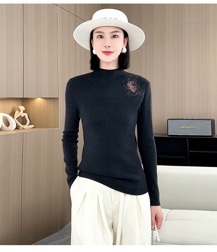 羊毛针织打底衫,洋气单肩纱网锈花针织衫QYM-LRX-HQDK752-Y
