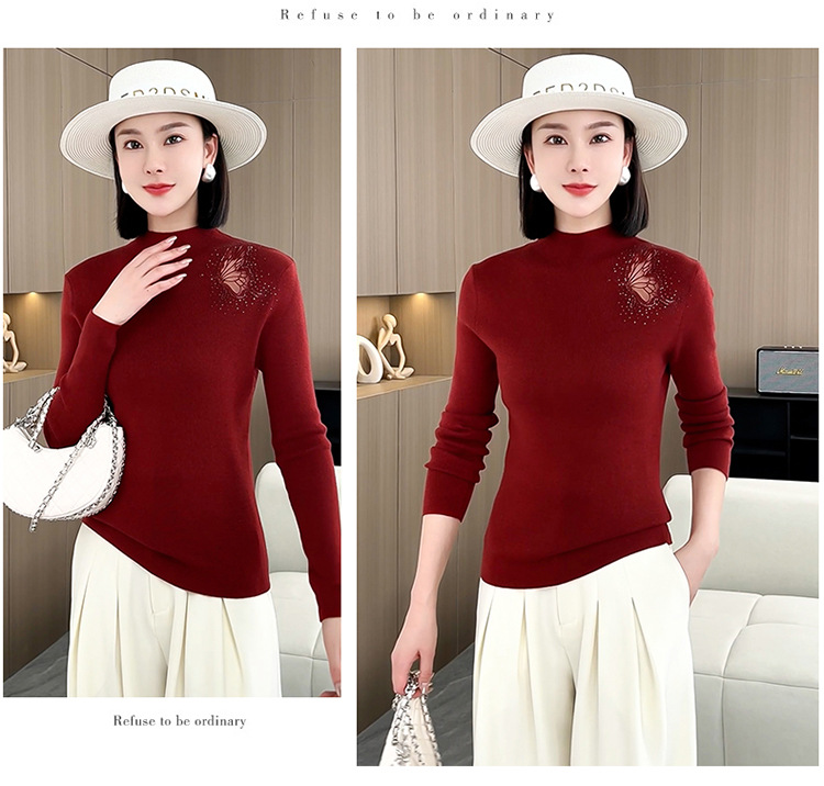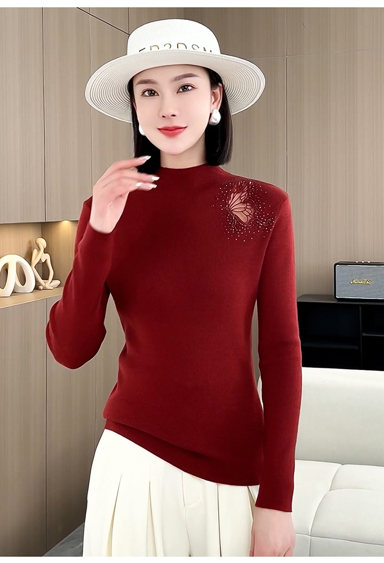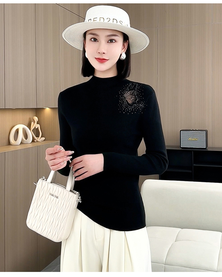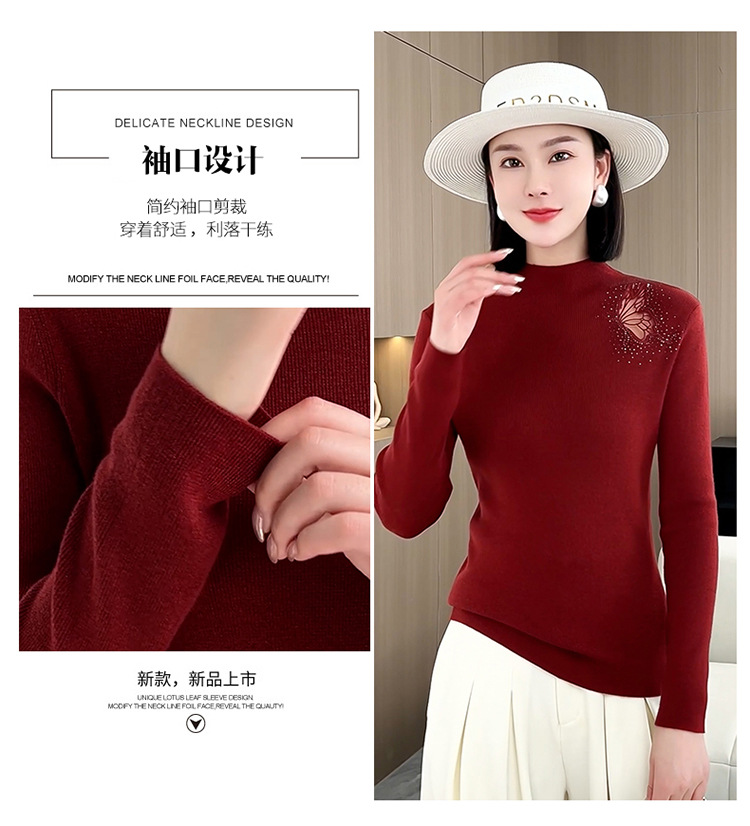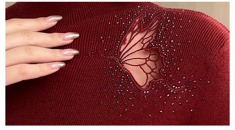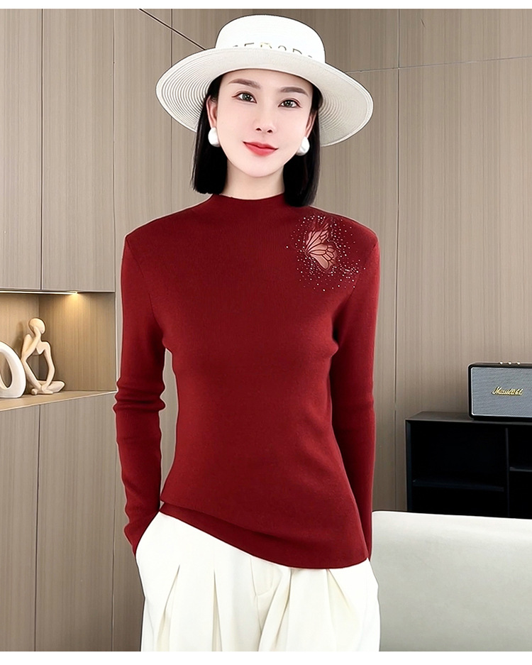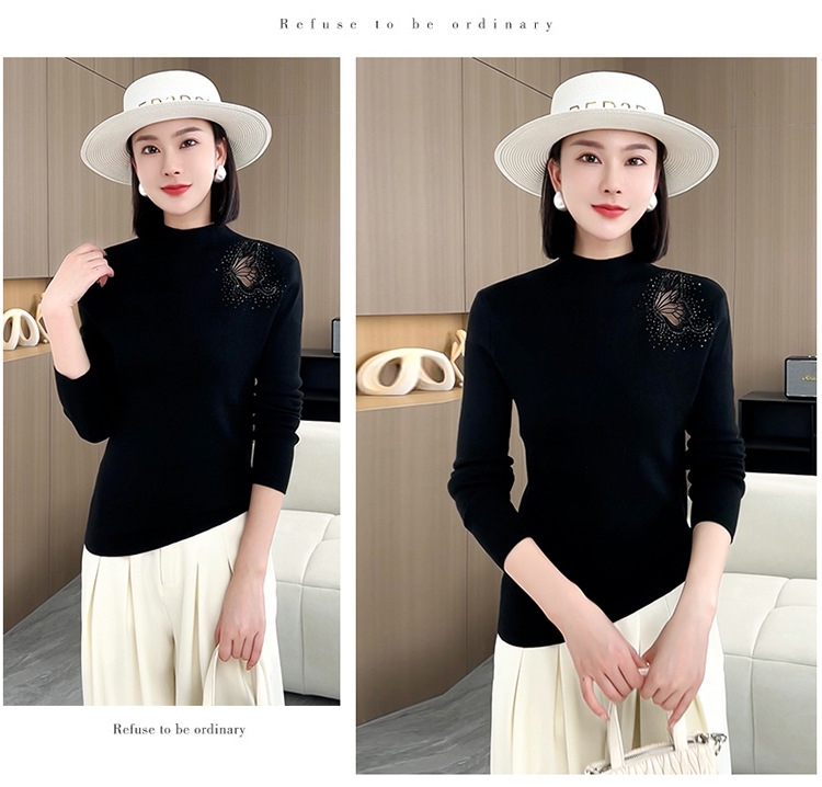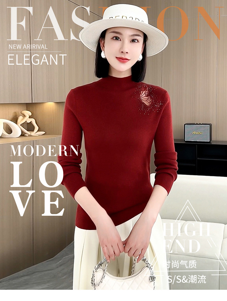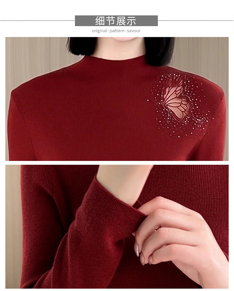 羊毛针织打底衫,洋气单肩纱网锈花针织衫QYM-LRX-HQDK752-Y