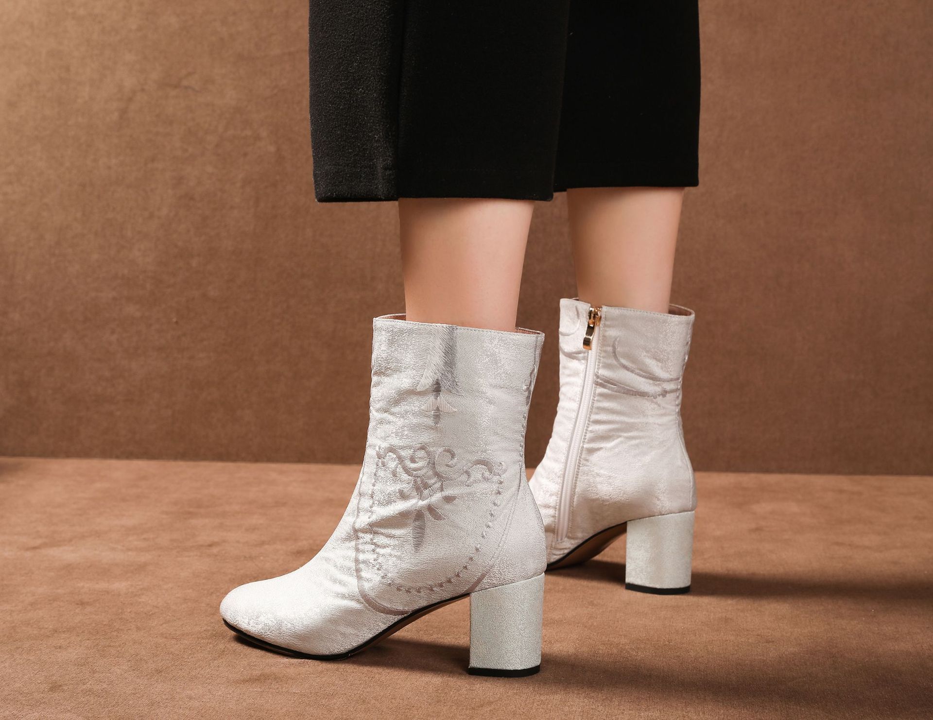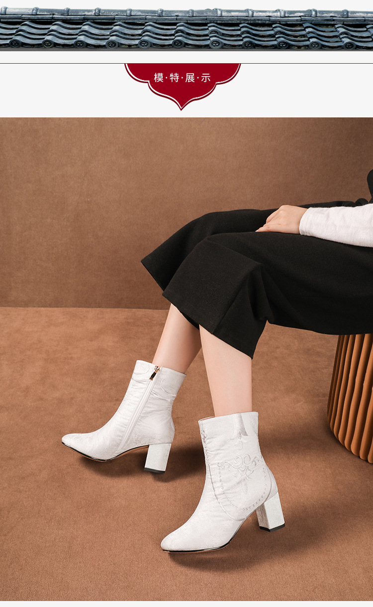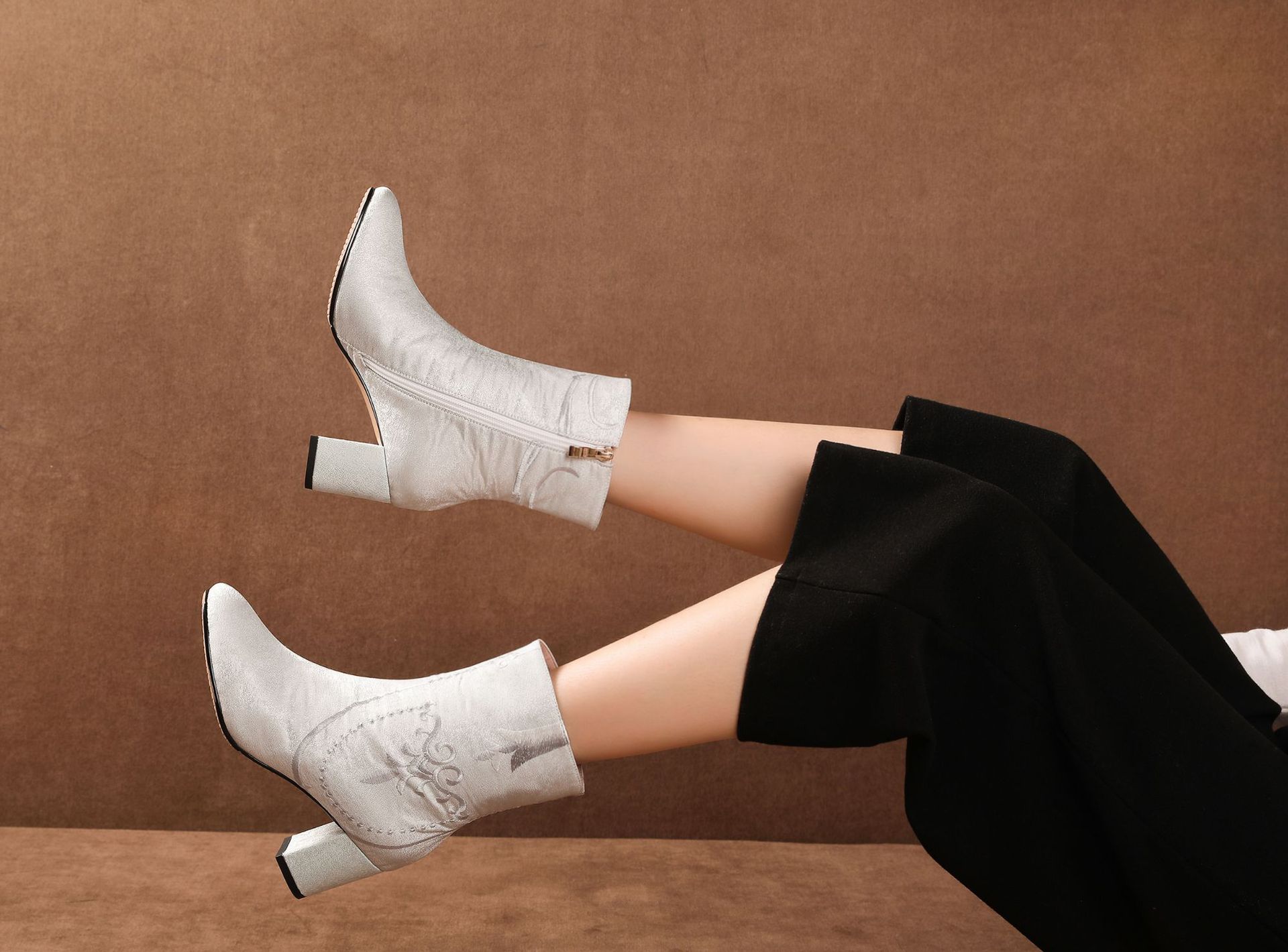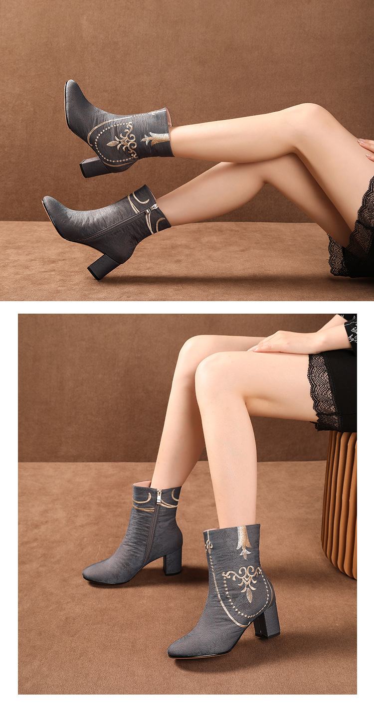 XY-388-2Y轻奢民族风马丁靴提花缎面短靴女粗跟百搭冬季加绒棉靴