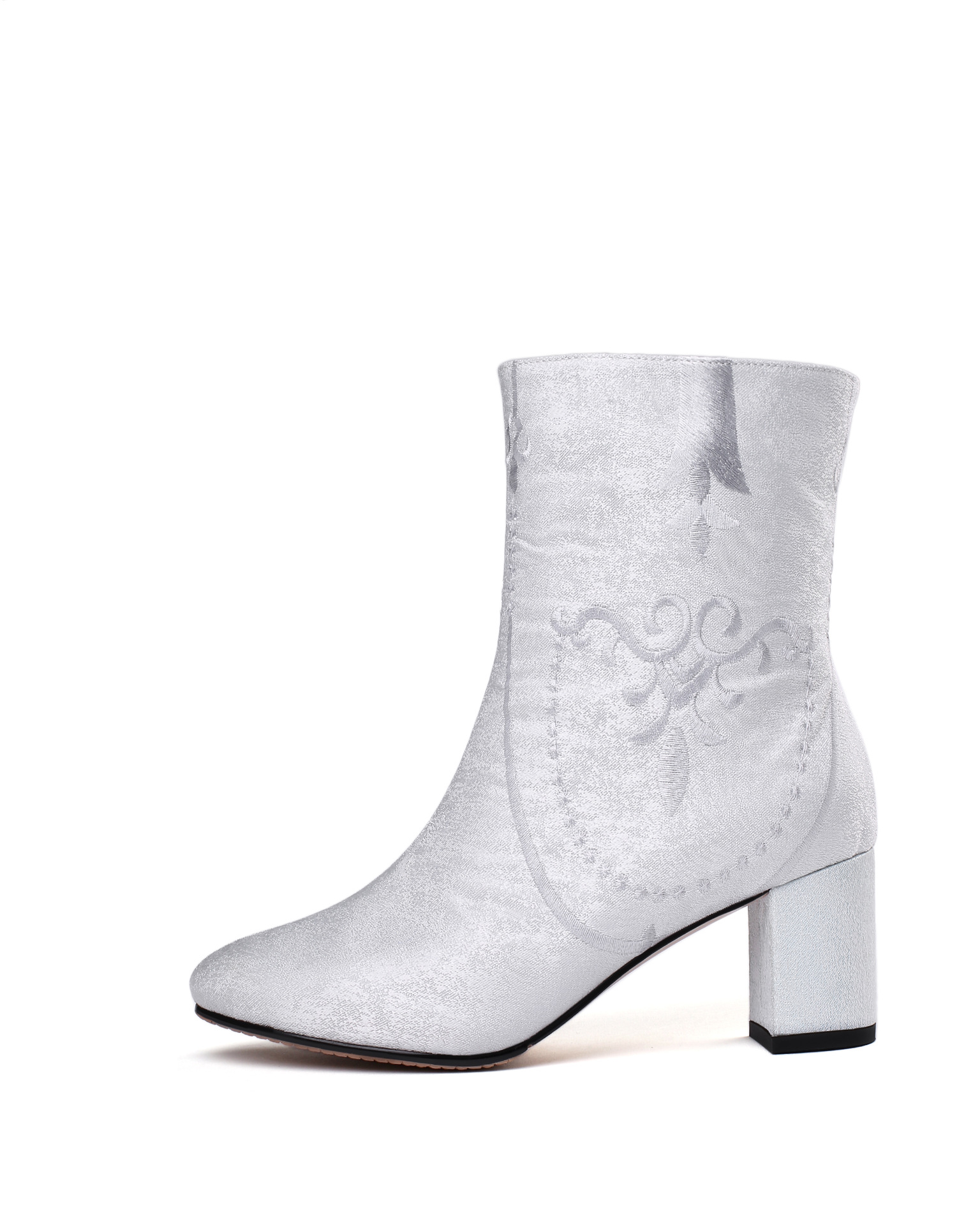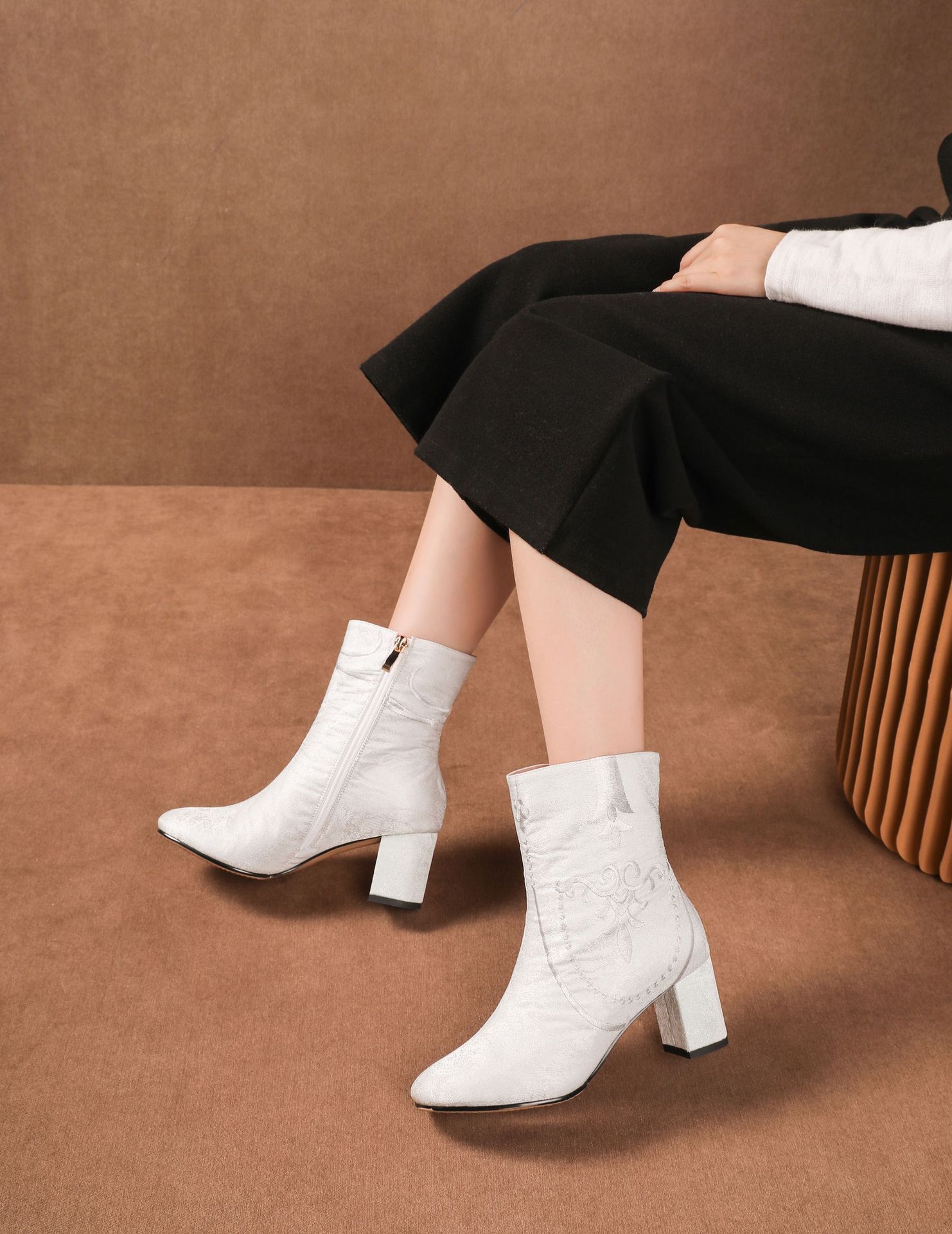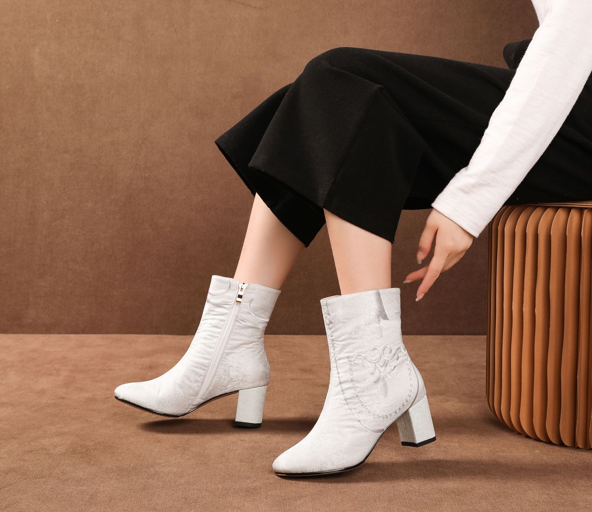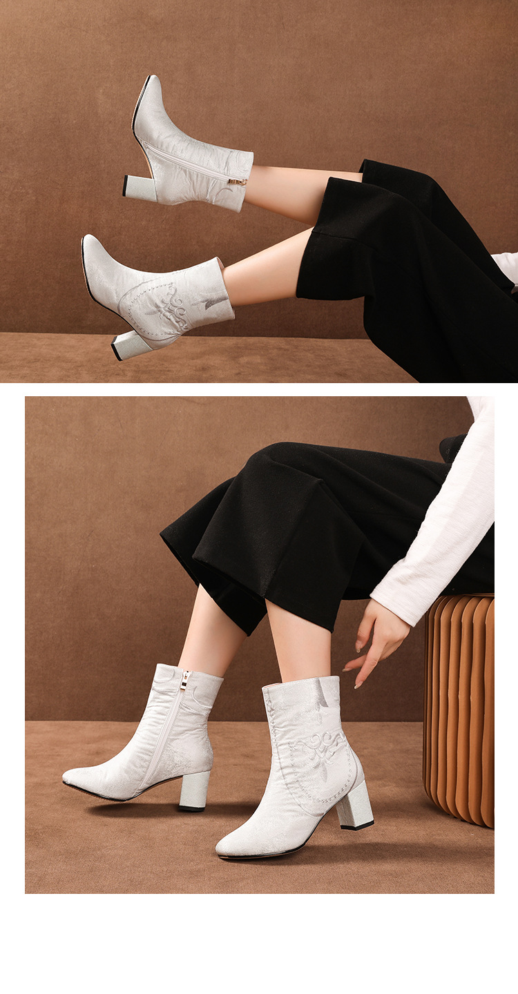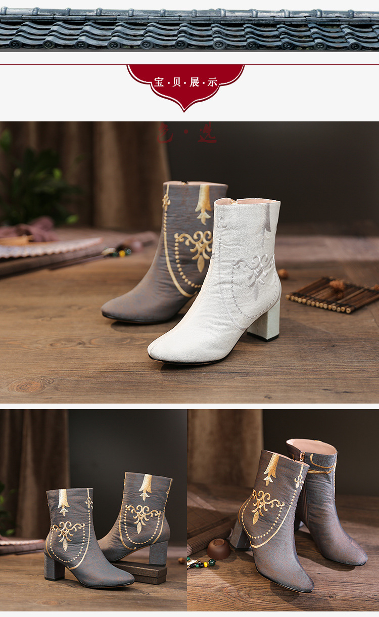 XY-388-2Y轻奢民族风马丁靴提花缎面短靴女粗跟百搭冬季加绒棉靴