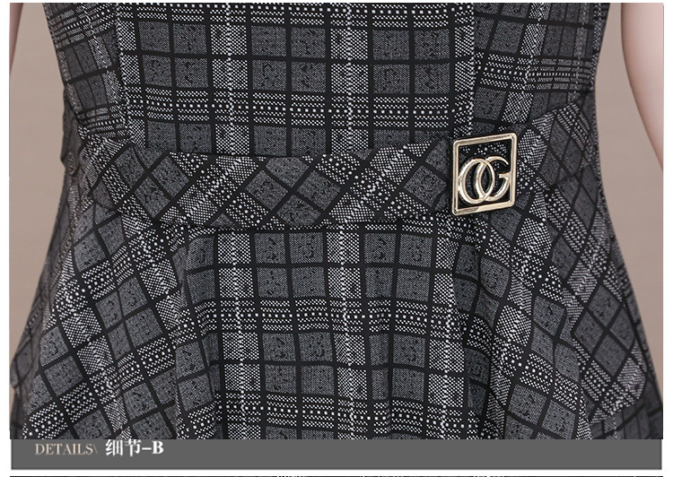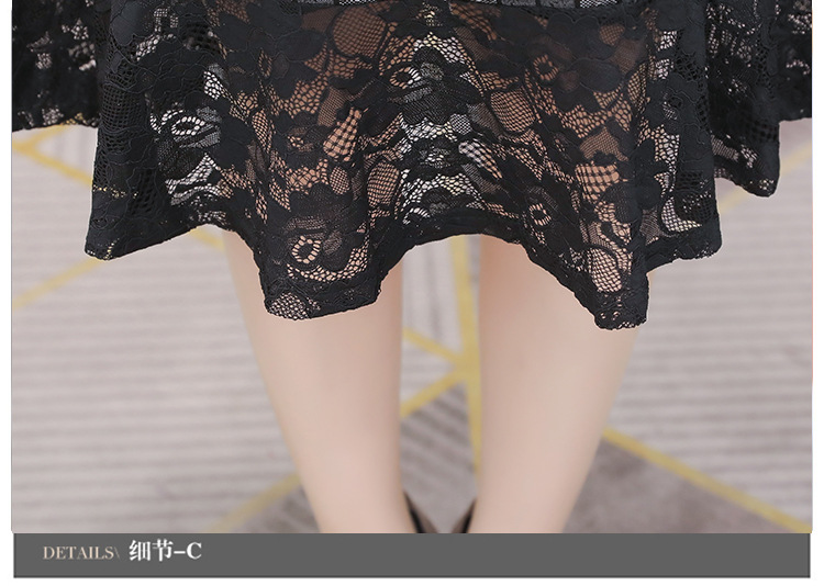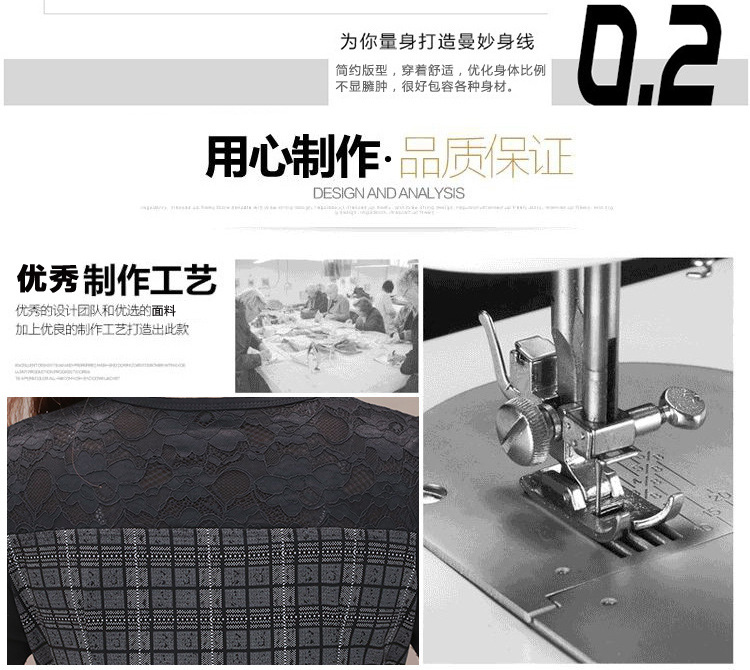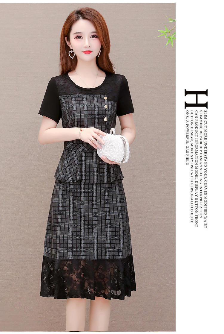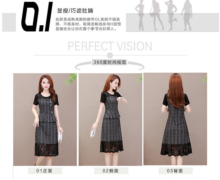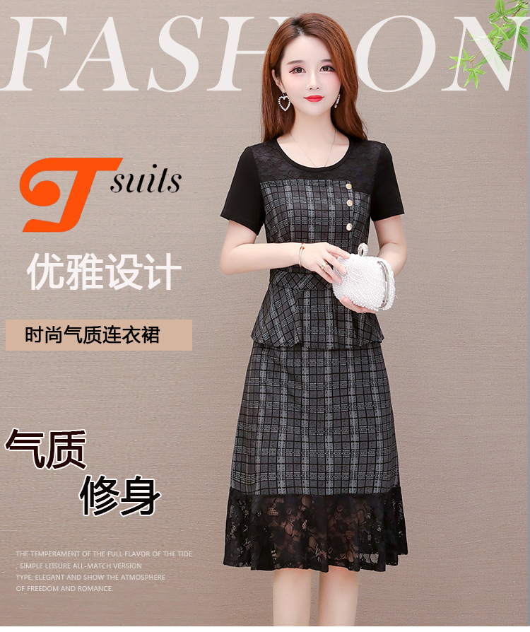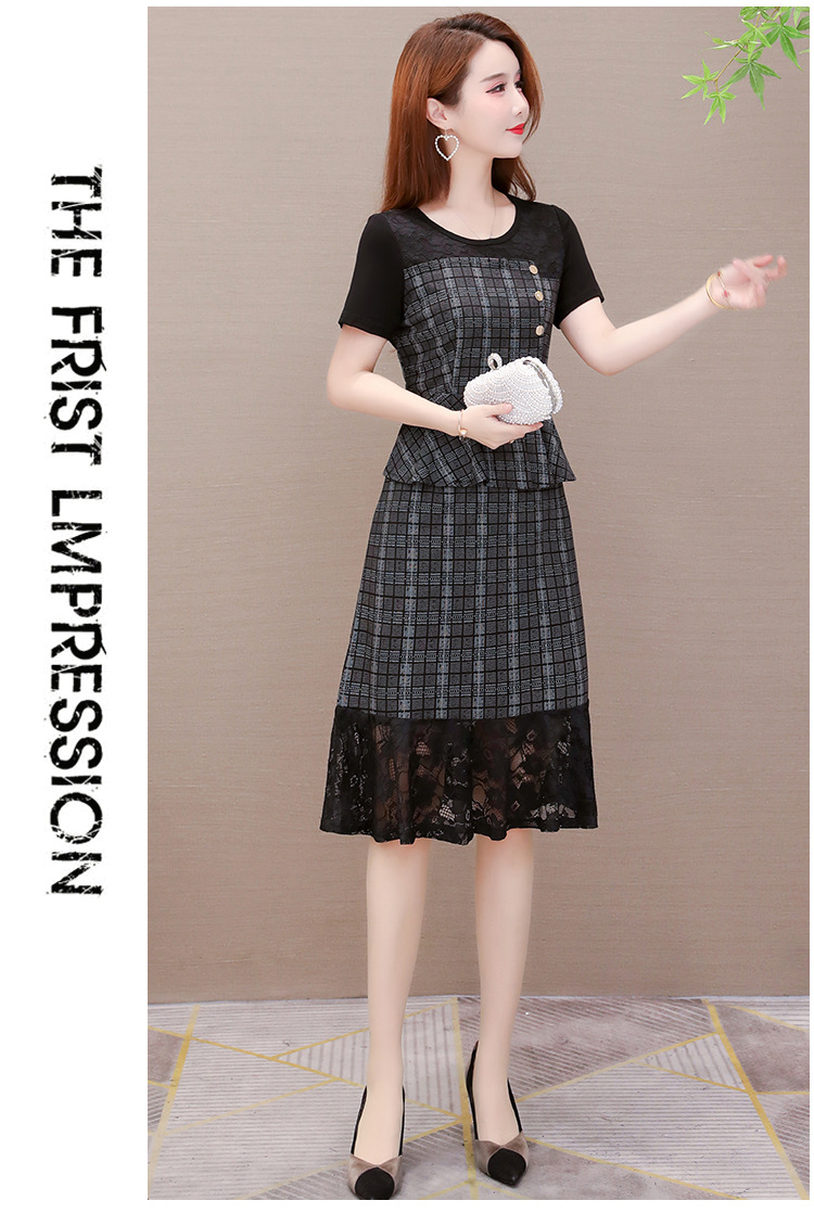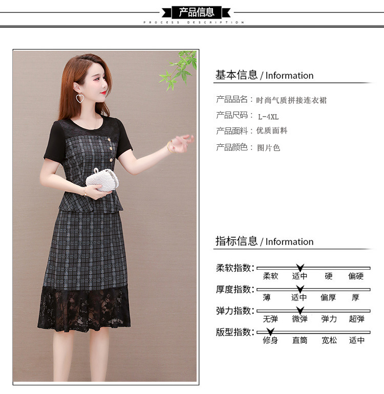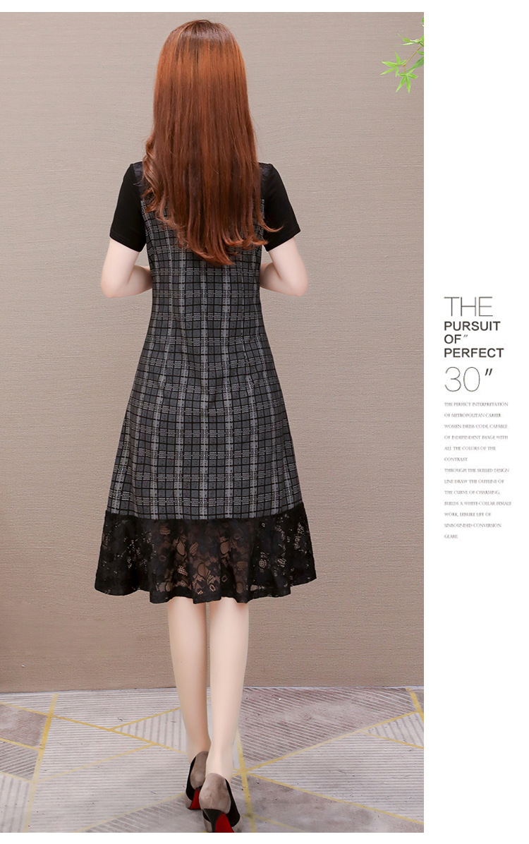 NSDN-格子新款修身小个子拼接洋气蕾丝短袖a字裙