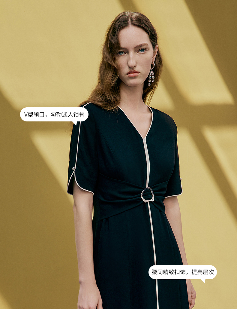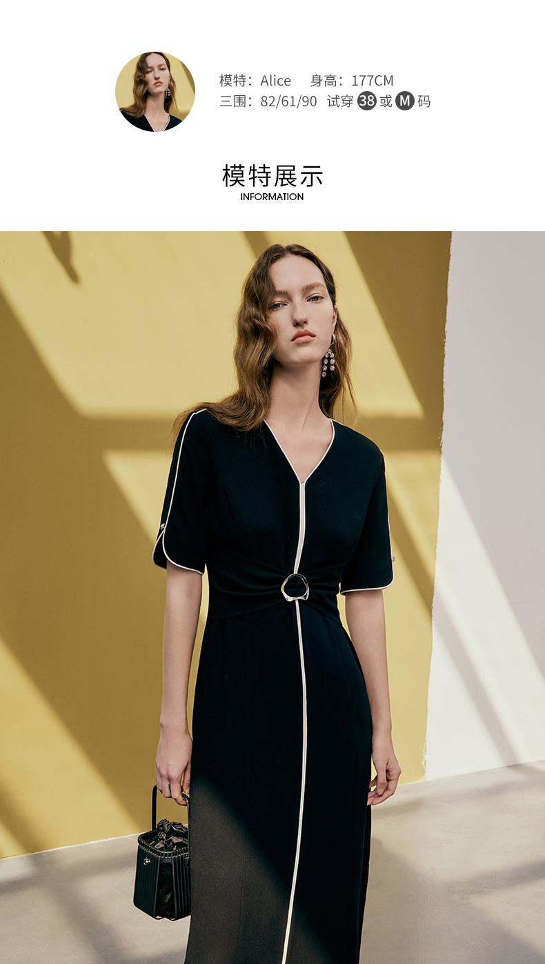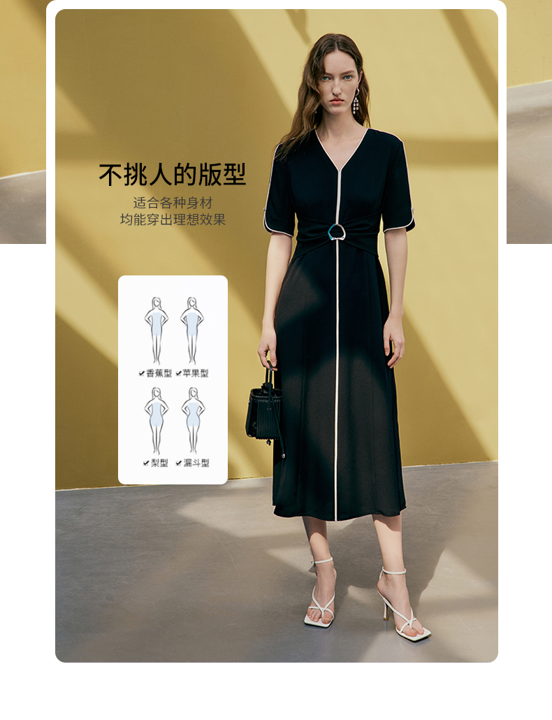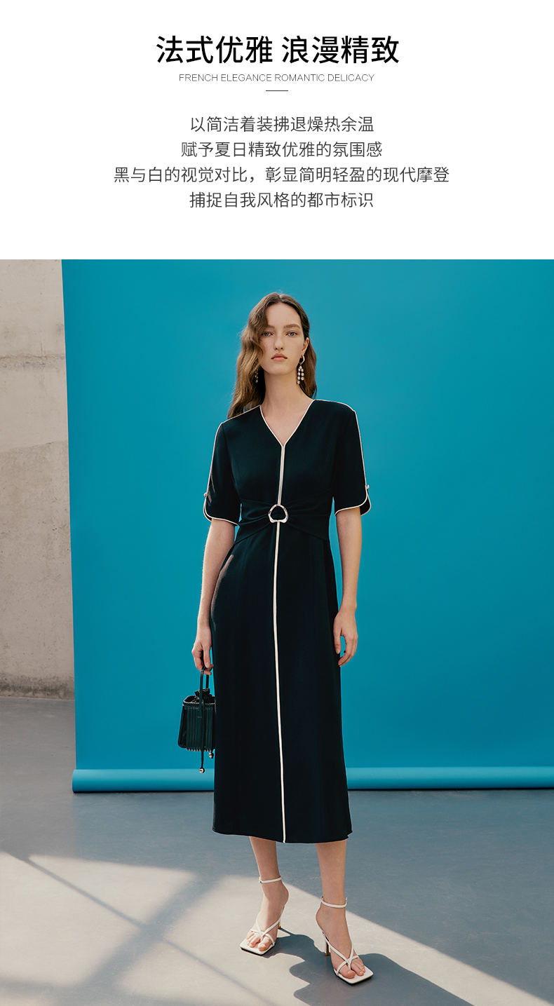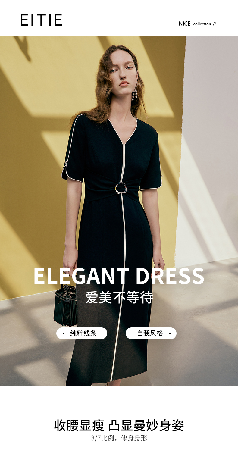 EITIE爱特爱夏季新款干练成熟V领高腰显瘦连衣裙7407108