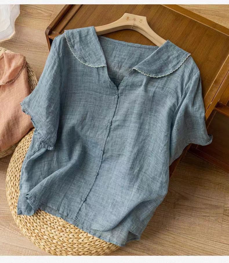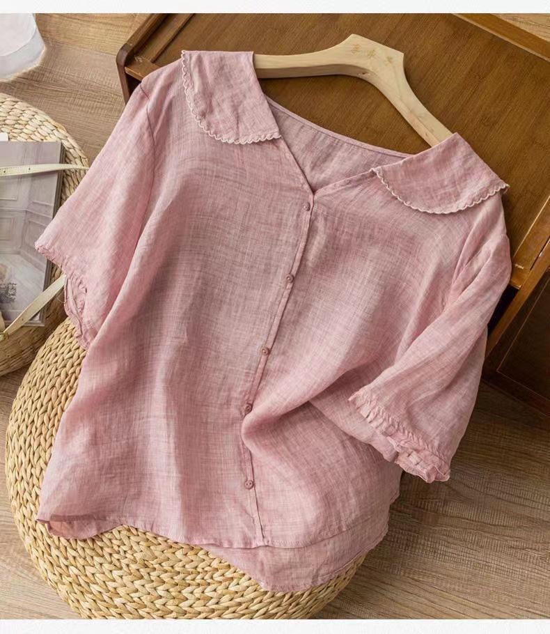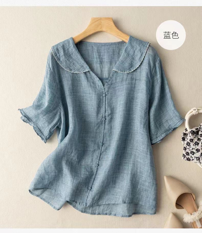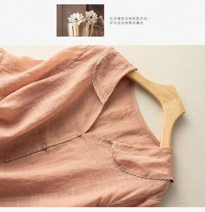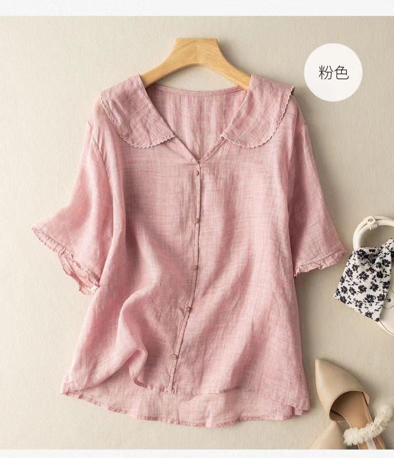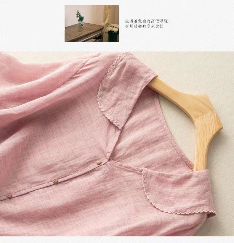 雀说夏季薄款棉麻文艺复古宽松显瘦娃娃领上衣T恤女AL6037