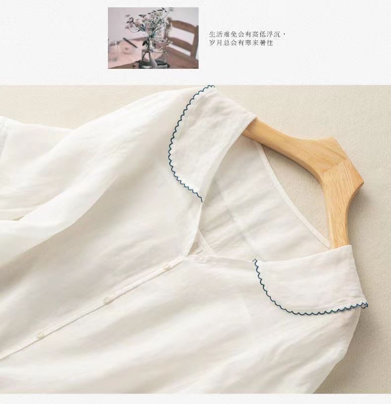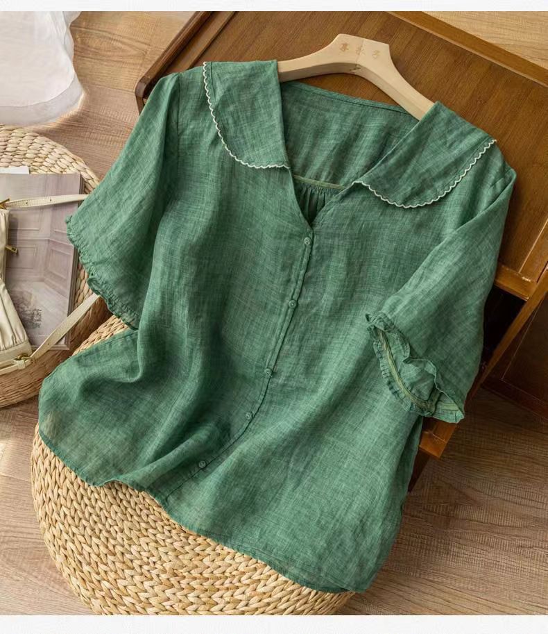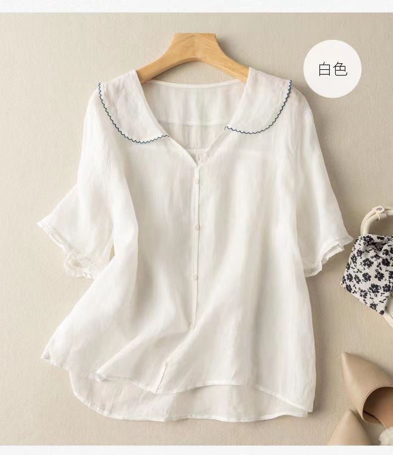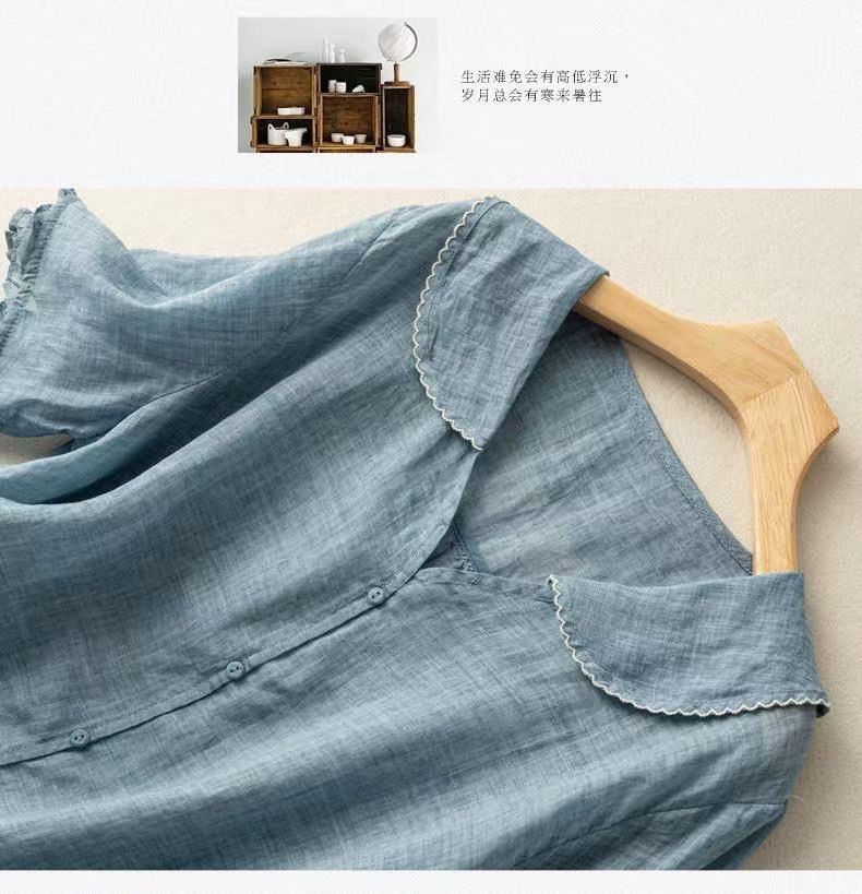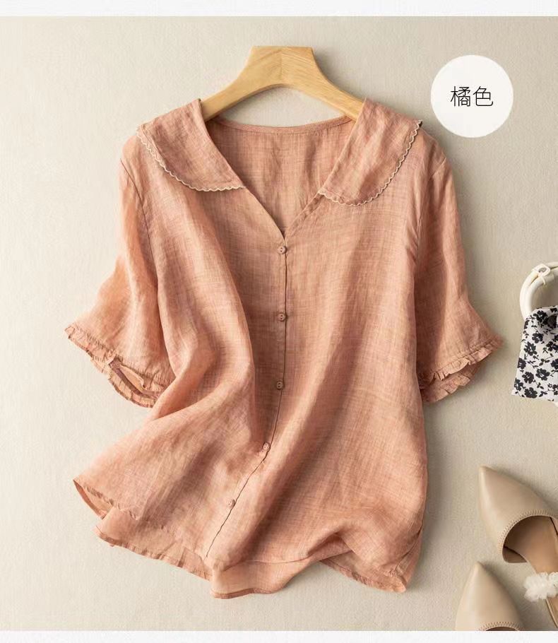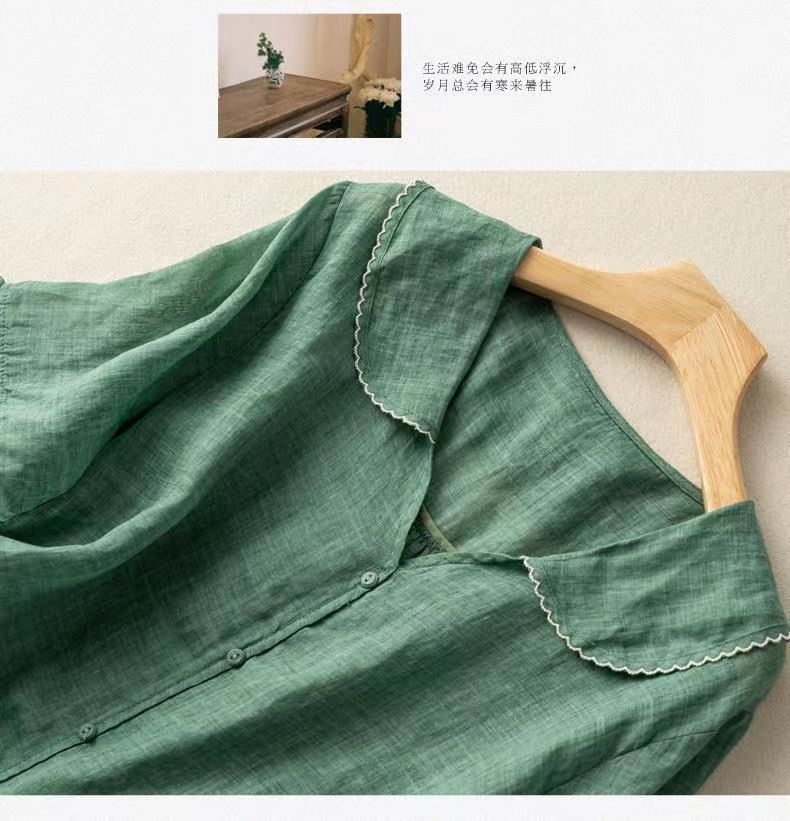 雀说夏季薄款棉麻文艺复古宽松显瘦娃娃领上衣T恤女AL6037