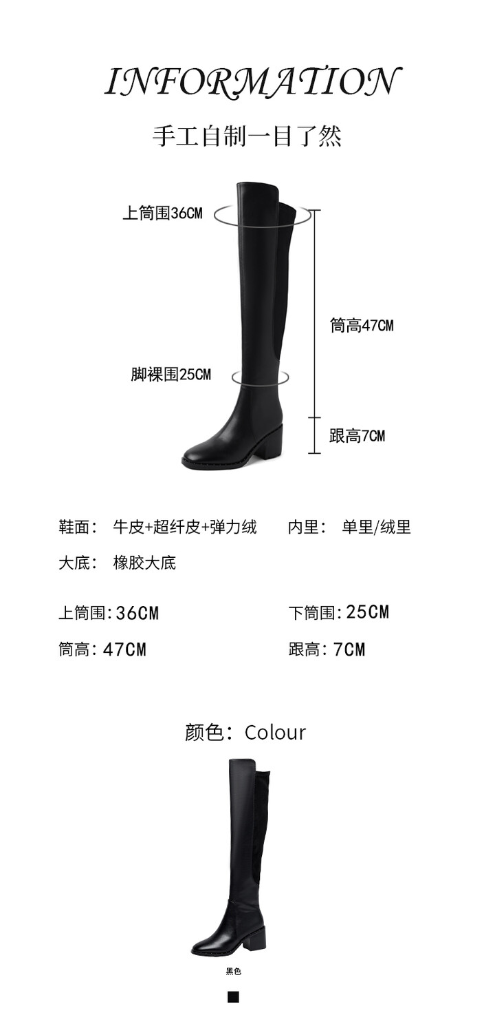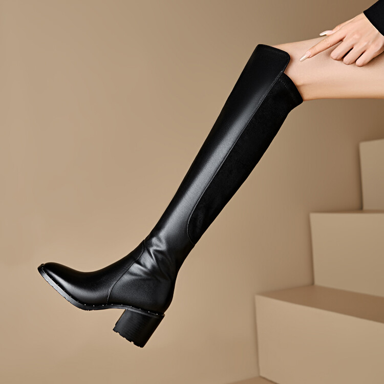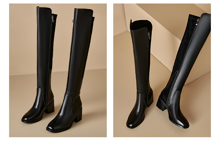 【预售5天】圆头粗跟长筒靴弹力靴骑士靴高筒靴过膝靴真皮侧拉链高跟新款铆钉MNLS&Z181