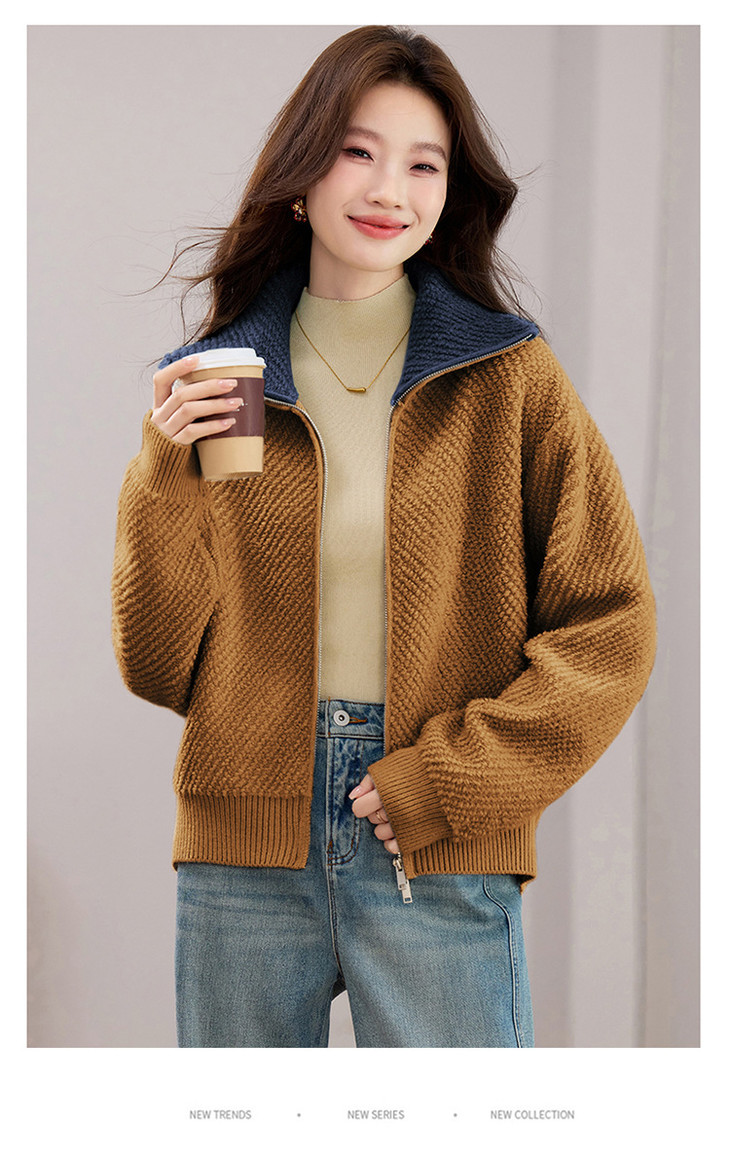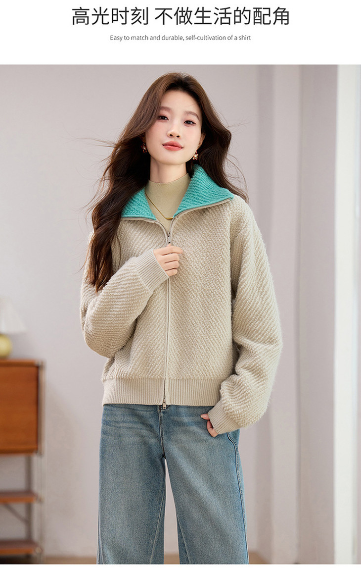 短外套撞色立领慵懒风开衫,休闲双拉链保暖毛衣外套CC-J-7038